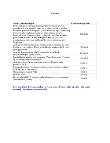 Cennik Analizy laboratoryjne Cena (netto)/próbka Pełna analiza profilu genetycznego drewna następujących gatunków drzew leśnych: sosna zwyczajna, świerk pospolity, modrzew japoński i europejski, jodła pospolita, dąb szypułkowy i bezszypułkowy, buk zwyczajny, olsza czarna, brzoza 200,00 zł brodawkowata, jesion wyniosły oraz grab pospolity, na cele procesowe Straży Leśnej, Policji i sądów (w tym: min. dwukrotne powtórzenie każdej próby oraz wydanie opinii biegłego) Analiza profilu genetycznego tkanek roślinnych (drewno, igły, liście), w tym: izolacja DNA, amplifikacja produktu PCR oraz 150,00 zł genotypowanie Analiza diagnostyczna qPCR patogenów w próbach 500,00 zł środowiskowych (gleba, woda) Identyfikacja lęgniowców z rodzaju Phytophthora sp. i Pythium 250,00 zł sp. w próbach środowiskowych Analiza polimorfizmu (genotypowanie) z dostarczonego 30,00 zł produktu PCR Sekwencjonowanie (z dostarczonego oczyszczonego produktu 50,00 zł PCR łącznie ze starterami) Oczyszczanie reakcji PCR 10,00 zł Izolacja DNA 50,00 zł Ocena jakości DNA (pomiar spektrofotometryczny w aparacie 5,00 zł NanoDrop ND-1000) Przy analizach drewna na cele procesowe straży leśnej, sądów i policji - dla analiz powyżej 10 prób cena do negocjacji.