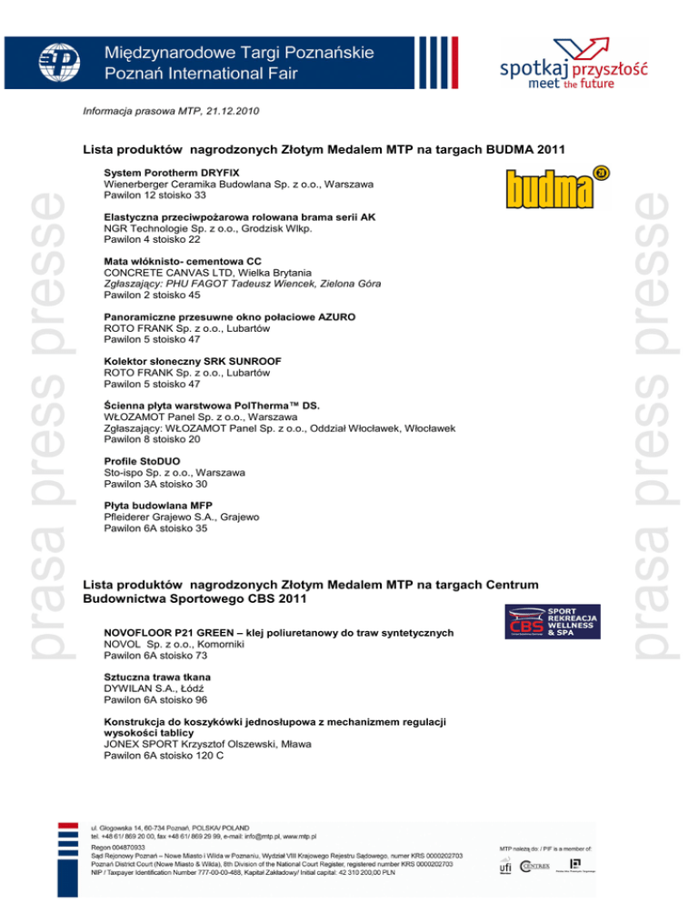 Informacja prasowa MTP, 21.12.2010 Lista produktów nagrodzonych Złotym Medalem MTP na targach BUDMA 2011 System Porotherm DRYFIX Wienerberger Ceramika Budowlana Sp. z o.o., Warszawa Pawilon 12 stoisko 33 Elastyczna przeciwpoŜarowa rolowana brama serii AK NGR Technologie Sp. z o.o., Grodzisk Wlkp. Pawilon 4 stoisko 22 Mata włóknisto- cementowa CC CONCRETE CANVAS LTD, Wielka Brytania Zgłaszający: PHU FAGOT Tadeusz Wiencek, Zielona Góra Pawilon 2 stoisko 45 Panoramiczne przesuwne okno połaciowe AZURO ROTO FRANK Sp. z o.o., Lubartów Pawilon 5 stoisko 47 Kolektor słoneczny SRK SUNROOF ROTO FRANK Sp. z o.o., Lubartów Pawilon 5 stoisko 47 Ścienna płyta warstwowa PolTherma™ DS. WŁOZAMOT Panel Sp. z o.o., Warszawa Zgłaszający: WŁOZAMOT Panel Sp. z o.o., Oddział Włocławek, Włocławek Pawilon 8 stoisko 20 Profile StoDUO Sto-ispo Sp. z o.o., Warszawa Pawilon 3A stoisko 30 Płyta budowlana MFP Pfleiderer Grajewo S.A., Grajewo Pawilon 6A stoisko 35 Lista produktów nagrodzonych Złotym Medalem MTP na targach Centrum Budownictwa Sportowego CBS 2011 NOVOFLOOR P21 GREEN – klej poliuretanowy do traw syntetycznych NOVOL Sp. z o.o., Komorniki Pawilon 6A stoisko 73 Sztuczna trawa tkana DYWILAN S.A., Łódź Pawilon 6A stoisko 96 Konstrukcja do koszykówki jednosłupowa z mechanizmem regulacji wysokości tablicy JONEX SPORT Krzysztof Olszewski, Mława Pawilon 6A stoisko 120 C