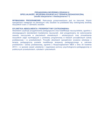 PEDAGOGIKA WCZESNEJ EDUKACJI SPECJALNOŚĆ: WCZESNA EDUKACJA Z TERAPIĄ PEDAGOGICZNĄ (studia stacjonarne i niestacjonarne I ⁰) WYMAGANIA PROGRAMOWE: Rekrutacja przeprowadzana jest na kierunek. Wybór specjalności następuje na pierwszym roku studiów na podstawie listy rankingowej średniej wszystkich ocen z I semestru studiów. SYLWETKA ABSOLWENTA I PERSPEKTYWY ZATRUDNIENIA: Absolwent uzyskuje przygotowanie pedagogiczne oraz kwalifikacje nauczycielskie, zgodnie z obowiązującymi standardami kształcenia nauczycieli. Jest przygotowany do wykonywania zawodu nauczyciela w placówkach oświatowych i edukacyjnych oraz prowadzenia wszystkich zajęć wynikających z podstawy programowej w klasach początkowych szkoły podstawowej i w przedszkolach. Ponadto absolwent specjalności wczesna edukacja z terapią pedagogiczną posiada kwalifikacje terapeuty pedagogicznego w zakresie przedszkola i szkoły podstawowej, zgodnie z Rozporządzeniem MEN z dnia 30 kwietnia 2013 r. w sprawie zasad udzielania i organizacji pomocy psychologiczno-pedagogicznej w publicznych przedszkolach, szkołach i placówkach.