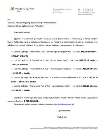 Do: Aplikanci Aplikacji Ogólnej, Sędziowskiej i Prokuratorskiej Krajowej Szkoły Sądownictwa i Prokuratury Szanowni Państwo Zgodnie z ustaleniami pomiędzy Krajową Szkołą Sądownictwa i Prokuratury a Firmą Wolters Kluwer Polska Sp. z o.o. z siedzibą w Warszawie, ul. Płocka 5 a, informujemy iŜ wszyscy słuchacze ww. szkoły mogą zakupić produkty firmy Wolters Kluwer Polska z następującymi Bonifikatami: • Lex dla Sędziego i Prokuratora DVD – aktualizacja dwutygodniowa – w cenie 888,00 zł netto – 1092,24 zł brutto • Lex dla Sędziego i Prokuratora on-line (wersja login+hasło) – w cenie 888,00 zł netto – 1092,24 zł brutto • Lex dla Sędziego i Prokuratora Plus DVD – aktualizacja miesięczna – w cenie 1050,00 zł netto – 1291,50 zł brutto • Lex dla Sędziego i Prokuratora Plus DVD – aktualizacja dwutygodniowa – w cenie 1290,00 zł netto – 1586,70 zł brutto • Lex dla Sędziego i Prokuratora Plus online – (wersja login+hasło) – w cenie 1050,00 zł netto – 1291,50 zł brutto Dodatkowe informacje dotyczące oferty Wydawnictwa Wolters Kluwer Polska moŜna uzyskać pod numerem telefonu 0 728 323 689. Zamówienia moŜna składać mailowo na adres [email protected] Z powaŜaniem Michał Kuć
