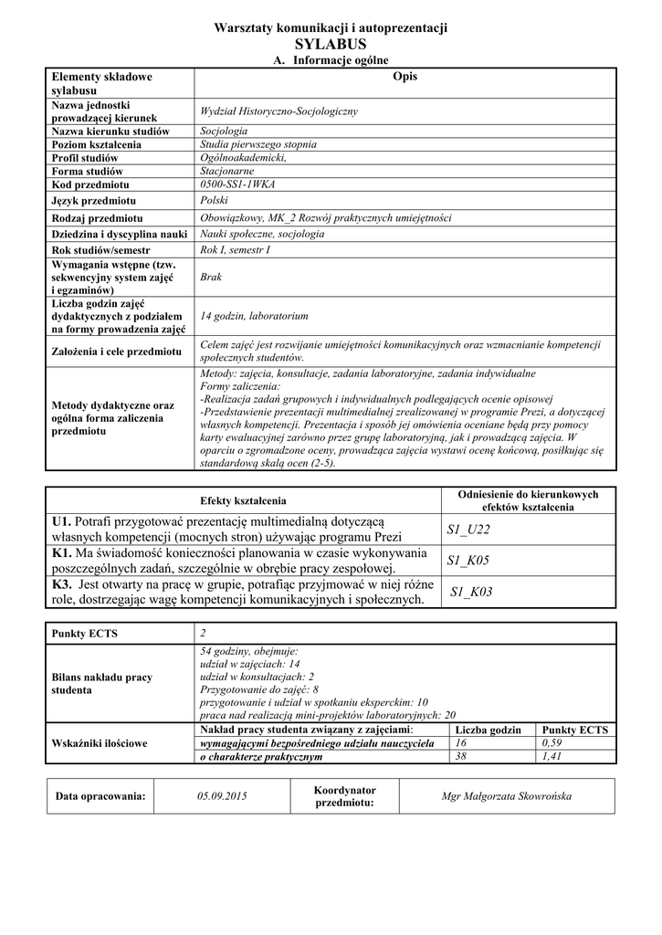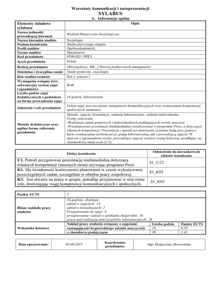 Warsztaty komunikacji i autoprezentacji SYLABUS A. Informacje ogólne Elementy składowe sylabusu Opis Nazwa jednostki prowadzącej kierunek Nazwa kierunku studiów Poziom kształcenia Profil studiów Forma studiów Kod przedmiotu Język przedmiotu Wydział Historyczno-Socjologiczny Rodzaj przedmiotu Dziedzina i dyscyplina nauki Rok studiów/semestr Wymagania wstępne (tzw. sekwencyjny system zajęć i egzaminów) Liczba godzin zajęć dydaktycznych z podziałem na formy prowadzenia zajęć Obowiązkowy, MK_2 Rozwój praktycznych umiejętności Nauki społeczne, socjologia Rok I, semestr I Założenia i cele przedmiotu Metody dydaktyczne oraz ogólna forma zaliczenia przedmiotu Socjologia Studia pierwszego stopnia Ogólnoakademicki, Stacjonarne 0500-SS1-1WKA Polski Brak 14 godzin, laboratorium Celem zajęć jest rozwijanie umiejętności komunikacyjnych oraz wzmacnianie kompetencji społecznych studentów. Metody: zajęcia, konsultacje, zadania laboratoryjne, zadania indywidualne Formy zaliczenia: -Realizacja zadań grupowych i indywidualnych podlegających ocenie opisowej -Przedstawienie prezentacji multimedialnej zrealizowanej w programie Prezi, a dotyczącej własnych kompetencji. Prezentacja i sposób jej omówienia oceniane będą przy pomocy karty ewaluacyjnej zarówno przez grupę laboratoryjną, jak i prowadzącą zajęcia. W oparciu o zgromadzone oceny, prowadząca zajęcia wystawi ocenę końcową, posiłkując się standardową skalą ocen (2-5). Odniesienie do kierunkowych efektów kształcenia Efekty kształcenia U1. Potrafi przygotować prezentację multimedialną dotyczącą własnych kompetencji (mocnych stron) używając programu Prezi K1. Ma świadomość konieczności planowania w czasie wykonywania poszczególnych zadań, szczególnie w obrębie pracy zespołowej. K3. Jest otwarty na pracę w grupie, potrafiąc przyjmować w niej różne role, dostrzegając wagę kompetencji komunikacyjnych i społecznych. Punkty ECTS Bilans nakładu pracy studenta Wskaźniki ilościowe Data opracowania: S1_U22 S1_K05 S1_K03 2 54 godziny, obejmuje: udział w zajęciach: 14 udział w konsultacjach: 2 Przygotowanie do zajęć: 8 przygotowanie i udział w spotkaniu eksperckim: 10 praca nad realizacją mini-projektów laboratoryjnych: 20 Nakład pracy studenta związany z zajęciami: Liczba godzin 16 wymagającymi bezpośredniego udziału nauczyciela 38 o charakterze praktycznym 05.09.2015 Koordynator przedmiotu: Punkty ECTS 0,59 1,41 Mgr Małgorzata Skowrońska SYLABUS B. Informacje szczegółowe Elementy składowe sylabusu Nazwa przedmiotu Kod przedmiotu Nazwa kierunku Nazwa jednostki prowadzącej kierunek Język przedmiotu Opis Warsztaty komunikacji i autoprezentacji 0500-SS1-1WKA Socjologia Wydział Historyczno-Socjologiczny Polski I rok I stopnia semestr zimowy Rok studiów/ semestr 14 h laboratorium Liczba godzin zajęć dydaktycznych Praca grupowa, warsztatowa, oraz forma prowadzenia zajęć 2 Liczba punktów ECTS Mgr Małgorzata Skowrońska Prowadzący 1. Komunikacja i autoprezentacja – wprowadzenie Treści merytoryczne 2. O wywieraniu wrażenia na innych – sztuka autoprezentacji przedmiotu Efekty kształcenia wraz ze sposobem ich weryfikacji Forma i warunki zaliczenia przedmiotu Wykaz literatury podstawowej i uzupełniającej 3. Techniki perswazyjne – jak, o czym i do kogo mówimy 4. Style komunikacyjne, a atrakcyjność interpersonalna i osiąganie celów 5. Debata publiczna i wizerunek, a komunikacja Ocena U1. Potrafi przygotować prezentację multimedialną prezentacji. dotyczącą własnych kompetencji (mocnych stron) używając programu Prezi K1. Ma świadomość konieczności planowania w czasie wykonywania poszczególnych zadań, szczególnie w obrębie pracy zespołowej. K3. Jest otwarty na pracę w grupie, potrafiąc przyjmować w niej różne role, dostrzegając wagę kompetencji komunikacyjnych i społecznych. Ocena zadań grupowych Ocena zadań grupowych, Na całościową ocenę warsztatów składają się: Przygotowanie i omówienie prezentacji multimedialnej zrealizowanej w programie Prezi, oceniane będą przy pomocy karty ewaluacyjnej zarówno przez grupę laboratoryjną, jak i prowadzącą zajęcia. W oparciu o zgromadzone oceny, prowadząca zajęcia wystawi ocenę końcową, posiłkując się standardową skalą ocen (2-5). Zrealizowanie zadań grupowych i indywidualnych w wyznaczonych terminach. Zadania będą oceniane w skali zal/nzal. Zaliczenie przedmiotu możliwe jest tylko wtedy, gdy student(ka) zaliczy wszystkie zadania indywidualne i grupowe. Obecność na zajęciach. Student(ka) ma możliwość opuszczenia jednych zajęć. Opuszczenie większej liczby zajęć będzie skutkować obniżeniem oceny końcowej. Nieobecność na więcej niż 3 zajęciach skutkuje niezaliczeniem przedmiotu. M.Leary, Wywieranie wrażenia na innych. O sztuce autoprezentacji, GWP, Gdańsk 1999, s. 14- 51[ rozdz. 1: wprowadzenie, rozdz. 2: taktyki]. J. Stewart, Mosty zamiast murów, PWN, Warszawa 2000 E. Aronson, T. D. Wilson, R. M. Alert, Psychologia społeczna. Serce i umysł, Wyd. Zysk i S-ka, Poznań 1997, S. 402-430. [rozdz. 10: Atrakcyjność interpersonalna: od pierwszego wrażenia do związków uczuciowych] R. D. Cialdini, Wywieranie wpływu na ludzi. Teoria i praktyka, GWP, Gdańsk 2009, s.185-223 [ rozdz. 5: Lubienie i sympatia]. R. B. Adler, L. B. Rosenfeld, R. F. Proctor, Relacje interpersonalne. Proces porozumiewania się, Dom Wydawniczy Rebis, Poznań 2006, s. 252- 286 [rozdz. 8: Dynamika relacji interpersonalnych] Forma czy treść? Rzecz o wizerunku w życiu społecznym i politycznym,A.KasińskaMetryka, P.Olszewski(red.),Wyd.A.Marszałek, Toruń 2012. Wystąpienia publiczne. Kontakty z mediami i spotkania. Podręcznik dla osób reprezentujących instytucje i organizacje, S.Kordasiewicz,T.Ołdak (red.),Centrum zasobów ludzkich, Warszawa 2014. C.Hamilton, Skuteczna komunikacja w biznesie, PWN, Warszawa 2011. ………………………………. podpis osoby s