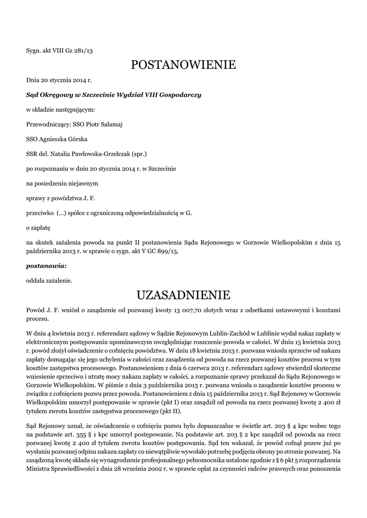Sygn. akt VIII Gz 281/13 POSTANOWIENIE Dnia 20 stycznia 2014 r. Sąd Okręgowy w Szczecinie Wydział VIII Gospodarczy w składzie następującym: Przewodniczący: SSO Piotr Sałamaj SSO Agnieszka Górska SSR del. Natalia Pawłowska-Grzelczak (spr.) po rozpoznaniu w dniu 20 stycznia 2014 r. w Szczecinie na posiedzeniu niejawnym sprawy z powództwa J. F. przeciwko (...) spółce z ograniczoną odpowiedzialnością w G. o zapłatę na skutek zażalenia powoda na punkt II postanowienia Sądu Rejonowego w Gorzowie Wielkopolskim z dnia 15 października 2013 r. w sprawie o sygn. akt V GC 899/13, postanawia: oddala zażalenie. UZASADNIENIE Powód J. F. wniósł o zasądzenie od pozwanej kwoty 13 007,70 złotych wraz z odsetkami ustawowymi i kosztami procesu. W dniu 4 kwietnia 2013 r. referendarz sądowy w Sądzie Rejonowym Lublin-Zachód w Lublinie wydał nakaz zapłaty w elektronicznym postępowaniu upominawczym uwzględniając roszczenie powoda w całości. W dniu 15 kwietnia 2013 r. powód złożył oświadczenie o cofnięciu powództwa. W dniu 18 kwietnia 2013 r. pozwana wniosła sprzeciw od nakazu zapłaty domagając się jego uchylenia w całości oraz zasądzenia od powoda na rzecz pozwanej kosztów procesu w tym kosztów zastępstwa procesowego. Postanowieniem z dnia 6 czerwca 2013 r. referendarz sądowy stwierdził skuteczne wniesienie sprzeciwu i utratę mocy nakazu zapłaty w całości, a rozpoznanie sprawy przekazał do Sądu Rejonowego w Gorzowie Wielkopolskim. W piśmie z dnia 3 października 2013 r. pozwana wniosła o zasądzenie kosztów procesu w związku z cofnięciem pozwu przez powoda. Postanowieniem z dnia 15 października 2013 r. Sąd Rejonowy w Gorzowie Wielkopolskim umorzył postępowanie w sprawie (pkt I) oraz zasądził od powoda na rzecz pozwanej kwotę 2 400 zł tytułem zwrotu kosztów zastępstwa procesowego (pkt II). Sąd Rejonowy uznał, że oświadczenie o cofnięciu pozwu było dopuszczalne w świetle art. 203 § 4 kpc wobec tego na podstawie art. 355 § 1 kpc umorzył postępowanie. Na podstawie art. 203 § 2 kpc zasądził od powoda na rzecz pozwanej kwotę 2 400 zł tytułem zwrotu kosztów postępowania. Sąd ten wskazał, że powód cofnął pozew już po wysłaniu pozwanej odpisu nakazu zapłaty co niewątpliwie wywołało potrzebę podjęcia obrony po stronie pozwanej. Na zasądzoną kwotę składa się wynagrodzenie profesjonalnego pełnomocnika ustalone zgodnie z § 6 pkt 5 rozporządzenia Ministra Sprawiedliwości z dnia 28 września 2002 r. w sprawie opłat za czynności radców prawnych oraz ponoszenia przez Skarb Państwa kosztów pomocy prawnej udzielonej przez radcę prawnego ustanowionego z urzędu. W piśmie z dnia 12 listopada 2013 r. powód złożył zażalenie na pkt II powyższego orzeczenia zarzucając naruszenie art. 102 kpc i wnosząc o jego zmianę poprzez oddalenie wniosku pozwanej o zasądzenie kosztów zastępstwa procesowego względnie zasądzenie tych kosztów w wysokości ¼ stawki tj. 600 zł, ewentualnie uchylenie postanowienia w tym zakresie i skierowanie sprawy do ponownego rozpoznania przez Sąd I instancji. W uzasadnieniu powód wyjaśnił, że omyłkowo skierował pozew przeciwko pozwanej spółce gdyż jej firma jest identyczna z firmą osoby fizycznej, która prowadzi działalność gospodarczą w G. – faktycznym dłużnikiem powoda. Natychmiast po wykryciu omyłki odbył rozmowę telefoniczną z prezesem zarządu pozwanej spółki (...) i cofnął pozew, o czym poinformował pozwaną telefonując ale i przesyłając mu odpis pisma o cofnięciu pozwu na wskazany adres mailowy. Prezes zarządu pozwanej przyjął te wyjaśnienia i oznajmił, że uważa sprawę za zamkniętą. Cofnięcie pozwu miało więc miejsce jeszcze przed wniesieniem przez pozwaną sprzeciwu. Dodatkowo powód wskazał, że pełnomocnik pozwanej ustanowiła w niniejszej sprawie komunikację elektroniczną, a zatem z pewnością zapoznała się ze stanem sprawy, w tym faktem cofnięcia pozwu. Musiała mieć także wiedzę od prezesa zarządu pozwanej o przekazanym stanowisku, iż sprawę uważa za załatwioną. Cofnięcie pozwu i poinformowanie o tym pozwanej wraz z wyjaśnieniem nastąpiło w tym samym dniu, w którym sąd doręczył pozwanej nakaz zapłaty. Ponadto powód wskazał, że nakład pracy pełnomocnika pozwanej był niewielki, gdyż ograniczył się od zalogowania na stronę sądu i wpisania kilku zdań z prostym zaprzeczeniem roszczeniu. Wobec wyjaśnień pełnomocnika powoda oraz podjętych czynnościach oczywistym było, że roszczenie powoda jest niezasadne a sprawa nie była skomplikowana. W ocenie powoda w niniejszej sprawie zachodzą przesłanki pozwalające zastosować przepis art. 102 kpc. Sąd Okręgowy zważył co następuje: Zażalenie zasługiwało na uwzględnienie w części. Zasadą w procesie cywilnym jest, że strona przegrywająca sprawę obowiązana jest zwrócić przeciwnikowi na jego żądanie koszty niezbędne do celowego dochodzenia praw i celowej obrony (art. 98 § 1 kpc). Na podstawie art. 102 kpc w wypadkach szczególnie uzasadnionych sąd może zasądzić od strony przegrywającej część kosztów procesu albo nie obciążać jej kosztami w ogóle. Przepis art. 102 kpc jako szczególny nie podlega wykładni rozszerzającej. Przywołany przepis, realizujący zasadę słuszności, stanowi wyjątek od ogólnej reguły obciążania stron kosztami procesu, zgodnie z którą strona przegrywająca sprawę jest zobowiązana zwrócić przeciwnikowi, na jego żądanie, wszystkie koszty niezbędne do celowego dochodzenia praw i celowej obrony (art. 98 § 1 kpc) - tzw. zasada odpowiedzialności za wynik procesu. Hipoteza przepisu art. 102 kpc, odwołująca się do występowania „wypadków szczególnie uzasadnionych", pozostawia sądowi orzekającemu swobodę oceny, czy fakty związane z przebiegiem procesu, jak i dotyczące sytuacji życiowej strony, stanowią podstawę do nie obciążania jej kosztami procesu (por. posta