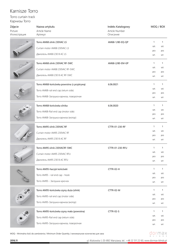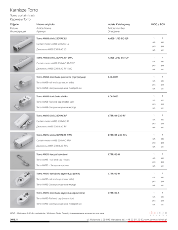 Karnisze Torro Torro curtain track Карнизы Torro Zdjęcie Nazwa artykułu Indeks Katalogowy Picture Иллюстрация Article Name Артикул Article Number Описание Torro AM68 silnik 230VAC LS AM68-1/80-EQ-QP Curtain motor AM68 230VAC LS Двигатель AM68 230 В AC LS Torro AM68 silnik 230VAC RF-5WC AM68-2/80-EM-GP Curtain motor AM68 230VAC RF-5WC Двигатель AM68 230 В AC RF-5WC Torro AM68-końcówka powrotna (z przykrywą) 6.06.0021 Torro AM68-rail end cap (return side) Torro AM68-Заглушка карниза, поворотная Torro AM68-końcówka silnika 6.06.0020 Torro AM68-Rail end cap (motor side) Torro AM68-Заглушка карниза (мотор) Torro AM95 silnik 230VAC RF CTTR-01-230-RF Curtain motor AM95 230VAC RF Двигатель AM95 230 В AC RF Torro AM95 silnik 230VACRF-5WC CTTR-01-230-RFU Curtain motor AM95 230VAC RFU Двигатель AM95 230 В AC RFU Torro AM95-haczyk końcówki CTTR-02-H Torro AM95 - rail end cap - hook Torro AM95 - Заглушка-крючок Torro AM95-końcówka szyny duża (silnik) CTTR-02-M Torro AM95-rail end cap (motor side) Torro AM95-Заглушка карниза (мотор) Torro AM95-końcówka szyny mała (powrotna) CTTR-02-S Torro AM95-Rail end cap (return side) Torro AM95-Заглушка карниза, поворотная MOQ / BOX 1 1 szt. szt. pcs pcs шт. шт. 1 1 szt. szt. pcs pcs шт. шт. 1 1 szt. szt. pcs pcs шт. шт. 1 1 szt. szt. pcs pcs шт. шт. 1 1 szt. szt. pcs pcs шт. шт. 1 1 szt. szt. pcs pcs шт. шт. 1 1 szt. szt. pcs pcs шт. шт. 1 1 szt. szt. pcs pcs шт. шт. 1 1 szt. szt. pcs pcs шт. шт. MOQ - Minimalna ilość do zamówienia / Minimum Order Quantity / минимальное количество для зака 2016.11 ul. Klukowska 1, 03-892 Warszawa, tel.: +48 22 511 22 60, www.dormax-blinds.pl Karnisze Torro Torro curtain track Карнизы Torro Zdjęcie Nazwa artykułu Indeks Katalogowy Picture Иллюстрация Article Name Артикул Article Number Описание Torro Łącznik szyny HD CTTR-03-HD Rail connector HD Соединитель карниза HD Torro Pasek napędu 11mm (100m) CTTR-04-100-11 Drive belt 11mm (100m) Ремень привода 11 мм (100 м) Torro Szyna biała (4,5m) CTTR-03-450-W Curtain rail white (4,5m) Карниз, белый (4,5 м) Torro Szyna biała (5,2m) CTTR-03-520-W Curtain rail white (5,2m) Карниз, белый (5,2 м) Torro Szyna biała (5.8m) CTTR-03-580-W Curtain rail white (5,8m) Карниз, белый (7 м) Torro Szyna biała (7m) CTTR-03-700-W Curtain rail white (7m) Карниз, белый (7 м) Torro Szyna surowa (7m) CTTR-03-700-U Curtain rail mill finish (7m) Карниз, необработ. (7 м) Torro Ślizgacz z rolkami (oczko obrot.) CTTR-06 Glider with rolls (turnable eyelet) Ползунок с роликами (поворотное кольцо) Torro Wieszak sufitowy twist CTTR-08-S Swivel bracket Потолочный держатель типа "Твист" MOQ / BOX 1 10 szt. szt. pcs pcs шт. шт. 100 100 m m m m м м 4.5 45 m m m m м м 5.2 52 m m m m м м 5.8 58 m m m m м м 7 70 m m m m м м 7 70 m m m m м м 100 300 szt. szt. pcs pcs шт. шт. 50 250 szt. szt. pcs pcs шт. шт. MOQ - Minimalna ilość do zamówienia / Minimum Order Quantity / минимальное количество для зака 2016.11 ul. Klukowska 1, 03-892 Warszawa, tel.: +48 22 511 22 60, www.dormax-blinds.pl Karnisze Torro Torro curtain track Карнизы Torro Zdjęcie Nazwa artykułu Indeks Katalogowy Picture Иллюстрация Article Name Артикул Article Number Описание Torro Wózek wiodący CTTR-05 Overlap carrier Ведущий бегунок MOQ / BOX 2 100 szt. szt. pcs pcs шт. шт. MOQ - Minimalna ilość do zamówienia / Minimum Order Quantity / минимальное количество для зака 2016.11 ul. Klukowska 1, 03-892 Warszawa, tel.: +48 22 511 22 60, www.dormax-blinds.pl