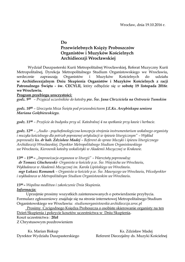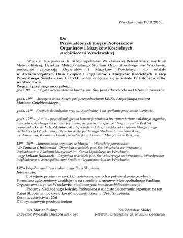 Wrocław, dnia 19.10.2016 r. Do Przewielebnych Księży Proboszczów Organistów i Muzyków Kościelnych Archidiecezji Wrocławskiej Wydział Duszpasterski Kurii Metropolitalnej Wrocławskiej, Referat Muzyczny Kurii Metropolitalnej, Dyrekcja Metropolitalnego Studium Organistowskiego we Wrocławiu, serdecznie zapraszają Organistów i Muzyków Kościelnych do udziału w Archidiecezjalnym Dniu Skupienia Organistów i Muzyków Kościelnych z racji Patronalnego Święta - św. CECYLII, który odbędzie się w sobotę 19 listopada 2016r. we Wrocławiu. Program przebiegu uroczystości: godz. 930 – Przyjazd uczestników do katedry pw. Św. Jana Chrzciciela na Ostrowie Tumskim godz. 1000 – Uroczysta Msza Święta pod przewodnictwem J.E.Ks. Arcybiskupa seniora Mariana Gołębiewskiego. godz. 1100 – Przejście do budynku przy ul. Katedralnej 4 na spotkanie przy kawie i herbacie. godz. 1200 – „Audio - psychofonologiczna koncepcja strojenia instrumentarium wokalnego organisty i muzyka kościelnego dla potrzeb poprawnej artykulacji w śpiewie liturgicznym” – Wykład poprowadzi ks. dr hab. Zdzisław Madej – Referent do spraw Muzyki i śpiewu liturgicznego Archidiecezji Wrocławskiej, Dyrektor Metropolitalnego Studium Organistowskiego we Wrocławiu, Kierownik katedry wokalistyki w Akademii Muzycznej w Krakowie. 1300 – 1500 – „Improwizacja organowa w liturgii” – Warsztaty poprowadzą: dr Tomasz Głuchowski- Organista w kościele p.w. Św. Wojciecha we Wrocławiu, Wykładowca w Akademii Muzycznej im. Karola Lipińskiego we Wrocławiu. mgr Łukasz Romanek – Organista w kościele p.w. Św. Maurycego we Wrocławiu, Wicedyrektor i wykładowca w Metropolitalnym Studium Organistowskim we Wrocławiu. 1500 – Wspólna modlitwa i zakończenie Dnia Skupienia. Informacja: Uprzejmie prosimy wszystkich zainteresowanych o potwierdzenie przybycia. Formularz zgłoszeniowy znajduje się na stronie internetowej Metropolitalnego Studium Organistowskiego we Wrocławiu: studiumorganistowskie.archidiecezja.wroc.pl Prosimy Czcigodnego Księdza Proboszcza o osobiste skierowanie organisty na ten Dzień Skupienia i pokrycie kosztów uczestnictwa w Dniu Skupienia. Koszt uczestnictwa : 20zł Z Chrystusowym pozdrowieniem Ks. Marian Biskup Dyrektor Wydziału Duszpasterskiego Ks. Zdzisław Madej Referent Diecezjalny ds. Muzyki Kościelnej