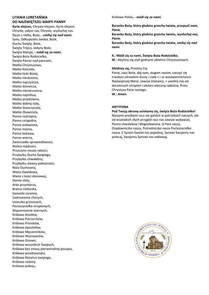 LITANIA LORETAŃSKA DO NAJŚWIĘTSZEJ MARYI PANNY Kyrie elejson, Chryste elejson, Kyrie elejson. Chryste, usłysz nas, Chryste, wysłuchaj nas. Ojcze z nieba, Boże, - zmiłuj się nad nami. Synu, Odkupicielu świata, Boże, Duchu Święty, Boże, Święta Trójco, Jedyny Boże, Święta Maryjo, - módl się za nami. Święta Boża Rodzicielko, Święta Panno nad pannami, Matko Chrystusowa, Matko Kościoła, Matko łaski Bożej, Matko nieskalana, Matko najczystsza, Matko dziewicza, Matko nienaruszona, Matko najmilsza, Matko przedziwna, Matko dobrej rady, Matko Stworzyciela, Matko Zbawiciela, Panno roztropna, Panno czcigodna, Panno wsławiona, Panno można, Panno łaskawa, Panno wierna, Zwierciadło sprawiedliwości, Stolico mądrości, Przyczyno naszej radości, Przybytku Ducha Świętego, Przybytku chwalebny, Przybytku sławny pobożności, Różo Duchowna, Wieżo Dawidowa, Wieżo z kości słoniowej, Domie złoty, Arko przymierza, Bramo niebieska, Gwiazdo zaranna, Uzdrowienie chorych, Ucieczko grzesznych, Pocieszycielko strapionych, Wspomożenie wiernych, Królowo Aniołów, Królowo Patriarchów, Królowo Proroków, Królowo Apostołów, Królowo Męczenników, Królowo Wyznawców, Królowo Dziewic, Królowo wszystkich Świętych, Królowo bez zmazy pierworodnej poczęta, Królowo wniebowzięta, Królowo Różańca świętego, Królowo rodziny Królowo pokoju, Królowo Polski, - módl się za nami. Baranku Boży, który gładzisz grzechy świata, przepuść nam, Panie. Baranku Boży, który gładzisz grzechy świata, wysłuchaj nas, Panie. Baranku Boży, który gładzisz grzechy świata, zmiłuj się nad nami. K.: Módl się za nami, Święta Boża Rodzicielko. W.: Abyśmy się stali godnymi obietnic Chrystusowych. Módlmy się, Prosimy Cię Panie, nasz Boże, daj nam, sługom swoim, cieszyć się trwałym zdrowiem duszy i ciała + i za wstawiennictwem Najświętszej Maryi, zawsze Dziewicy, + uwolnij nas od doczesnych utrapień i obdarz wieczną radością. Przez Chrystusa Pana naszego. W.: Amen. ANTYFONA Pod Twoją obronę uciekamy się, święta Boża Rodzicielko! Naszymi prośbami racz nie gardzić w potrzebach naszych, ale od wszelakich złych przygód racz nas zawsze wybawiać, Panno chwalebna i błogosławiona. O Pani nasza, Orędowniczko nasza, Pośredniczko nasza Pocieszycielko nasza. Z Synem Swoim nas pojednaj, Synowi Swojemu nas polecaj, Swojemu Synowi nas oddawaj.