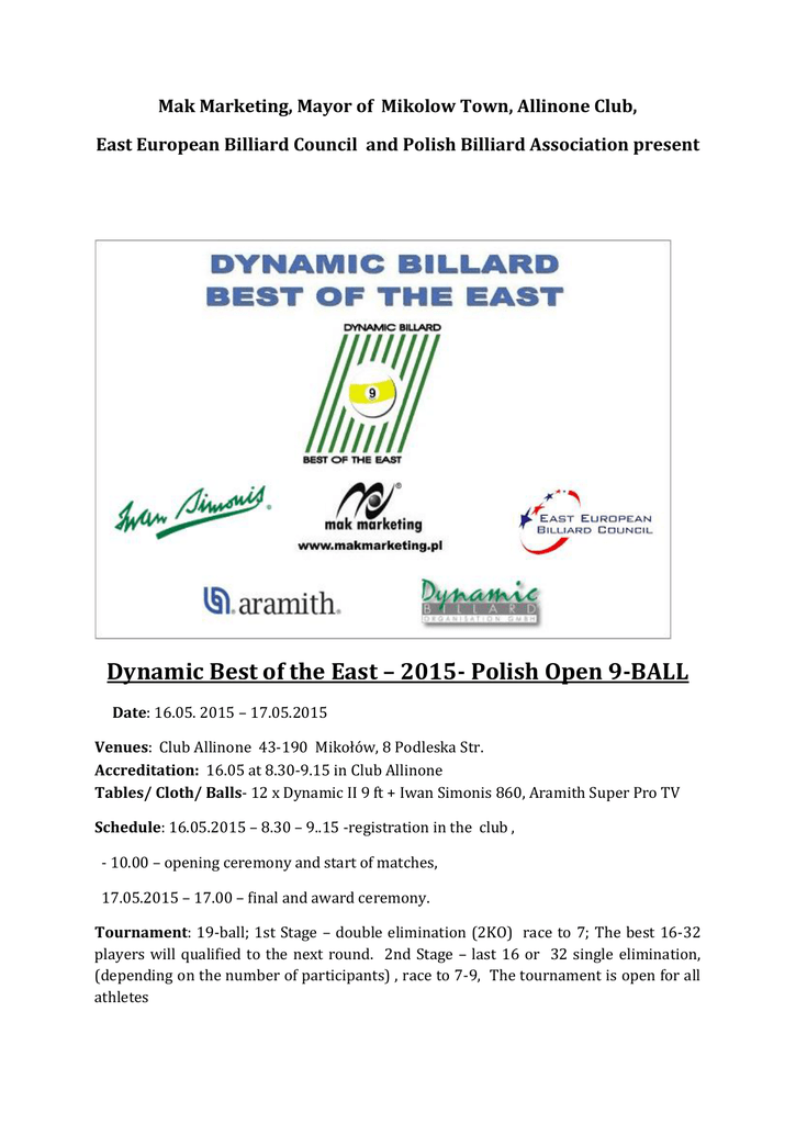 Mak Marketing, Mayor of Mikolow Town, Allinone Club, East European Billiard Council and Polish Billiard Association present Dynamic Best of the East – 2015- Polish Open 9-BALL Date: 16.05. 2015 – 17.05.2015 Venues: Club Allinone 43-190 Mikołów, 8 Podleska Str. Accreditation: 16.05 at 8.30-9.15 in Club Allinone Tables/ Cloth/ Balls- 12 x Dynamic II 9 ft + Iwan Simonis 860, Aramith Super Pro TV Schedule: 16.05.2015 – 8.30 – 9..15 -registration in the club , - 10.00 – opening ceremony and start of matches, 17.05.2015 – 17.00 – final and award ceremony. Tournament: 19-ball; 1st Stage – double elimination (2KO) race to 7; The best 16-32 players will qualified to the next round. 2nd Stage – last 16 or 32 single elimination, (depending on the number of participants) , race to 7-9, The tournament is open for all athletes Registration: in [email protected] only !!!! . Registration will close on 5.05. 2015 Dresscode: Polo shirt, one color trousers (no jeans and sport trousers allowed), shoes (no sneakers and sportshoes allowed). Prize money 1st - place- 1.050 euro, 2nd place- 700 €, 3-4th place- 400 euro , 5-8thplace- 200 € . East European Billiard Council would like to add 100 euro for the best female and 100 euro for the best junior player max 17 years old . ( if will registered minimum 5 participants in each category). Entry-fee for men athletes is 50€ and women and pupil athletes 30€. The participants pay during the registration. Hotels: Hotel Sjesta *** http://www.sjestahotel.pl/ Mikołów ul. Gliwicka 158 A, Twin or double room with breakfast - 165 zł, ( 41 euro per room), Hotel Pik http://www.hotelpik.pl/hotel Mikołów ul. Młyńska 5, Twin or double room with breakfast - 200 zł, ( 50 euro per room), Mocca d’Oro http://www.moccadoro.pl/ Mikołów ul. J. Pawła II 23 Twin or double room with breakfast - 200 zł, ( 50 euro per room), AkuVilla http://akuvilla.pl/ Tychy ul. Nizinna 76 Bed – 30-50 złotych ( 7,50 – 12,50 euro). Loft 71 http://loft71.dobrynocleg.pl/ Tychy ul. Katowicka 71 Bed – 40-85 złotych ( 10-20 euro). Hotel booking : [email protected] Tournament director : Marcin Krzeminski Technical director – Arkadiusz Maciol.