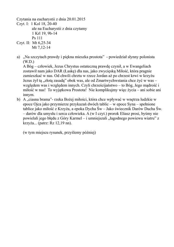 Czytania na eucharystii z dnia 20.01.2015 Czyt. I: 1 Kol 18, 20-40 ale na Eucharystii z dnia czytamy 1 Krl 19, 9b-14 Ps 111 Czyt. II: Mt 6,25-34 Mt 7,12-14 a) „Na szczytach prawdy i piękna mieszka prostota” - powiedział słynny polonista (W.D.) A Bóg – człowiek, Jezus Chrystus ostateczną prawdę czynił, a w Ewangeliach zostawił nam jako DAR (Łaskę) dla nas, jako zwycięską Miłość, która pragnie zamieszkać w nas. Od chwili chrztu w rzece Jordan aż po chrzest krwi w krzyżu Jezus żył tą „złotą zasadą” obok was, ale od Zmartwychwstania chce żyć w was – względem was i względem innych. Czyli chrześcijaństwo – to Bóg, Jego mądrość i miłość w nas! To wyjątkowa Prostota! Nie komplikujmy więc życia – ani sobie ani innym. b) A „ciasna brama”- rzeka Bożej miłości, która chce wpływać w wnętrza ludzkie w epoce Ojca jako przymierze przykazań dwóch tablic – w epoce Syna – spełnione tablice jako miłość z Krzyża, a epoka Dycha Św – Jako świecznik Darów Ducha Św. – darów dla umysłu i serca człowieka. A (w I czyt.) prorok Eliasz prosi, byśmy nie powielali jego błędu z Góry Karmel – i umniejszali „łagodnego powiewu wiatru” z krzyża... (patrz: Rz 12,19 nn). (w tym miejscu rysunek, przyślemy później)
