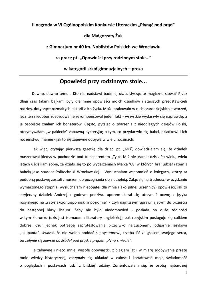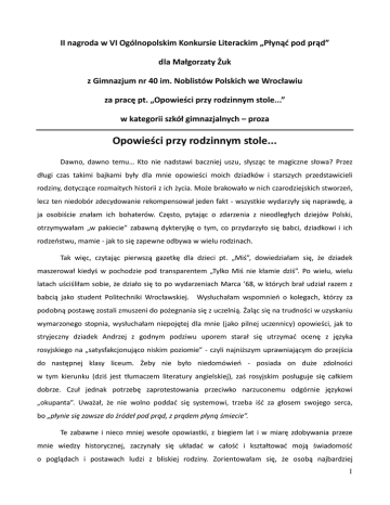 II nagroda w VI Ogólnopolskim Konkursie Literackim „Płynąć pod prąd” dla Małgorzaty Żuk z Gimnazjum nr 40 im. Noblistów Polskich we Wrocławiu za pracę pt. „Opowieści przy rodzinnym stole...” w kategorii szkół gimnazjalnych – proza Opowieści przy rodzinnym stole... Dawno, dawno temu… Kto nie nadstawi baczniej uszu, słysząc te magiczne słowa? Przez długi czas takimi bajkami były dla mnie opowieści moich dziadków i starszych przedstawicieli rodziny, dotyczące rozmaitych historii z ich życia. Może brakowało w nich czarodziejskich stworzeń, lecz ten niedobór zdecydowanie rekompensował jeden fakt - wszystkie wydarzyły się naprawdę, a ja osobiście znałam ich bohaterów. Często, pytając o zdarzenia z nieodległych dziejów Polski, otrzymywałam „w pakiecie” zabawną dykteryjkę o tym, co przydarzyło się babci, dziadkowi i ich rodzeństwu, mamie - jak to się zapewne odbywa w wielu rodzinach. Tak więc, czytając pierwszą gazetkę dla dzieci pt. „Miś”, dowiedziałam się, że dziadek maszerował kiedyś w pochodzie pod transparentem „Tylko Miś nie kłamie dziś”. Po wielu, wielu latach uściśliłam sobie, że działo się to po wydarzeniach Marca ’68, w których brał udział razem z babcią jako student Politechniki Wrocławskiej. Wysłuchałam wspomnień o kolegach, którzy za podobną postawę zostali zmuszeni do pożegnania się z uczelnią. Żaląc się na trudności w uzyskaniu wymarzonego stopnia, wysłuchałam niepojętej dla mnie (jako pilnej uczennicy) opowieści, jak to stryjeczny dziadek Andrzej z godnym podziwu uporem starał się utrzymać ocenę z języka rosyjskiego na „satysfakcjonująco niskim poziomie” - czyli najniższym uprawniającym do przejścia do następnej klasy liceum. Żeby nie było niedomówień - posiada on duże zdolności w tym kierunku (dziś jest tłumaczem literatury angielskiej), zaś rosyjskim posługuje się całkiem dobrze. Czuł jednak potrzebę zaprotestowania przeciwko narzuconemu odgórnie językowi „okupanta”. Uważał, że nie wolno poddać się systemowi, trzeba iść za głosem swojego serca, bo „płynie się zawsze do źródeł pod prąd, z prądem płyną śmiecie”. Te zabawne i nieco mniej wesołe opowiastki, z biegiem lat i w miarę zdobywania przeze mnie wiedzy historycznej, zaczynały się układać w całość i kształtować moją świadomość o poglądach i postawach ludzi z bliskiej rodziny. Zorientowałam się, że osobą najbardziej 1 zaangażowaną w działania opozycyjne wobec reżimu komunistycznego był zawsze stryjeczny dziadek (ja nazywam go wujkiem) – Andrzej Milcarz. Niechęć do wszelkich form ograniczania wolności Polski czuł od dziecka, czemu dawał wyraz w wypracowaniach szkolnych, wprawiając w konsternację nauczycieli. Mimo to skończył polonistykę na Uniwersytecie Wrocławskim i zaczął pracować w gazecie „Wieczór Wrocławia” jako dziennikarz. Jego przeżycia wydawały mi się interesujące, nigdy jednak nie potrafiłam zebrać się na odwagę i poprosić go, by podzielił się ze mną swoimi wspomnieniami. Z tego właśnie powodu, gdy kilka dni temu gościł u nas, postanowiłam dalej nie zwlekać i namówić go, by przywołał historie z dawnych lat… W 1980 r., po protestach w Stoczni Gdańskiej, w całej Polsce tworzyły się oddziały związku zawodowego „Solidarność”. Także we Wrocławiu znaczna część pracujących, a wśród nich dziennikarze i drukarze, dołączyli do tej organizacji. Przewodniczącym Komisji Zakładowej we wrocławskich gazetach został mój stryjeczny dziadek. Jako główny cel działacze związku zawodowego obrali „uwolnienie” prasy spod nieustannej kontroli cenzury. Taka okazja nadarzyła się w marcu 1981 roku, po słynnym kryzysie bydgoskim. „Wieczór Wrocławia” postanowił przedstawić w swoim reportażu zarówno oficjalne stanowisko rządowe, jak i własny raport z tamtych wydarzeń. Cenzor dyżurujący w drukarni przy ul. Piotra Skargi zakwestionował fragment 2 tekstu relacjonujący konferencję „Solidarności”. Dziennikarze sprzeciwili się wtedy wydrukowaniu okrojonej wersji, chcieli w pełni poinformować swoich czytelników, co stało się w Bydgoszczy. Długo dyskutowali, jak tego dokonać. W końcu postanowili obejść cenzora, drukując pustą plamę w miejscu niedopuszczonego artykułu. Gazeta momentalnie stała się towarem rozchwytywanym. Czytelnicy wyrażali swoje poparcie także listownie i telefonicznie. W tamtych czasach był to „ten hardy krok co świat przemieni”- i spotkał się z olbrzymim, pozytywnym odzewem. Trzydzieści lat później „Wieczór Wrocławia” przypomniał tamte wydarzenia i przeprowadził wywiad z moim stryjecznym dziadkiem. Osoby odpowiedzialne za puszczenie białej plamy, a wśród nich też mój wujek, przygotowywały się na szykany ze strony partii. Wiedzieli, że życie „stawia nas twarzą w twarz wobec okrutnej alternatywy – albo bezpieczeństwo albo wolność” - w tym wypadku wolność prasy. Represje jednak nie nadeszły. Dopiero pół roku później, po wprowadzeniu stanu wojennego, komuniści przystąpili do ataku - zwolnili wszystkich dziennikarzy „Wieczoru Wrocławia” związanych z „Solidarnością”. Wujkowi także zakazano wykonywania zawodu. On jednak ani myślał rezygnować z pisania w prasie! Razem z kolegami postanowił wydawać małą, prymitywnie powielaną gazetkę pt. „De facto”- oczywiście nielegalnie. Pozbawiony etatu, z tzw. „wilczym biletem” - nie stronił od pracy fizycznej w ogródkach zaprzyjaźnionych osób i przy produkcji zniczy nagrobnych na Wszystkich Świętych. Te dorywcze prace oraz paczki przysyłane z zagranicy przez znajomych przez pewien czas stanowiły źródło utrzymania dla niego i jego 3 najbliższych. O bezpieczeństwie ekonomicznym rodziny nie mogło być mowy - jednak większą wartością był fakt sprzeniewierzenia się opresyjnej cenzurze, bycie „wyprosto