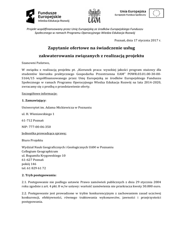 Projekt współfinansowany przez Unię Europejską ze środków Europejskiego Funduszu Społecznego w ramach Programu Operacyjnego Wiedza Edukacja Rozwój Poznań, dnia 17 stycznia 2017 r. Zapytanie ofertowe na świadczenie usług zakwaterowania związanych z realizacją projektu Szanowni Państwo, W związku z realizacją projektu pt. „Kierunek praca: wysokiej jakości program stażowy dla studentów kierunku praktycznego Gospodarka Przestrzenna UAM” POWR.03.01.00-30-00S164/15 współfinansowanego przez Unię Europejską ze środków Europejskiego Funduszu Społecznego w ramach Programu Operacyjnego Wiedza Edukacja Rozwój na lata 2014-2020, zwracamy się z prośbą o przedstawienie oferty. Szczegółowe informacje: 1. Zamawiający: Uniwersytet im. Adama Mickiewicza w Poznaniu ul. H. Wieniawskiego 1 61-712 Poznań NIP: 777-00-06-350 Jednostka prowadząca sprawę: Biuro Projektu Wydział Nauk Geograficznych i Geologicznych UAM w Poznaniu Collegium Geographicum ul. Bogumiła Krygowskiego 10 61-627 Poznań pokój 146 tel. 61 829 61 72 2. Tryb postępowania: 2.1. Postępowanie nie podlega ustawie Prawo zamówień publicznych z dnia 29 stycznia 2004 roku zgodnie z art. 4 pkt. 8 w/w ustawy: wartość zamówienia nie przekracza kwoty 30.000 euro. 2.2. Postępowanie jest prowadzone w trybie konkurencyjnym z zachowaniem zasad uczciwej konkurencji, efektywności, równego traktowania wykonawców, jawności i przejrzystości postępowania. 2.3. Niniejsze zapytanie ofertowe nie stanowi oferty w rozumieniu przepisów Kodeksu cywilnego. 2.4 Zamawiający zastrzega sobie prawo odstąpienia od niższego postępowania bez wyłonienia oferty i bez podawania przyczyn. 3. Przedmiot zamówienia: Usługa zakwaterowania dla 4 studentów realizujących staże na terenie Brukseli w okresie 29.01–29.04.2017, z pokojami 1-2 osobowymi z dostępem do wyposażonej kuchni/aneksu kuchennego i węzłem sanitarnym. Przedmiot zamówienia został podzielony na 4 części, z których każda stanowi zakwaterowanie 1 osoby w terminie 29.01–29.04.2017 na terenie Brukseli. Szczegóły zostaną doprecyzowane po wyłonieniu Wykonawcy. 4. Miejsce i czas składania ofert: E- mail lub osobiście do dnia 24.01.2017 roku do godz. 15:00 e-mail: [email protected] w Biurze Projektu O ewentualnym wybraniu oferty zostaną Państwo poinformowani poprzez złożenie zamówienia. 5. Kryterium wyboru: Przy wyborze oferty zamawiający będzie kierował się kryterium ceny (100%). 6. Złożone oferty powinny zawierać: ofertę cenową z nazwą i adresem oferenta, wartością usługi netto, stawką VAT, stawką brutto oraz opisem oferty. 7. Korespondencja w trakcie trwania postępowania W trakcie postępowania w razie pytań i wątpliwości prosimy o kontakt z Biurem Projektu drogą elektroniczną na adres: [email protected] 8. O udzielenie Zamówienia mogą ubiegać się Wykonawcy, którzy: Posiadają odpowiednie doświadczenie oraz nie są powiązani osobowo lub kapitałowo. Załączniki: 1. wzór oferty
