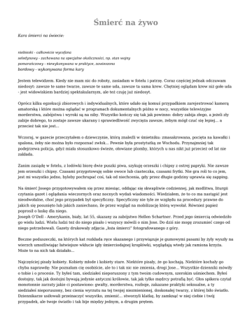 Śmierć na żywo Kara śmierci na świecie: niebieski - całkowicie wycofana seledynowy - zachowana na specjalne okoliczności, np. stan wojny pomarańczowy - niewykonywana w praktyce, zawieszona bordowy - wykonywana forma kary Jestem telewidzem. Kiedy nie mam nic do roboty, zasiadam w fotelu i patrzę. Coraz częściej jednak odczuwam niedosyt: zawsze te same twarze, zawsze te same uda, zawsze ta sama krew. Chętniej oglądam krew niż gołe uda - jest widowiskiem bardziej spektakularnym, ale też czuję już niedosyt. Oprócz kilku egzekucji zbiorowych i indywidualnych, które udało się komuś przypadkiem zarejestrować kamerą amatorską i które można oglądać w programach dokumentalnych późno w nocy, wszystkie telewizyjne morderstwa, zabójstwa i wyroki są na niby. Wszystko kończy się tak jak powinno: dobry zabija złego, a jeżeli zły zabije dobrego, to zostaje zawsze ukarany i sprawiedliwość zwycięża zawsze, żebym mógł czuć się lepiej... a przecież tak nie jest... Wczoraj, w gazecie przeczytałem o dziewczynie, którą znaleźli w śmietniku: zmasakrowana, pocięta na kawałki i spalona, żeby nie można było rozpoznać zwłok... Pewnie była prostytutką ze Wschodu. Przynajmniej tak podejrzewa policja, gdyż miała stosunkowo świeże, ołowiane plomby, których u nas nikt już przecież od lat nie zakłada. Zanim zasiądę w fotelu, z lodówki biorę dwie puszki piwa, szykuję orzeszki i chipsy z ostrej papryki. Nie zawsze jem orzeszki i chipsy. Czasami przygotowuję sobie owoce lub ciasteczka, czasami frytki. Nie gra roli to co jem, jest mi wszystko jedno, byleby pochrupać coś, tak od niechcenia, gdy przez długie godziny uprawia się zapping. Na śmierć Josego przygotowywałem się przez miesiąc, oddając się skwapliwie codziennej, jak modlitwa, liturgii czytania gazet i oglądania wieczornych oraz nocnych wydań wiadomości. Wiedziałem, że to co ma nastąpić jest nieodwołalne, choć jego przypadek był specyficzny. Specyficzny nie tyle ze względu na procedury prawne do jakich się posunięto lub jakich zaniechano, ile przez wzgląd na mobilizację którą wywołał. Również papież poprosił o łaskę dla niego. Joseph O’Dell - Amerykanin, biały, lat 55, skazany za zabójstwo Hellen Schartner. Przed jego śmiercią odwiedziło go wielu ludzi. Wielu ludzi też do niego pisało i wszyscy mówili o nim Jose. Do dziś nie mogę zrozumieć czego od niego potrzebowali. Gazety drukowały zdjęcia „łoża śmierci” fotografowanego z góry. Boczne poduszeczki, na których kat rozkłada ręce skazanego i przywiązuje je gumowymi pasami by żyły wyszły na wierzch umożliwiając łatwiejsze wkłucie igły śmierciodajnej kroplówki, wyglądają wtedy jak ramiona krzyża. Może to na nich tak działało... Najczęściej pisały kobiety. Kobiety młode i kobiety stare. Niektóre pisały, że go kochają. Niektóre kochały go chyba naprawdę: Nie poznałam cię osobiście, ale to i tak nic nie zmienia, drogi Jose... Wszystkie dzienniki mówiły o tobie i o procesie. Ty byłeś tam, siedziałeś nieporuszony z tym twoim cudownym, szerokim uśmiechem. Byłeś dostojny, tak jak dostojni bywają jedynie antyczni królowie, tak jak tylko mędrcy potrafią być. Głos spikera czytał monotonnie zarzuty jakie ci postawiono: gwałty, morderstwa, rozboje, zakazane praktyki seksualne, a ty siedziałeś nieporuszony, bez cienia wyrzutu na tej twojej niezmienionej, doskonałej twarzy, z której biło światło. Dziennikarze usiłowali przeinaczyć wszystko, zmienić... stworzyli klatkę, by zamknąć w niej ciebie i twój przypadek, ale twoje światło i tak bije między jednym, a drugim prętem. Młodsze kobiety prosiły go o fotografię z autografem, starsze wycinały z dzienników i kolorowych czasopism wszystkie jego zdjęcia i wieszały nad łóżkiem obok krzyża i świętych obrazków, klękając przed nimi co dzień. Modliły się albo o wybawienie, albo o zbawienie. To nie jest istotne. On mówił, że jest niewinny. W końcu jedna za niego wyszła. Nie była brzydka, ale miała spaloną od trwałej i wystrzyżoną jak palma grzywkę oraz zajęczą wargę. Nie miało to jednak żadnego znaczenia bo i tak nie mogli się całować. Ślub odbył się w osiem godzin przed tym, jak zegary wybiły czas, w więziennej kapliczce, w obecności dwóch świadków i pięciu strażników. Nazywała się Liza. "Miała na sobie długą suknię z lekkiego niebieskawego jedwabiu, na którym były wymalowane białe lilie. Poświęciła wiele godzin na szukanie odpowiedniego stroju. W końcu wybrała właśnie tę suknię w białe, niewinne lilie, z wysokim rozcięciem z tyłu. Na stopy włożyła złote sandały, tak złote jak kolczyki, którymi przyozdobiła uszy. Jednak najcenniejszy klejnot miała na chudej, wyciągniętej szyi: różaniec z pereł słodkowodnych pobłogosławiony przez Ojca Świętego." - pisali w gazetach. Pewna dziennikarka, w dodatku do tygodnika „Ewa 2000”, oburzyła się, że oblubieńcom nie pozwolono nawet by podali sobie ręce: "Stali na przeciw siebie i Jose powiedział: Będę cię kochał również po śmierci. Wtedy kapłan ujął ich dłonie, aby za pośrednictwem własnego ciała przekazać energię miłosną i szepcząc, że łaska Pana zeszła nawet w te progi - pobłogosławił." Podobno jeden z klawiszy rozpłakał się - tak pisały inne gazety. Ale i to nic nie pomogło - Lizie nie pozwolono uczestniczyć w egzekucji. Była tylko rodzina ofiary i kilku dziennikarzy. *** Z gazet dowiedziałem się również, że wszystko zaczęło się od śmierci Hellen. Wszystko ma zawsze jakiś początek. Niekiedy jest to początek banalny, niekiedy błyskotliwy, często przypadek coś rozpoczyna. Czy tak było z Jose? Nie wiem. Nawet dziś, gdy upłynęło już tyle czasu, nie mogę wyrobić sobie zdania. Inni ludzie jakoś wiedzą, wiedzieli od razu, patrzyli w jego twarz i mówili: winny - niewinny. Skąd brali tę pewność? Przyglą