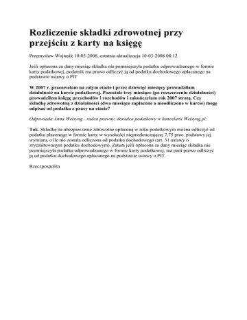 Rozliczenie składki zdrowotnej przy przejściu z karty na księgę Przemysław Wojtasik 10-03-2008, ostatnia aktualizacja 10-03-2008 08:12 Jeśli opłacona za dany miesiąc składka nie pomniejszyła podatku odprowadzanego w formie karty podatkowej, podatnik ma prawo odliczyć ją od podatku dochodowego opłacanego na podstawie ustawy o PIT W 2007 r. pracowałam na całym etacie i przez dziewięć miesięcy prowadziłam działalność na karcie podatkowej. Pozostałe trzy miesiące (po rozszerzeniu działalności) prowadziłem księgę przychodów i rozchodów i zakończyłam rok 2007 stratą. Czy składkę zdrowotną z działalności (dwa miesiące zapłacone a nieodliczone w karcie) mogę odpisać od podatku z pracy na etacie? Odpowiada Anna Welsyng - radca prawny, doradca podatkowy w kancelarii Welsyng.pl: Tak. Składkę na ubezpieczenie zdrowotne opłaconą w roku podatkowym moŜna odliczyć od podatku płaconego w formie karty w wysokości nieprzekraczającej 7,75 proc. podstawy jej wymiaru, o ile nie została odliczona od podatku dochodowego (art. 31 ustawy o zryczałtowanym podatku dochodowym). Zatem jeśli opłacona za dany miesiąc składka nie pomniejszyła podatku odprowadzanego w formie karty podatkowej, ma pani prawo odliczyć ją od podatku dochodowego opłacanego na podstawie ustawy o PIT. Rzeczpospolita
