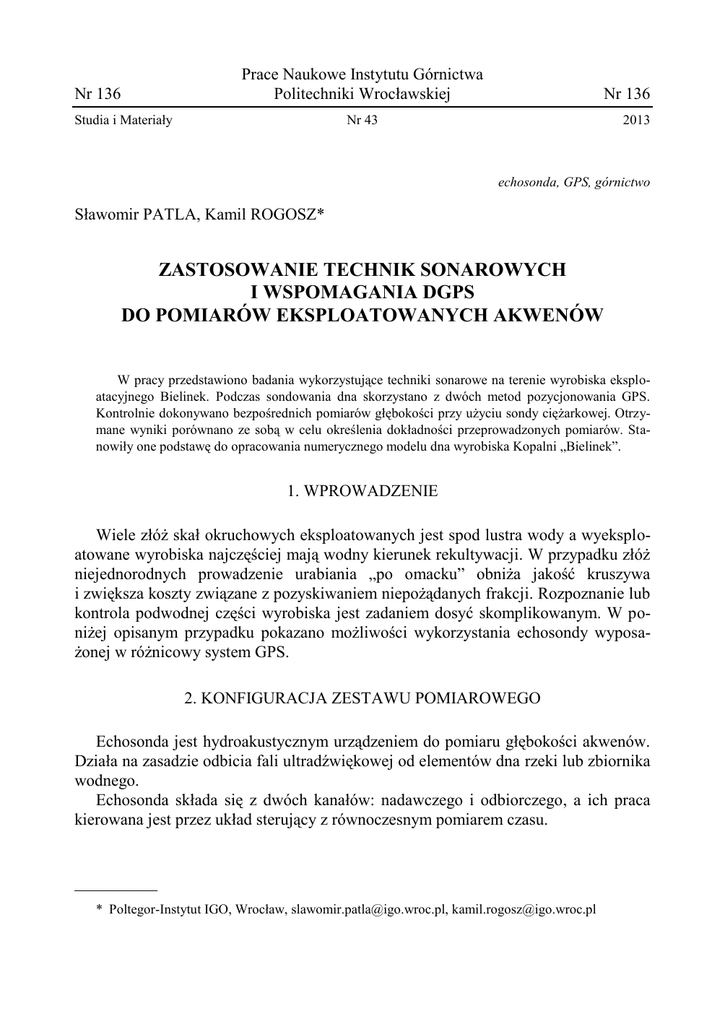 Prace Naukowe Instytutu Górnictwa Politechniki Wrocławskiej Nr 136 Studia i Materiały Nr 136 Nr 43 2013 echosonda, GPS, górnictwo Sławomir PATLA, Kamil ROGOSZ* ZASTOSOWANIE TECHNIK SONAROWYCH I WSPOMAGANIA DGPS DO POMIARÓW EKSPLOATOWANYCH AKWENÓW W pracy przedstawiono badania wykorzystujące techniki sonarowe na terenie wyrobiska eksploatacyjnego Bielinek. Podczas sondowania dna skorzystano z dwóch metod pozycjonowania GPS. Kontrolnie dokonywano bezpośrednich pomiarów głębokości przy użyciu sondy ciężarkowej. Otrzymane wyniki porównano ze sobą w celu określenia dokładności przeprowadzonych pomiarów. Stanowiły one podstawę do opracowania numerycznego modelu dna wyrobiska Kopalni „Bielinek”. 1. WPROWADZENIE Wiele złóż skał okruchowych eksploatowanych jest spod lustra wody a wyeksploatowane wyrobiska najczęściej mają wodny kierunek rekultywacji. W przypadku złóż niejednorodnych prowadzenie urabiania „po omacku” obniża jakość kruszywa i zwiększa koszty związane z pozyskiwaniem niepożądanych frakcji. Rozpoznanie lub kontrola podwodnej części wyrobiska jest zadaniem dosyć skomplikowanym. W poniżej opisanym przypadku pokazano możliwości wykorzystania echosondy wyposażonej w różnicowy system GPS. 2. KONFIGURACJA ZESTAWU POMIAROWEGO Echosonda jest hydroakustycznym urządzeniem do pomiaru głębokości akwenów. Działa na zasadzie odbicia fali ultradźwiękowej od elementów dna rzeki lub zbiornika wodnego. Echosonda składa się z dwóch kanałów: nadawczego i odbiorczego, a ich praca kierowana jest przez układ sterujący z równoczesnym pomiarem czasu. __________ * Poltegor-Instytut IGO, Wrocław, [email protected], [email protected] 170 Pomiar głębokości odbywa się na zasadzie wyznaczenia czasu wygenerowania impulsu elektromagnetycznego w generatorze, który następnie jest przekazywany na przetwornik i wyemitowany do wody w postaci impulsu hydroakustycznego o prędkości υ = 1400–1550 m/s w zależności od temperatury i stopnia zasolenia ośrodka. Wygenerowany impuls po odbiciu się od dna, napotkanej przeszkody lub innego elementu unoszącego się w wodzie powraca do przetwornika i następuje uruchomienie kanału odbiorczego echosondy. w przetworniku sygnał fali akustycznej zostaje przekształcony na impuls elektryczny, następnie wzmocniony we wzmacniaczu, po czym kierowany jest do układu sterującego. następuje pomiar czasu od chwili nadania do chwili powrotu impulsu elektrycznego, który po odpowiedniej obróbce zostaje wyświetlany na ekranie. Stotnym parametrem echosondy jest generowany kąt stożka (rys. 1), który decyduje o zakresie i dokładności pomiaru. Operator ma możliwość dostosowania parametrów pracy sondy. Szeroki kąt stożka ukazuje więcej informacji spod zwierciadła wody. Obarczone jest to jednak kosztem zmniejszenia głębokości penetracji, spowodowane utratą dostępnej mocy przetwornika przy szeroko rozprzestrzeniającym się sygnale. Przetwornik będący integralną częścią wykorzystanej do badań echosondy pracuje na trzech częstotliwościach 50 kHz, 83 kHz i 200 kHz. Jego moc sygnału równa 250 W pozwala na maksymalną głębokość penetracji równą 1524 m. Komunikacja echosondy z zewnętrznymi odbiornikami GPS odbywa się za pomocą złącza NMEA 2000 i NMEA 0183. Wbudowany odbiornik GPS pozwala na określenie pozycji z dokładnością 3 m (pomiar autonomiczny). Wykorzystanie techniki różnicowej (DGPS) zwiększa dokładność pomiaru do ok. 5 mm. Rys. 1. Różnica w zakresie i dokładności pomiarów w zależności od kąta stożka przetwornika Fig. 1. The difference in the extent and accuracy of the measurements depending on the angle of the cone of the transducer Pomiar autonomiczny wykonano montując uchwyt przetwornika na pawęży pontonu. Przetwornik znajdował się ok. 15 cm pod lustrem wody, co uwzględniono podczas konfiguracji urządzenia. 171 Pomiar z zewnętrznym odbiornikiem GPS wykonano montując antenę mobilną tak, aby oś anteny pokrywała się z osią przetwornika (rys. 2). Wahliwe zamontowanie uchwytu przetwornika (i znajdującej się nad nim anteny GPS) umożliwiło ustawienie zestawu w poziomie. Poprawki GPS transmitowane były przez stację referencyjną ustawioną na punkcie o znanych współrzędnych na terenie kopalni. Wspomniany wcześniej odbiornik GPS – Hiper II posiada zintegrowany podwójny modem GSM/GPRS oraz UHF co pozwala na wykorzystanie go jako odbiornika ruchomego wykorzystującego poprawki z sieci: ASG-EUPOS oraz TPI-NET. Odbiornik dysponuje 72 kanałami, co umożliwia śledzenie wszystkich widocznych satelitów na nieboskłonie w dowolnym miejscu i czasie. Wbudowany moduł umożliwia śledzenie sygnałów L1 i L2 sieci GPS i GLONASS oraz Satelitarnych Sygnałów Wspomagających SBAS takich jak: amerykański WAAS, europejski EGNOS oraz japoński MSAS. Maksymalna dokładność urządzenia to ok. 3 mm w poziomie i 5 mm w pionie. Pracą odbiornika steruje użytkownik za pomocą kontrolera wykorzystującego bezprzewodową technologię komunikacji krótkiego zasięgu Bluetooth. Rys. 2. Konfiguracja sprzętu pomiarowego Fig. 2. Configuration of the measuring equipment 3. BADANIA POWIERZCHNI SPĄGOWEJ I ANALIZA WYNIKÓW W celu przeprowadzenia badań dotyczących zastosowania echosondy i zewnętrznego odbiornika GPS wytypowano obszar akwenu eksploatacyjnego, na którym prowadzono sondowanie. Obszar badań został ograniczony do powierzchni zapewniającej odpowiednią gęstość próbkowania głębokości. W pierwszej kolejności wykonano sondowanie dna przy użyciu echosondy oraz taśmy mierniczej z obciążnikiem. Zakreślono obszar badań a następnie wypełniono 172 śladami środek obwiedni (rys. 3). W lewej części obrazu widać profil dna powstający w czasie przemieszczania się pontonu. Po lewej stronie zapisany jest ślad trasy we współrzędnych geocentrycznych. W kolejnej fazie badań wykonano sondowanie dna z podłączonym zewnętrznym 