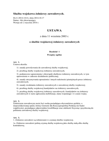 Służba wojskowa żołnierzy zawodowych. Dz.U.2014.1414 z dnia 2014.10.17 Status: Akt obowiązujący Wersja od: 2 stycznia 2016 r. USTAWA z dnia 11 września 2003 r. o służbie wojskowej żołnierzy zawodowych Rozdział 1 Przepisy ogólne Art. 1. Ustawa określa: 1) zasady powoływania do zawodowej służby wojskowej; 2) przebieg służby wojskowej żołnierzy zawodowych; 3) podstawowe uprawnienia i obowiązki służbowe żołnierzy zawodowych, w tym uprawnienia w zakresie działalności publicznej; 4) zasady otrzymywania uposażenia i innych należności pieniężnych przez żołnierzy zawodowych; 5) zasady zwalniania żołnierzy zawodowych z zawodowej służby wojskowej; 6) przebieg służby wojskowej kandydatów na żołnierzy zawodowych; 7) przebieg służby wojskowej żołnierzy zawodowych i kandydatów na żołnierzy zawodowych w razie ogłoszenia mobilizacji, stanu wojennego i w czasie wojny. Art. 2. Żołnierzem zawodowym może być osoba posiadająca obywatelstwo polskie, o nieposzlakowanej opinii, której wierność dla Rzeczypospolitej Polskiej nie budzi wątpliwości, posiadająca odpowiednie kwalifikacje oraz zdolność fizyczną i psychiczną do pełnienia zawodowej służby wojskowej. Art. 3. 1. Żołnierze zawodowi są żołnierzami w czynnej służbie wojskowej. 1a. Żołnierze zawodowi pełnią czynną służbę wojskową jako służbę stałą albo służbę kontraktową. 2. Żołnierze zawodowi pełnią zawodową służbę wojskową dla dobra Rzeczypospolitej Polskiej. Służba ta wymaga zdyscyplinowania, lojalności i poświęcenia. 3. Państwo zapewnia żołnierzom zawodowym godne warunki życia, umożliwiające oddanie się służbie Narodowi i Ojczyźnie, rekompensując odpowiednio trud, ograniczenia i wyrzeczenia związane z pełnieniem zawodowej służby wojskowej. Art. 4. 1. Żołnierze zawodowi stanowią kadrę zawodową Sił Zbrojnych Rzeczypospolitej Polskiej, zwanych dalej "Siłami Zbrojnymi". 2. Kadra zawodowa Sił Zbrojnych dzieli się na: 1) korpus oficerów zawodowych, do którego zalicza się: a) oficerów młodszych, b) oficerów starszych, c) generałów i admirałów; 2) korpus podoficerów zawodowych, do którego zalicza się: a) podoficerów młodszych, b) podoficerów, c) podoficerów starszych; 3) korpus szeregowych zawodowych. 3. Korpusy oficerów zawodowych, podoficerów zawodowych i szeregowych zawodowych dzielą się na korpusy osobowe. Korpusy osobowe dzielą się na grupy osobowe, w których występuje podział na specjalności wojskowe. 4. (uchylony). 5. Minister Obrony Narodowej, w drodze rozporządzenia, tworzy i znosi korpusy osobowe, ustala ich podział na grupy osobowe i specjalności wojskowe, zapewniając zaspokojenie potrzeb Sił Zbrojnych. 6. (uchylony). Art. 5. 1. Zdolność fizyczną i psychiczną do pełnienia zawodowej służby wojskowej ustala wojskowa komisja lekarska, która wydaje w tej sprawie orzeczenie. Orzeczenie wojskowej komisji lekarskiej jest decyzją. 1a. Od orzeczenia wojskowej komisji lekarskiej przysługuje odwołanie do wojskowej komisji lekarskiej wyższego stopnia. 1b. Członek składu orzekającego wojskowej komisji lekarskiej może zgłosić na piśmie sprzeciw wobec projektu orzeczenia wojskowej komisji lekarskiej. 2. Do wojskowej komisji lekarskiej kieruje się: 1) żołnierza zawodowego - z urzędu albo na jego wniosek; 2) żołnierza i inną osobę, która zgłosiła chęć pełnienia zawodowej służby wojskowej - z urzędu. 3. Do wojskowej komisji lekarskiej kieruje się z urzędu żołnierzy zawodowych: 1) gdy nie wykonują zadań służbowych z powodu choroby trwającej nieprzerwanie przez trzy miesiące; 2) jeżeli w ich stanie zdrowia nastąpiło pogorszenie uniemożliwiające lub utrudniające wykonywanie zadań służbowych; 3) gdy ulegli wypadkom pozostającym w związku z pełnieniem zawodowej służby wojskowej lub u których została stwierdzona choroba powstała w związku ze szczególnymi właściwościami lub warunkami służby wojskowej; 4) w celu przeprowadzenia okresowych lub okolicznościowych badań lekarskich - jeżeli zaliczeni zostali do określonych grup osobowych; 5) przed skierowaniem do pełnienia zawodowej służby wojskowej poza granicami państwa oraz po powrocie do kraju; 6) jeżeli orzeczenie wojskowej komisji lekarskiej jest niezbędne w postępowaniu karnym lub w sprawach o wykroczenia; 7) (uchylony). 3a. Przepisu ust. 3 pkt 1 nie stosuje się do żołnierzy - kobiet ciężarnych. 4. Do wojskowej komisji lekarskiej można skierować z urzędu żołnierza zawodowego również w innych niż wymienione w ust. 3 przypadkach uzasadnionych potrzebami Sił Zbrojnych, w tym w szczególności: 1) przed wyznaczeniem na stanowisko służbowe; 2) w związku z przeniesieniem do innego korpusu osobowego albo innej grupy osobowej; 3) przed zwolnieniem z zawodowej służby wojskowej z przyczyn innych niż ze względu na stan zdrowia; 4) gdy nie przystąpił w nakazanym terminie do sprawdzianu sprawności fizycznej lub gdy otrzymał ze sprawdzianu sprawności fizycznej ocenę niedostateczną; 5) w celu sprawdzenia prawidłowości orzekania o jego czasowej niezdolności do służby z powodu choroby lub prawidłowości wykorzystania zwolnienia lekarskiego. 5. Do wojskowej komisji lekarskiej kierują: 1) wojskowy komendant uzupełnień - żołnierzy i inne osoby ubiegające się o powołanie do zawodowej służby wojskowej; 2) dowódca jednostki wojskowej - w przypadkach wymienionych w ust. 2 pkt 1, ust. 3 pkt 1-4 oraz ust. 4 pkt 3-5, a także, po uzgodnieniu z organem właściwym do wyznaczenia żołnierza zawodowego na stanowisko służbowe, w przypadkach wymienionych w ust. 3 pkt 5 oraz ust. 4 pkt 1 i 2; 3) sąd, prokurator, komendant jednostki organizacyjnej Żandarmerii Wojskowej oraz inny organ, przed którym toczy się postępowanie w sprawach o przestępstwo lub wykroczenie - w przypadku wymienionym w ust. 3 pkt 6; 4) Minister Obrony Narodowej - wszystkich żołnierzy zawodowyc