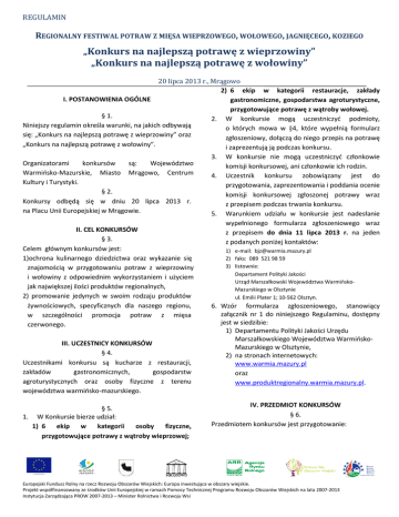 REGULAMIN REGIONALNY FESTIWAL POTRAW Z MIĘSA WIEPRZOWEGO, WOŁOWEGO, JAGNIĘCEGO, KOZIEGO „Konkurs na najlepszą potrawę z wieprzowiny” „Konkurs na najlepszą potrawę z wołowiny” 20 lipca 2013 r., Mrągowo 2) 6 ekip w kategorii restauracje, zakłady I. POSTANOWIENIA OGÓLNE gastronomiczne, gospodarstwa agroturystyczne, przygotowujące potrawę z wątroby wołowej. § 1. 2. W konkursie mogą uczestniczyd podmioty, Niniejszy regulamin określa warunki, na jakich odbywają o których mowa w §4, które wypełnią formularz się: „Konkurs na najlepszą potrawę z wieprzowiny” oraz zgłoszeniowy, dołączą do niego przepis na potrawę „Konkurs na najlepszą potrawę z wołowiny”. i zaprezentują ją podczas konkursu. 3. W konkursie nie mogą uczestniczyd członkowie Organizatorami konkursów są: Województwo komisji konkursowej, ani członkowie ich rodzin. Warmiosko-Mazurskie, Miasto Mrągowo, Centrum 4. Uczestnik konkursu zobowiązany jest do Kultury i Turystyki. przygotowania, zaprezentowania i poddania ocenie § 2. komisji konkursowej zgłoszonej potrawy wraz Konkursy odbędą się w dniu 20 lipca 2013 r. z przepisem podczas trwania konkursu. na Placu Unii Europejskiej w Mrągowie. 5. Warunkiem udziału w konkursie jest nadesłanie wypełnionego formularza zgłoszeniowego wraz II. CEL KONKURSÓW z przepisem do dnia 11 lipca 2013 r. na jeden § 3. z podanych poniżej kontaktów: Celem głównym konkursów jest: 1) e-mail: [email protected] 1)ochrona kulinarnego dziedzictwa oraz wykazanie się 2) faks: 089 521 98 59 3) listownie: znajomością w przygotowaniu potraw z wieprzowiny Departament Polityki Jakości i wołowiny z odpowiednim wykorzystaniem i użyciem Urząd Marszałkowski Województwa Warmioskojak największej ilości produktów regionalnych, Mazurskiego w Olsztynie 2) promowanie jedynych w swoim rodzaju produktów ul. Emilii Plater 1; 10-562 Olsztyn. żywnościowych, specyficznych dla naszego regionu, 6. Wzór formularza zgłoszeniowego, stanowiący załącznik nr 1 do niniejszego Regulaminu, dostępny w szczególności promocja potraw z mięsa jest w siedzibie: czerwonego. 1) Departamentu Polityki Jakości Urzędu Marszałkowskiego Województwa WarmioskoIII. UCZESTNICY KONKURSÓW Mazurskiego w Olsztynie, § 4. 2) na stronach internetowych: Uczestnikami konkursu są kucharze z restauracji, www.warmia.mazury.pl zakładów gastronomicznych, gospodarstw oraz agroturystycznych oraz osoby fizyczne z terenu www.produktregionalny.warmia.mazury.pl. województwa warmiosko-mazurskiego. § 5. 1. W Konkursie bierze udział: 1) 6 ekip w kategorii osoby fizyczne, przygotowujące potrawy z wątroby wieprzowej; IV. PRZEDMIOT KONKURSÓW § 6. Przedmiotem konkursów jest przygotowanie: Europejski Fundusz Rolny na rzecz Rozwoju Obszarów Wiejskich: Europa inwestująca w obszary wiejskie. Projekt współfinansowany ze środków Unii Europejskiej w ramach Pomocy Technicznej Programu Rozwoju Obszarów Wiejskich na lata 2007-2013 Instytucja Zarządzająca PROW 2007-2013 – Minister Rolnictwa i Rozwoju Wsi 1) przez osoby fizyczne – potrawy z wątroby wieprzowej w „Konkursie na najlepszą potrawę z wieprzowiny”; 2) przez restauratorów – potrawy z wątroby wołowej w „Konkursie na najlepszą potrawę z wołowiny”. V. PRZEBIEG KONKURSÓW § 7. Zasady organizacji Konkursu 1. Każde stanowisko konkursowe wyposażone zostanie przez organizatora w 2-palnikowy trzon gazowy. 2. Organizator zapewnia każdej ekipie w: 1) „Konkursie na najlepszą potrawę z wieprzowiny” 2 szt. wątroby wieprzowej (ok. 3 kg), 2) „Konkursie na najlepszą potrawę z wołowiny” 1 sztukę wątroby wołowej (ok. 5 kg). 3. Konkurs odbędzie się w dwóch turach: na stanowiska wchodzi jednocześnie 6 ekip. 4. Start pierwszych 6 ekip (kategoria: osoby fizyczne) nastąpi o godzinie 11.00. 5. Komisja konkursowa oceni potrawy pierwszej grupy ok. godz. 13.00. 6. Start następnych 6 ekip (kategoria: restauracje, zakłady gastronomiczne, gospodarstwa agroturystyczne) nastąpi o godzinie 13.15. 7. Komisja konkursowa oceniad będzie potrawy drugiej grupy ok. godz. 15.15. 8. Czas przeznaczony na przygotowanie potraw wynosi 120 minut. 9. Ekipy przygotowują 6 porcji potrawy: 5 porcji do oceny Komisji Konkursowej, 1 porcję na stół prezentacyjny. 10.Pozostałe porcje potraw konkursowych zostaną wydane publiczności. 11.Czas na rozłożenie produktów i drobnego sprzętu oraz dekorację stanowisk konkursowych nie będzie liczony przez Jurorów jako czas przewidziany do przygotowania dao konkursowych. 12.Każda z ekip zabezpiecza we własnym zakresie drobny sprzęt kuchenny potrzebny do wykonania dao konkursowych, deski, miski, garnki, zastawę potrzebną do podania potraw. 13.Ogłoszenie wyników konkursu nastąpi ok. godziny 16.00. 14.Każda ekipa może swoje danie dowolnie wzbogacid dodatkami używanymi w kuchni polskiej. 15.Wszystkie stanowiska zostaną ustawione przed publicznością zaproszoną na konkurs w celu zaprezentowania pełnego kunsztu Kucharzy. Dlatego też każda ekipa powinna zadbad o efektowne zaprezentowanie się zarówno, jeśli chodzi o wygląd kucharzy, jak i swojego stanowiska. 16.Wszystkie ekipy powinny wystawid nazwy dao konkursowych w formie „stołowego wizytownika”, zawierającego również nazwę własną. § 8. Decyzje komisji są wiążące i ostateczne. VI. NAGRODY § 9. 1. Zwycięzca „Konkursu na najlepszą potrawę z wieprzowiny” oraz „Konkursu na najlepszą potrawę z wołowiny” otrzyma Puchar Marszałka Województwa Warmiosko-Mazurskiego. 2. Dodatkowo laureaci trzech pierwszych miejsc w obu konkursach otrzymają nagrody rzeczowe w postaci drobnego sprzętu gastronomicznego. VII.POSTANOWIENIA KOOCOWE § 10. Udział w konkursie oznacza wyrażenie zgody na przetwarzanie danych osobowych (imię, nazwisko, adres) i publikację, bez prawa do odrębnego wynagrodzenia, zgłoszonych do konkursu przepisów oraz zdjęd potraw konkursowych. § 11. Informacje o nagrodzonyc