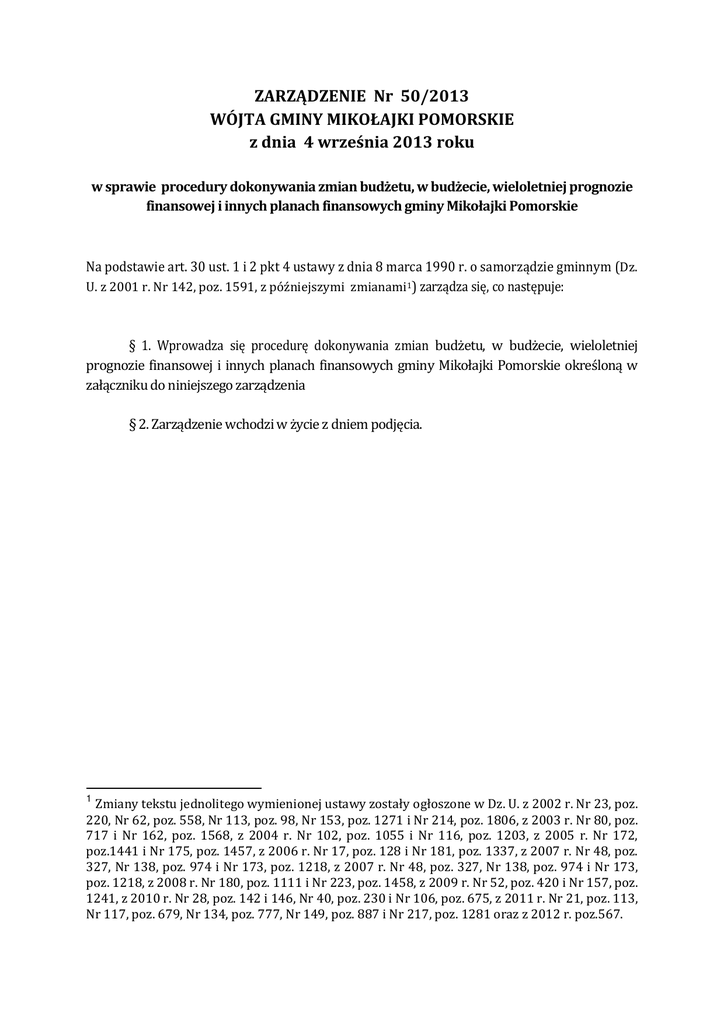 ZARZĄDZENIE Nr 50/2013 WÓJTA GMINY MIKOŁAJKI POMORSKIE z dnia 4 września 2013 roku w sprawie procedury dokonywania zmian budżetu, w budżecie, wieloletniej prognozie finansowej i innych planach finansowych gminy Mikołajki Pomorskie Na podstawie art. 30 ust. 1 i 2 pkt 4 ustawy z dnia 8 marca 1990 r. o samorządzie gminnym (Dz. U. z 2001 r. Nr 142, poz. 1591, z późniejszymi zmianami1) zarządza się, co następuje: § 1. Wprowadza się procedurę dokonywania zmian budżetu, w budżecie, wieloletniej prognozie finansowej i innych planach finansowych gminy Mikołajki Pomorskie określoną w załączniku do niniejszego zarządzenia § 2. Zarządzenie wchodzi w życie z dniem podjęcia. 1 Zmiany tekstu jednolitego wymienionej ustawy zostały ogłoszone w Dz. U. z 2002 r. Nr 23, poz. 220, Nr 62, poz. 558, Nr 113, poz. 98, Nr 153, poz. 1271 i Nr 214, poz. 1806, z 2003 r. Nr 80, poz. 717 i Nr 162, poz. 1568, z 2004 r. Nr 102, poz. 1055 i Nr 116, poz. 1203, z 2005 r. Nr 172, poz.1441 i Nr 175, poz. 1457, z 2006 r. Nr 17, poz. 128 i Nr 181, poz. 1337, z 2007 r. Nr 48, poz. 327, Nr 138, poz. 974 i Nr 173, poz. 1218, z 2007 r. Nr 48, poz. 327, Nr 138, poz. 974 i Nr 173, poz. 1218, z 2008 r. Nr 180, poz. 1111 i Nr 223, poz. 1458, z 2009 r. Nr 52, poz. 420 i Nr 157, poz. 1241, z 2010 r. Nr 28, poz. 142 i 146, Nr 40, poz. 230 i Nr 106, poz. 675, z 2011 r. Nr 21, poz. 113, Nr 117, poz. 679, Nr 134, poz. 777, Nr 149, poz. 887 i Nr 217, poz. 1281 oraz z 2012 r. poz.567. Załącznik do Zarządzenia Nr 50/2013 Wójta Gminy Mikołajki Pomorskie z dnia 04 .09.2013 r. Procedura dokonywania zmian budżetu, w budżecie, w wieloletniej prognozie finansowej i innych planach finansowych gminy Mikołajki Pomorskie Cel i zakres stosowania procedury Wprowadzenie procedury ma na celu określenie szczegółowego sposobu postępowania przy dokonywaniu zmian w budżecie gminy Mikołajki Pomorskie. 1. Zmiany budżetu, w budżecie, w wieloletniej prognozie finansowej i innych planach finansowych gminy Mikołajki Pomorskie dokonuje: 1) Rada Gminy Mikołajki Pomorskie 2) Wójt Gminy Mikołajki Pomorskie W drodze uchwały Rady Gminy Mikołajki Pomorskie dokonywane są zmiany w 1.1. zakresie: a) Zmiany planu dochodów, z wyjątkiem dotacji celowych przekazywanych z budżetu państwa lub jednostek samorządu terytorialnego, b) Przeniesienia planu wydatków między działami klasyfikacji budżetowej, c) zmiany wyniku budżetu ( deficytu lub nadwyżki), d) zmiany w zakresie dotacji udzielonych z budżetu gminy , e) zmian limitów zobowiązań i kwot wydatków na przedsięwzięcia ujęte w Wieloletniej Prognozie Finansowej, f) pozostałe zmiany wynikające z realizacji budżetu, które nie zostały wprowadzone zarządzeniami Wójta: 1.2. W drodze zarządzeniami Wójta Gminy Mikołajki Pomorskie dokonywane są : a) zmiany wielkości dochodów i wydatków związanych ze zmianą kwot dotacji ujętych w budżecie lub uzyskaniem innych dotacji celowych przekazanych z budżetu państwa oraz z budżetów innych jednostek samorządu terytorialnego, b) przeniesienia planu wydatków pomiędzy rozdziałami i paragrafami klasyfikacji budżetowej, z wyłączeniem przeniesień wydatków między działami klasyfikacji budżetowej, c) przenoszenia wydatków z rezerw budżetowych, zgodnie z planowanym przeznaczeniem wydatków, d) przeniesienia wydatków pomiędzy zadaniami inwestycyjnymi w ramach działu nie powodujących zmian w przedsięwzięciach wieloletniej prognozie finansowej. 2. Dokumenty stanowiące podstawę dokonywania zmian w budżecie gminy: 2.1 .decyzje Ministra Finansów o zmianach kwot subwencji oraz wpływów z tytułu udziału w podatkach stanowiących dochód budżetu państwa, 2.2 .decyzje dysponentów środków budżetu państwa o kwotach dotacji celowych, 2.3 .porozumienia i umowy przyznające dotacje, 2.4 .decyzje, porozumienia i umowy o dofinansowanie realizacji zadań gminy, 2.5. uchwały Rady Gminy, 2.6 .pisemne wnioski dysponentów budżetu (referatów organizacyjnych Urzędu Gminy Mikołajki Pomorskie oraz jednostek organizacyjnych gminy Mikołajki Pomorskie) o dokonanie zmian w budżecie gminy. 3. Zakres wniosku o dokonanie zmian w budżecie. 3.1. Wniosek o dokonanie zmian w budżecie winien zawierać w szczegółowości: Nazwę jednostki lub referatu, Źródło finansowania wydatku lub źródło dochodu, klasyfikację budżetową, opis proponowanej zmiany sporządzany wg wzoru do niniejszej procedury, w tym; - kwotę wnioskowanej zmiany ( zwiększenie , zmniejszenie), - uzasadnienie proponowanej zmiany , w przypadku zadań inwestycyjnych -nazwę zadania. 3.2. W przypadku zmian wydatków na realizację programu, projektu lub zadania ze środków z budżetu unii Europejskiej lub innych źródeł zagranicznych nie podlegających zwrotowi należy podać nazwę zadania, nazwę programu europejskiego, zakres proponowanych zmian, dołączyć umowę bądź aneks do umowy. 3.3. Propozycje zmian przedsięwzięć ujętych w Wieloletniej Prognozie Finansowej należy przedkładać w formie tabelarycznej oraz opisowej wg załączonego wzoru. 4. Terminy składania wniosków 4.1. Zasadą generalną obowiązującą przy składaniu wniosków o dokonanie zmian budżetu, w budżecie i wieloletniej prognozie finansowej jest zasada składania wniosków na bieżąco w momencie stwierdzenia wystąpienia potrzeby dokonania zmian bez zbędnej zwłoki. 4.2. Dla wniosków wprowadzanych do budżetu przez Radę Gminy ustala się termin maksymalny do 14 dni przed planowanym terminem posiedzenia Rady Gminy. 4.3. Ostateczny termin składania wniosków w roku kalendarzowym upływa z dniem 30 listopada danego roku. 4.4. W miesiącu grudniu przeniesienia mogą dotyczyć jedynie szczegółowych okoliczności, które są wynikiem np. wyroków sądowych, wypadków losowych, nieprzewidzianych okoliczności powodujących wzrost wydatków. 5. Obieg składanych wniosków 5.1 .Wnioski o dokonanie zmian należy składać do skarbnika Gminy, który dokonuje