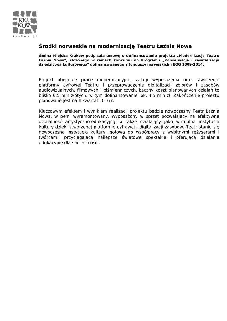 Środki norweskie na modernizację Teatru Łaźnia Nowa Gmina Miejska Kraków podpisała umowę o dofinansowanie projektu „Modernizacja Teatru Łaźnia Nowa", złożonego w ramach konkursu do Programu „Konserwacja i rewitalizacja dziedzictwa kulturowego" dofinansowanego z funduszy norweskich i EOG 2009-2014. Projekt obejmuje prace modernizacyjne, zakup wyposażenia oraz stworzenie platformy cyfrowej Teatru i przeprowadzenie digitalizacji zbiorów i zasobów audiowizualnych, filmowych i piśmienniczych. Łączny koszt planowanych działań to blisko 6,5 mln złotych, w tym dofinansowanie: ok. 4,5 mln zł. Zakończenie projektu planowane jest na II kwartał 2016 r. Kluczowym efektem i wynikiem realizacji projektu będzie nowoczesny Teatr Łaźnia Nowa, w pełni wyremontowany, wyposażony w sprzęt pozwalający na efektywną działalność artystyczno-edukacyjną, a także działający jako wirtualna instytucja kultury dzięki stworzonej platformie cyfrowej i digitalizacji zasobów. Teatr stanie się nowoczesną instytucją kultury, gotową do współpracy z wybitnymi reżyserami i twórcami, przyciągającą najlepsze światowe spektakle i oferującą działania edukacyjne dla społeczności. Powered by TCPDF (www.tcpdf.org)