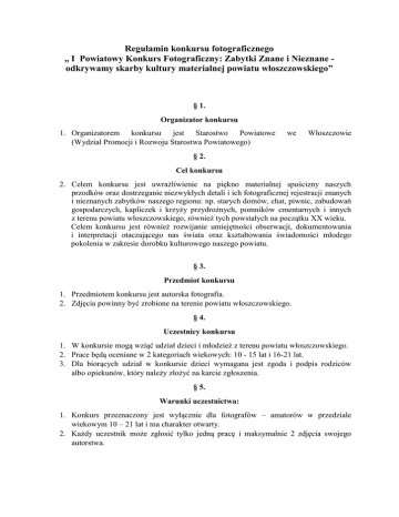 Regulamin konkursu fotograficznego „ I Powiatowy Konkurs Fotograficzny: Zabytki Znane i Nieznane odkrywamy skarby kultury materialnej powiatu włoszczowskiego” § 1. Organizator konkursu 1. Organizatorem konkursu jest Starostwo Powiatowe (Wydział Promocji i Rozwoju Starostwa Powiatowego) we Włoszczowie § 2. Cel konkursu 2. Celem konkursu jest uwrażliwienie na piękno materialnej spuścizny naszych przodków oraz dostrzeganie niezwykłych detali i ich fotograficznej rejestracji znanych i nieznanych zabytków naszego regionu: np. starych domów, chat, piwnic, zabudowań gospodarczych, kapliczek i krzyży przydrożnych, pomników cmentarnych i innych z terenu powiatu włoszczowskiego, również tych powstałych na początku XX wieku. Celem konkursu jest również rozwijanie umiejętności obserwacji, dokumentowania i interpretacji otaczającego nas świata oraz kształtowania świadomości młodego pokolenia w zakresie dorobku kulturowego naszego powiatu. § 3. Przedmiot konkursu 1. Przedmiotem konkursu jest autorska fotografia. 2. Zdjęcia powinny być zrobione na terenie powiatu włoszczowskiego. § 4. Uczestnicy konkursu 1. W konkursie mogą wziąć udział dzieci i młodzież z terenu powiatu włoszczowskiego. 2. Prace będą oceniane w 2 kategoriach wiekowych: 10 - 15 lat i 16-21 lat. 3. Dla biorących udział w konkursie dzieci wymagana jest zgoda i podpis rodziców albo opiekunów, który należy złożyć na karcie zgłoszenia. § 5. Warunki uczestnictwa: 1. Konkurs przeznaczony jest wyłącznie dla fotografów – amatorów w przedziale wiekowym 10 – 21 lat i ma charakter otwarty. 2. Każdy uczestnik może zgłosić tylko jedną pracę i maksymalnie 2 zdjęcia swojego autorstwa. 3. Fotografie powinny zostać przesłane w 2 wersjach - papierowej oraz elektronicznej. W formie papierowej zdjęcia powinny mieć wymiar 15x21 cm, cyfrowe w formacie jpg i wymiarze nie mniejszym niż 3 MB. 4. Zgłoszenie pracy polega na wypełnieniu formularza i przesłanie wraz z opisem oraz adresem e-mail, nr. telefonu kontaktowego i datą urodzenia uczestnika konkursu. 5. Organizator nie odsyła zgłoszonych prac. 6. Organizator zastrzega sobie prawo do niezakwalifikowania do konkursu zgłoszonej pracy ze względu na niezgodność z regulaminem, dyskryminujący charakter zdjęcia, obrazę uczuć religijnych lub inne treści niezgodne z przepisami powszechnie obowiązującego prawa bądź zasadami współżycia społecznego. 7. Prace przesłane po przekroczeniu tej daty nie będą uwzględniane przy ocenie konkursowej. 8. Uczestnik, zgłaszając się do konkursu oświadcza, iż przysługują mu wyłączne i nieograniczone prawa autorskie do nadesłanych fotografii. Ponadto oświadcza, że wyraża zgodę na wielokrotne, nieodpłatne publikowanie nagrodzonych fotografii oraz o publikowanie jego imienia, nazwiska oraz miejscowości zamieszkania w materiałach promocyjnych związanych z konkursem, na stronach internetowych Organizatora Konkursu, a także na ich wykorzystywanie w celach promocyjnych i marketingowych, w szczególności na utrwalanie, modyfikowanie i zwielokrotnianie fotografii każdą techniką, w tym m. in. drukarską, reprograficzną, zapisu magnetycznego, cyfrową, audiowizualną, na jakichkolwiek nośnikach, bez ograniczeń co do ilości i wielkości nakładu, oraz rozpowszechnianie fotografii poprzez publiczne udostępnianie w taki sposób, aby każdy mógł mieć do nich dostęp w miejscu i w czasie przez siebie wybranym, w szczególności w sieciach komputerowych i internecie oraz telefonach komórkowych. § 6. Terminarz 1. Konkurs trwa od 03.04.2017 roku do 15.05 2017 roku. W tym czasie odbywa się zgłaszanie prac. 2. Prace należy przesyłać na adres Wydział Promocji i Rozwoju Starostwa Powiatowego we Włoszczowie, ul Wiśniowa 10, 29-100 Włoszczowa w kopercie z dopiskiem „Konkurs Fotograficzny” lub dostarczyć osobiście - pok. 224, w godzinach pracy urzędu (730 – 1530). 3. Laureaci zostaną wyłonieni przez Jury konkursu powołane przez organizatora, która przyzna nagrody w dwóch ww. kategoriach wiekowych. 4. Finał Konkursu: prezentacja prac konkursowych oraz oficjalne ogłoszenie wyników i wręczenie nagród odbędzie się podczas Włoszczowskiej Familiady w dniu 28.05.2017r. § 7. Nagrody 1. Nagrody w konkursie ufundowane zostaną przez Starostwo Powiatowe we Włoszczowie. 2. Nagrody nie podlegają wymianie na ekwiwalent pieniężny albo na inną nagrodę. 3. Laureaci zostają poinformowani o wygranej w konkursie w przeciągu 7 dni od daty zakończenia konkursu. § 8. Postanowienia końcowe 1. Organizator zastrzega sobie prawo zmiany niniejszego regulaminu. 2. W sprawach nieuregulowanych niniejszym Regulaminem stosuje się przepisy prawa polskiego. 3. Niniejszy Regulamin dostępny jest w na stronie internetowej http://www.powiatwloszczowa.pl oraz w wersji papierowej w siedzibie Organizatora. 4. Zgłoszenie do konkursu jest równoznaczne z akceptacją niniejszego regulaminu.