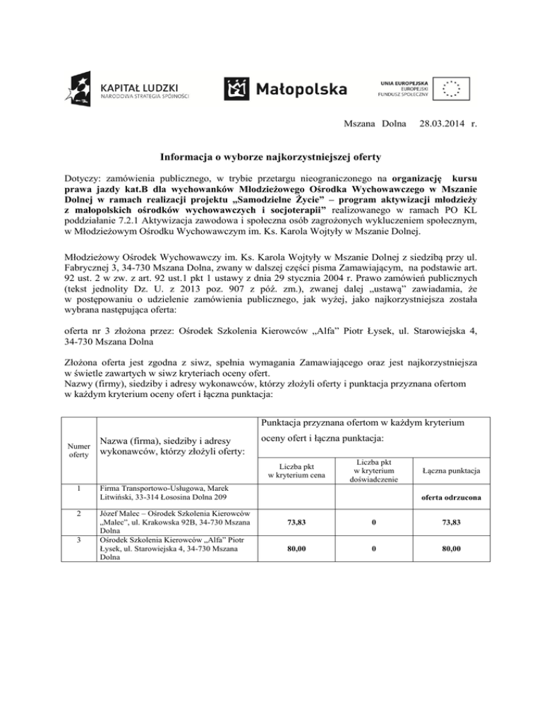 Mszana Dolna 28.03.2014 r. Informacja o wyborze najkorzystniejszej oferty Dotyczy: zamówienia publicznego, w trybie przetargu nieograniczonego na organizację kursu prawa jazdy kat.B dla wychowanków Młodzieżowego Ośrodka Wychowawczego w Mszanie Dolnej w ramach realizacji projektu „Samodzielne Życie” – program aktywizacji młodzieży z małopolskich ośrodków wychowawczych i socjoterapii” realizowanego w ramach PO KL poddziałanie 7.2.1 Aktywizacja zawodowa i społeczna osób zagrożonych wykluczeniem społecznym, w Młodzieżowym Ośrodku Wychowawczym im. Ks. Karola Wojtyły w Mszanie Dolnej. Młodzieżowy Ośrodek Wychowawczy im. Ks. Karola Wojtyły w Mszanie Dolnej z siedzibą przy ul. Fabrycznej 3, 34-730 Mszana Dolna, zwany w dalszej części pisma Zamawiającym, na podstawie art. 92 ust. 2 w zw. z art. 92 ust.1 pkt 1 ustawy z dnia 29 stycznia 2004 r. Prawo zamówień publicznych (tekst jednolity Dz. U. z 2013 poz. 907 z póź. zm.), zwanej dalej „ustawą” zawiadamia, że w postępowaniu o udzielenie zamówienia publicznego, jak wyżej, jako najkorzystniejsza została wybrana następująca oferta: oferta nr 3 złożona przez: Ośrodek Szkolenia Kierowców „Alfa” Piotr Łysek, ul. Starowiejska 4, 34-730 Mszana Dolna Złożona oferta jest zgodna z siwz, spełnia wymagania Zamawiającego oraz jest najkorzystniejsza w świetle zawartych w siwz kryteriach oceny ofert. Nazwy (firmy), siedziby i adresy wykonawców, którzy złożyli oferty i punktacja przyznana ofertom w każdym kryterium oceny ofert i łączna punktacja: Punktacja przyznana ofertom w każdym kryterium Numer oferty Nazwa (firma), siedziby i adresy wykonawców, którzy złożyli oferty: oceny ofert i łączna punktacja: Liczba pkt w kryterium cena 1 2 3 Liczba pkt w kryterium doświadczenie Firma Transportowo-Usługowa, Marek Litwiński, 33-314 Łososina Dolna 209 Józef Malec – Ośrodek Szkolenia Kierowców „Malec”, ul. Krakowska 92B, 34-730 Mszana Dolna Ośrodek Szkolenia Kierowców „Alfa” Piotr Łysek, ul. Starowiejska 4, 34-730 Mszana Dolna Łączna punktacja oferta odrzucona 73,83 0 73,83 80,00 0 80,00