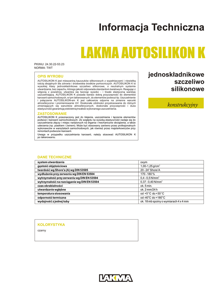 Informacja Techniczna LAKMA AUTOSILIKON K PKWiU: 24.30.22-53.23 NORMA: TWT OPIS WYROBU AUTOSILIKON K jest mieszanin¹ kauczuków silikonowych z wype³niaczami i niewielk¹ ioœci¹ obojêtnych dla zdrowia i œrodowiska œrodków pomocniczych. AUTOSILIKON K to wysokiej klasy jednosk³adnikowe szczeliwo silikonowe, o neutralnym systemie utwardzania, bez zapachu, którego jakoœæ odpowiada standardom œwiatowym. Reaguj¹c z wilgoci¹ z powietrza, utwardza siê tworz¹c wysoko - i trwale elastyczn¹ warstwê uszczelniaj¹c¹. AUTOSILIKON K posiada bardzo dobr¹ przyczepnoœæ do elementów karoserii samochodowych, w tym lakierowanych, do elementów podwozi itp. Uszczelnienie i po³¹czenie AUTOSILIKON-em K jest ca³kowicie odporne na zmienne warunki atmosferyczne i promieniowanie UV. Doskona³e zdolnoœci przystosowania do ró¿nych zmieniaj¹cych siê warunków atmosferycznych, doskona³a przyczepnoœæ i du¿a elastycznoœæ gwarantuj¹ wieloletni¹ trwa³oœæ wykonanego uszczelnienia. jednosk³adnikowe szczeliwo silikonowe konstrukcyjny ZASTOSOWANIE AUTOSILIKON K przeznaczony jest do klejenia, uszczelniania i ³¹czenia elementów podwozi i karoserii samochodowych. Ze wzglêdu na wysok¹ elastycznoœæ nadaje siê do uszczelniania z³¹czy i miejsc nara¿onych na drgania i mechaniczne obci¹¿enia, a tak¿e uderzenia (np. piaskiem i ¿wirem). Mo¿e byæ stosowany zarówno przez profesjonalnych wykonawców w warsztatach samochodowych, jak równie¿ przez majsterkowiczów przy remontach podwozia i karoserii. Uwaga w przypadku uszczelniania karoserii, nale¿y stosowaæ AUTOSILIKON K po lakierowaniu. DANE TECHNICZNE system utwardzania gêstoœæ objêtoœciowa twardoœæ wg Shore'a (A) wg DIN 53505 wyd³u¿enie przy zerwaniu wg DIN EN 53504 wytrzyma³oœæ przy zerwaniu wg DIN EN 53504 wytrzyma³oœæ na rozci¹ganie wg DIN EN 53504 czas obrabialnoœci utwardzanie wg³êbne temperatura stosowania odpornoœæ termiczna wydajnoœæ z jednej tuby KOLORYSTYKA czarny oxym 1,00-1,25 g/cm3 20 - 24o Shore’A 170 - 180 % 0,4 - 0,5 N/mm2 2 0,37 - 0,40 N/mm ok. 5 min. ok. 2 mm/24 h od +5 o C do +30 o C od -40oC do +180o C ok. 18 mb spoiny o wymiarach 4 x 4 mm SPOSÓB STOSOWANIA Dobra przyczepnoœæ AUTOSILIKON-u K uzale¿niona jest od w³aœciwego przygotowania powierzchni. Uszczelniane powierzchnie powinny byæ czyste, suche, wolne od olejów, smarów, rdzy itp. Pozosta³oœci poprzedniego uszczelnienia nale¿y dok³adnie usun¹æ. Aby uchroniæ powierzchnie przed zabrudzeniem nale¿y stosowaæ taœmy maskuj¹ce lub foliê. Obci¹æ koñcówkê kartusza (tuby o poj. 300 ml) i nakrêciæ aplikator przyciêty do odpowiedniej œrednicy. Po w³o¿eniu kartusza do pistoletu poci¹gn¹æ powoli r¹czkê w celu uzyskania jednostajnego wyp³ywu szczeliwa silikonowego. Na³o¿ony AUTOSILIKON K mo¿na wyg³adzaæ szpachelk¹ zmoczon¹ w wodzie z dodatkiem detergentu. Stosowaæ narzêdzia z tworzywa sztucznego lub stali nierdzewnej. Zabrudzone narzêdzia zalecamy natychmiast wytrzeæ rêcznikiem papierowym i umyæ rozcieñczalnikiem nitro. SK£ADOWANIE 12 miesiêcy od daty produkcji. OPAKOWANIA 80 ml, 300 ml BHP i P.Po¿. Produkt nieutwardzony mo¿e dzia³aæ dra¿ni¹co na drogi oddechowe i skórê. Chroniæ oczy przed kontaktem z SILIKON-em. W przypadku zabrudzenia nale¿y przemyæ oczy du¿¹ iloœci¹ wody i zasiêgn¹æ porady lekarskiej. Chroniæ przed dzieæmi ! Stosowaæ w przewietrzanych pomieszczeniach. ATESTY Ocena Higieniczna nr B-828/94 wydana przez PZH w Warszawie. Aprobata Techniczna nr K-2139/95 wydana przez ITB w Warszawie. LAKMA S.A. 43-400 Cieszyn, ul. Frysztacka 173, Dzia³ Sprzeda¿y: tel. (033) 85 21 688, fax (033) 85 10 255 LAKMA S.A. nie odpowiada za jakoœæ wymalowañ w przypadku nieprzestrzegania powy¿szych zaleceñ.