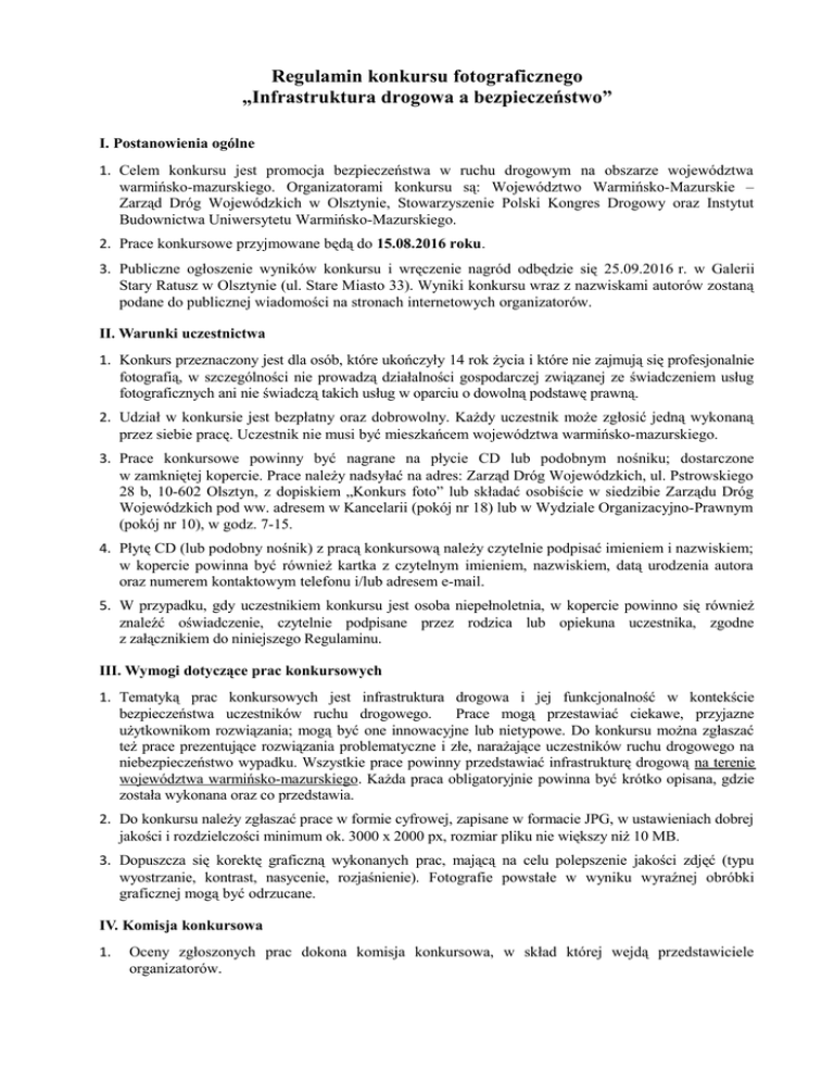 Regulamin konkursu fotograficznego „Infrastruktura drogowa a bezpieczeństwo” I. Postanowienia ogólne 1. Celem konkursu jest promocja bezpieczeństwa w ruchu drogowym na obszarze województwa warmińsko-mazurskiego. Organizatorami konkursu są: Województwo Warmińsko-Mazurskie – Zarząd Dróg Wojewódzkich w Olsztynie, Stowarzyszenie Polski Kongres Drogowy oraz Instytut Budownictwa Uniwersytetu Warmińsko-Mazurskiego. 2. Prace konkursowe przyjmowane będą do 15.08.2016 roku. 3. Publiczne ogłoszenie wyników konkursu i wręczenie nagród odbędzie się 25.09.2016 r. w Galerii Stary Ratusz w Olsztynie (ul. Stare Miasto 33). Wyniki konkursu wraz z nazwiskami autorów zostaną podane do publicznej wiadomości na stronach internetowych organizatorów. II. Warunki uczestnictwa 1. Konkurs przeznaczony jest dla osób, które ukończyły 14 rok życia i które nie zajmują się profesjonalnie fotografią, w szczególności nie prowadzą działalności gospodarczej związanej ze świadczeniem usług fotograficznych ani nie świadczą takich usług w oparciu o dowolną podstawę prawną. 2. Udział w konkursie jest bezpłatny oraz dobrowolny. Każdy uczestnik może zgłosić jedną wykonaną przez siebie pracę. Uczestnik nie musi być mieszkańcem województwa warmińsko-mazurskiego. 3. Prace konkursowe powinny być nagrane na płycie CD lub podobnym nośniku; dostarczone w zamkniętej kopercie. Prace należy nadsyłać na adres: Zarząd Dróg Wojewódzkich, ul. Pstrowskiego 28 b, 10-602 Olsztyn, z dopiskiem „Konkurs foto” lub składać osobiście w siedzibie Zarządu Dróg Wojewódzkich pod ww. adresem w Kancelarii (pokój nr 18) lub w Wydziale Organizacyjno-Prawnym (pokój nr 10), w godz. 7-15. 4. Płytę CD (lub podobny nośnik) z pracą konkursową należy czytelnie podpisać imieniem i nazwiskiem; w kopercie powinna być również kartka z czytelnym imieniem, nazwiskiem, datą urodzenia autora oraz numerem kontaktowym telefonu i/lub adresem e-mail. 5. W przypadku, gdy uczestnikiem konkursu jest osoba niepełnoletnia, w kopercie powinno się również znaleźć oświadczenie, czytelnie podpisane przez rodzica lub opiekuna uczestnika, zgodne z załącznikiem do niniejszego Regulaminu. III. Wymogi dotyczące prac konkursowych 1. Tematyką prac konkursowych jest infrastruktura drogowa i jej funkcjonalność w kontekście bezpieczeństwa uczestników ruchu drogowego. Prace mogą przestawiać ciekawe, przyjazne użytkownikom rozwiązania; mogą być one innowacyjne lub nietypowe. Do konkursu można zgłaszać też prace prezentujące rozwiązania problematyczne i złe, narażające uczestników ruchu drogowego na niebezpieczeństwo wypadku. Wszystkie prace powinny przedstawiać infrastrukturę drogową na terenie województwa warmińsko-mazurskiego. Każda praca obligatoryjnie powinna być krótko opisana, gdzie została wykonana oraz co przedstawia. 2. Do konkursu należy zgłaszać prace w formie cyfrowej, zapisane w formacie JPG, w ustawieniach dobrej jakości i rozdzielczości minimum ok. 3000 x 2000 px, rozmiar pliku nie większy niż 10 MB. 3. Dopuszcza się korektę graficzną wykonanych prac, mającą na celu polepszenie jakości zdjęć (typu wyostrzanie, kontrast, nasycenie, rozjaśnienie). Fotografie powstałe w wyniku wyraźnej obróbki graficznej mogą być odrzucane. IV. Komisja konkursowa 1. Oceny zgłoszonych prac dokona komisja konkursowa, w skład której wejdą przedstawiciele organizatorów. 2. Komisja konkursowa zastrzega sobie prawo do dyskwalifikacji zdjęć nierealizujących tematu konkursu lub niespełniających innych jego zasad. 3. Decyzje komisji konkursowej są ostateczne i nie podlegają weryfikacji. V. Kryteria oceny 1. Komisja konkursowa będzie oceniać prace pod kątem zbieżności z tematyką i założeniami konkursu oraz walorów artystycznych i estetycznych. 2. Z udziału w konkursie mogą zostać wykluczone prace niespełniające kryteriów formalnych konkursu (słaba jakość zdjęć, zbyt mała rozdzielczość, brak opisu lokalizacji lub danych autora itp.) oraz zdjęcia, na których znajdują się dodatkowe znaki i grafiki (daty, znaki wodne, podpisy, ramki). VI. Nagrody 1. Organizatorzy uhonorują nagrodami zdobywców I, II i III miejsca oraz zastrzegają sobie prawo do przyznania 3 wyróżnień. 2. Nagrodą będzie również wystawa prac zwycięskich, wyróżnionych oraz innych prac konkursowych wybranych przez organizatorów, prezentowana w Galerii Stary Ratusz w Olsztynie. 3. Laureaci zostaną powiadomieni o werdykcie komisji konkursowej drogą e-mailową lub telefoniczną i zaproszeni na ceremonię publicznego ogłoszenia wyników. VII Postanowienia końcowe 1. Uczestnik konkursu, z chwilą zgłoszenia pracy do konkursu, oświadcza, że: • wyraża zgodę na przetwarzanie jego danych osobowych zgodnie z ustawą o ochronie danych osobowych z dnia 29 sierpnia 1997 r. (Dz.U. z 2015 poz. 2135 z późn. zm.) w zakresie i celu niezbędnym dla przeprowadzenia konkursu z jego udziałem; zgoda jest dobrowolna, jest jednak niezbędna dla udziału w konkursie, • akceptuje niniejszy Regulamin, • jest autorem zdjęć oraz posiada zgodę osób biorących udział przy ich powstawaniu na uczestnictwo w konkursie oraz publikację; odpowiedzialność za wszelkie roszczenia osób trzecich, które mogłyby w związku z wykonanym zdjęciem zostać skierowane do organizatorów konkursu, przyjmuje na siebie uczestnik konkursu, • udziela organizatorom konkursu nieodpłatnej licencji niewyłącznej, uprawniającej organizatorów do korzystania ze zgłoszonych zdjęć przez czas nieoznaczony oraz bez ograniczeń terytorialnych na wszystkich polach eksploatacji, a w szczególności obejmującej uprawnienie do: - utrwalania, - zwielokrotnienia wszelkimi technikami, w tym przede wszystkim techniką drukarską, - wprowadzenia do obrotu w kraju i za granicą, - wprowadzenia do pamięci komputera - publikacji na stronach internetowych i w innych materiałach organ