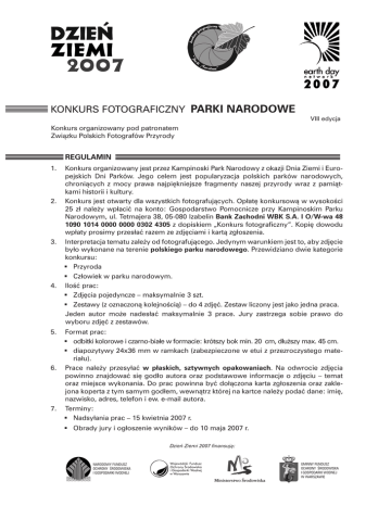 KONKURS FOTOGRAFICZNY PARKI NARODOWE VIII edycja Konkurs organizowany pod patronatem Związku Polskich Fotografów Przyrody REGULAMIN 1. 2. 3. 4. 5. 6. 7. Konkurs organizowany jest przez Kampinoski Park Narodowy z okazji Dnia Ziemi i Europejskich Dni Parków. Jego celem jest popularyzacja polskich parków narodowych, chroniących z mocy prawa najpiękniejsze fragmenty naszej przyrody wraz z pamiątkami historii i kultury. Konkurs jest otwarty dla wszystkich fotografujących. Opłatę konkursową w wysokości 25 zł należy wpłacić na konto: Gospodarstwo Pomocnicze przy Kampinoskim Parku Narodowym, ul. Tetmajera 38, 05-080 Izabelin Bank Zachodni WBK S.A. I O/W-wa 48 1090 1014 0000 0000 0302 4305 z dopiskiem „Konkurs fotograficzny”. Kopię dowodu wpłaty prosimy przesłać razem ze zdjęciami i kartą zgłoszenia. Interpretacja tematu zależy od fotografującego. Jedynym warunkiem jest to, aby zdjęcie było wykonane na terenie polskiego parku narodowego. Przewidziano dwie kategorie konkursu: § Przyroda § Człowiek w parku narodowym. Ilość prac: § Zdjęcia pojedyncze – maksymalnie 3 szt. § Zestawy (z oznaczoną kolejnością) – do 4 zdjęć. Zestaw liczony jest jako jedna praca. Jeden autor może nadesłać maksymalnie 3 prace. Jury zastrzega sobie prawo do wyboru zdjęć z zestawów. Format prac: § odbitki kolorowe i czarno-białe w formacie: krótszy bok min. 20 cm, dłuższy max. 45 cm. § diapozytywy 24x36 mm w ramkach (zabezpieczone w etui z przezroczystego materiału). Prace należy przesyłać w płaskich, sztywnych opakowaniach. Na odwrocie zdjęcia powinno znajdować się godło autora oraz podstawowe informacje o zdjęciu – temat oraz miejsce wykonania. Do prac powinna być dołączona karta zgłoszenia oraz zaklejona koperta z tym samym godłem, wewnątrz której na kartce należy podać dane: imię, nazwisko, adres, telefon i ew. e-mail autora. Terminy: § Nadsyłania prac – 15 kwietnia 2007 r. § Obrady jury i ogłoszenie wyników – do 10 maja 2007 r. Dzień Ziemi 2007 finansują: NARODOWY FUNDUSZ OCHRONY ŚRODOWISKA I GOSPODARKI WODNEJ GMINNY FUNDUSZ OCHRONY ŚRODOWISKA I GOSPODARKI WODNEJ W WARSZAWIE 8. Adres nadsyłania: Kampinoski Park Narodowy, ul. Tetmajera 38, 05-080 Izabelin, z dopiskiem „Konkurs Fotograficzny” 9. Wszystkie prace będą traktowane z największą starannością, jednak organizatorzy nie biorą na siebie odpowiedzialności za ich ewentualne uszkodzenie lub zaginięcie w transporcie pocztowym. 10. Oceny prac dokona powołane przez organizatora jury, składające się m.in. z przedstawicieli organizatora, związków i stowarzyszeń twórczych. 11. Nagrody: § GRAND PRIX § Kategoria „Przyroda” – Nagrody I, II, III oraz wyróżnienia § Kategoria „Człowiek w Parku Narodowym” – I nagroda oraz wyróżnienia § Nagroda Dyrektora Kampinoskiego Parku Narodowego za najładniejsze zdjęcie Kampinoskiego Parku Narodowego. Autorzy zdjęć zakwalifikowanych do wystawy otrzymają pamiątkowe dyplomy. Jury zastrzega sobie prawo do innego podziału nagród. Decyzja jury jest ostateczna. 12. Organizatorzy zastrzegają sobie prawo do bezpłatnej reprodukcji prac uczestników konkursu w katalogu imprezy, na stronie internetowej organizatora oraz prasie i TV w celu reklamy konkursu. 13. Prace nagrodzone, wyróżnione oraz zakwalifikowane do wystawy będą eksponowane na wystawie pokonkursowej. Będzie ona otwarta 17 maja 2007 r. w Centrum Edukacji Kampinoskiego Parku Narodowego w Izabelinie jako jeden z elementów centralnych obchodów Dnia Ziemi 2007. Później, wzorem lat ubiegłych będzie eksponowana w kilku innych miejscach na terenie całego kraju. 14. Zwrot diapozytywów oraz prac, które nie zostały zakwalifikowane do wystawy pokonkursowej do 30 sierpnia 2007. 15. Nadesłanie prac oznacza akceptację warunków konkursu. 16. Nagrody – materiały i sprzęt fotograficzny, nagrody ufundowane przez sponsorów. INFORMACJE Komisarz konkursu: Grzegorz Okołów, tel. 0 22 721 83 91 do 93 e-mail: [email protected] KARTA ZGŁOSZENIA GODŁO …………………… lp tytuł ilość zdjęć (dotyczy zestawów) miejsce kategoria