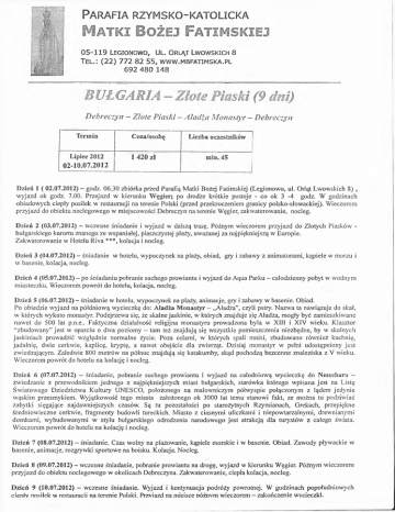 Pa r a f ia r z y m s k o - k a t o l ic k a 05-119 Le g io n o w o , Ul . O rląt Lw o w s k ic h 8 T e l .: (22) 772 82 55, w w w . m b f a t im s k a . pl 692 480 148 Debręczyn Termia Lipiec 2012 — Złote Piaski Aładża Monastyr —Debreczyn — Ceaa/osoSję 1 420 z5 Liczba uczestników 4:3 02-10.07.2012 Dzień 1 ( 02.07.2012) —godz. 06.30 zbiórka przed Parafią Matki Bożej Fatimskiej (Legionowo, ul. Orląt Lwowskich 8) , wyjazd ok godz. 7.00. Przejazd w kierunku Węgier; po drodze krótkie postoje - co ok 3 -4 godz. W godzinach obiadowych ciepły posiłek w restauracji na terenie Polski (przed przekroczeniem granicy polsko-słowackiej). Wieczorem przyjazd do obiektu noclegowego w miejscowości Debreczyn na terenie Węgier, zakwaterowanie, nocleg. Dzień 2 (03.07.2012) - wczesne śniadanie i wyjazd w dalszą trasę. Późnym wieczorem przyjazd do Złotych Piasków bułgarskiego kurortu znanego ze wspaniałej, piaszczystej plaży, uważanej za najpiękniejszą w Europie. Zakwaterowanie w Hotelu Riva ***, kolacja i nocleg. Dzień 3 (04.07.2012) - śniadanie w hotelu, wypoczynek na plaży, obiad, gry i zabawy z animatorami, kąpiele w morzu i w basenie, kolacja, nocleg. Dzień 4 (05.07.2012) - po śniadaniu pobranie suchego prowiantu i wyjazd do Aqua Parku —całodzienny pobyt w wodnym miasteczku. Wieczorem powrót do hotelu, kolacja, nocleg. Dzień 5 (06.07.2012)- śniadanie w hotelu, wypoczynek na plaży, animacje, gry i zabawy w basenie. Obiad. Po obiedzie wyjazd na półdniową wycieczkę do: AJladża Monastyr - „Aładża”, czyli pstry. Nazwa ta nawiązuje do skał, w których wykuto monastyr. Podejrzewa się, że skalne jaskinie, w których znajduje się Aładża, mogły być zamieszkiwane nawet do 500 lat p.n.e.. Faktyczna działalność religijna monastyru prowadzona była w X III i XIV wieku. Klasztor “zbudowany” jest w oparciu o dwa poziomy - tam też znajdują się wszystkie pomieszczenia niezbędne, by w skalnych jaskiniach prowadzić względnie normalne życie. Poza celami, w których spali mnisi, zbudowano również kuchnię, jadalnię, dwie cerkwie, kaplicę, kiyptę, a nawet obejście dla zwierząt. Dzisiaj monastyr w pełni udostępniony jest zwiedzającym. Zaledwie 800 metrów na północ znajdują się katakumby, skąd pochodzą bezcenne znaleziska z V wieku. Wieczorem powrót do hotelu na kolację i nocleg. Dzień 6 (07.07.2012) - śniadanie, pobranie suchego prowiantu i wyjazd na całodniową wycieczkę do Nessebaru — zwiedzanie z przewodnikiem jednego z najpiękniejszych miast bułgarskich, starówka którego wpisana jest na Listę Światowego Dziedzictwa Kultury UNESCO, położonego na malowniczym półwyspie połączonym z lądem jedynie wąskim przesmykiem. Wyjątkowość tego miasta założonego ok 3000 lat temu stanowi fakt, ze można tu podziwiać zabytki sięgające najdawniejszych czasów. Są tu pozostałości po starożytnych Rzymianach, Grekach, przepiękne średniowieczne cerkwie, fragmenty budowli tureckich. Miasto z ciasnymi uliczkami i niepowtarzalnymi, drewnianymi domkami, wybudowanymi w stylu bułgarskiego odrodzenia narodowego jest atrakcją dla turystów z całego świata. Wieczorem powrót do hotelu na kolację i nocleg. Dzień 7 (08.07.2012) - śniadanie. Czas wolny na plażowanie, kąpiele morskie i w basenie. Obiad. Zawody pływackie w basenie, animacje, rozgrywki sportowe na boisku. Kolacja. Nocleg. Dzień 8 (09.07.2012) - wczesne śniadanie, pobranie prowiantu na drogę, wyjazd w kierunku Węgier. Późnym wieczorem przyjazd do obiektu noclegowego w okolicach Debreczyna. Zakwaterowanie, ciepła kolacja, nocleg. Dzień 9 (10.07.2012) - wczesne śniadanie. Wyjazd i kontynuacja podróży powrotnej. W godzinach popołudniowych cier>łv nosiłek w restauracii na terenie Polski. Przviazd na mieisce DÓźnvm wieczorem —zakończenie wycieczki. S S S S S S S S S S S Cena \ 420 zł obejmuje następujące świadczenia: transport autokarem (uchylne siedzenia, klimatyzacja lub nawiewy, video lub DVD), 2 noclegi tranzytowe w drodze „tam” i „z powrotem” w obiekcie noclegowym w okolicach Debreczyna na Węgrzech - pokoje 3,4,5 osobowe z łazienkami, 6 noclegów w hotelu *** w Złotych Piaskach w pokojach 4,5 osobowych (przestronnych 28 - 35 m.kw.) z łazienkami (kabiny prysznicowe), balkonami, telefonem, TV- sat, małą lodówką, klimatyzacją, wyżywienie: 2 śniadania i 1 ciepła kolacja przy noclegach tranzytowych; 6 śniadań, 4 obiady i 6 kolacji w formie bufetu -z napojami do posiłków (woda, soki) w hotelu w Złotych Piaskach. Podczas wycieczki do Aqua Parku oraz w ostatnim dniu pobytu -paczki prowiantowe zamiast obiadu (2), 2 ciepłe posiłki w w restauracji na terenie Polski (jadąc „tam” i „z powrotem”), wycieczki zawarte w programie : Aładża Monastyr oraz wyjazd do Aqua Parku, bilety wstępu do zwiedzanych obiektów, przewodnik lokalny (tam, gdzie jest to konieczne), opiekę wykwalifikowanego pilota, ubezpieczenie turystyczne NNW, KL, bagaż, opłatę klimatyczną w hotelu, konkursy utrwalające wiadomości z drobnymi nagrodami. DODATKOWE INFORMACJE: S S cena obowiązuje przy grupie liczącej min. 45 osób należy zabrać ze sobą ręczniki kąpielowe i odpowiedni strój na baseny SPOTKANIE INFORMACYJNE W NIEDZIELE 11.03.2012 O GODZ. 16.30 W KAPLICY