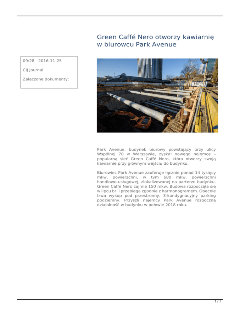 Green Caffé Nero otworzy kawiarnię w biurowcu Park Avenue 09:28 2016-11-25 CIJ Journal Załączone dokumenty: Park Avenue, budynek biurowy powstający przy ulicy Wspólnej 70 w Warszawie, zyskał nowego najemcę – popularną sieć Green Caffé Nero, która otworzy swoją kawiarnię przy głównym wejściu do budynku. Biurowiec Park Avenue zaoferuje łącznie ponad 14 tysięcy mkw. powierzchni, w tym 680 mkw. powierzchni handlowo-usługowej, zlokalizowanej na parterze budynku. Green Caffé Nero zajmie 150 mkw. Budowa rozpoczęła się w lipcu br. i przebiega zgodnie z harmonogramem. Obecnie trwa wykop pod przestronny, 3-kondygnacyjny parking podziemny. Przyszli najemcy Park Avenue rozpoczną działalność w budynku w połowie 2018 roku. 1/1