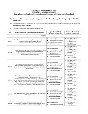 PROGRAM KSZTAŁCENIA DLA STUDIÓW PODYPLOMOWYCH Podyplomowe Studium Pomocy Psychologicznej w Dziedzinie Seksuologii 1) Nazwa studiów podyplomowych: Podyplomowe Studium Pomocy Psychologicznej w Dziedzinie Seksuologii 2) Liczba punktów ECTS konieczna do uzyskania kwalifikacji odpowiadających studiom podyplomowym: 75 (bez stażu)/ 90 (ze stażem) 3) Efekty kształcenia dla studiów podyplomowych: Lp. Sposób weryfikacji efektów kształcenia Efekty kształcenia dla studiów podyplomowych Sposób dokumentacji efektów kształcenia WIEDZA K_W01 Posiada zaawansowaną wiedzę dotyczącą biologicznych (w zakresie anatomii i fizjologii) podstaw funkcjonowania seksualnego człowieka Ocena formująca: Dyskusja podczas zajęć Ocena podsumowująca: Egzamin pisemny Posiada szczegółową i zaawansowaną wiedzę dotyczącą charakterystyki przebiegu rozwoju seksualnego człowieka przez wszystkie fazy (dzieciństwo, dorastanie, dorosłość i starość). Ocena formująca: Dyskusja podczas zajęć Wykonanie ćwiczeń warsztatowych Ocena podsumowująca: Egzamin pisemny Posiada zaawansowaną wiedzę dotyczącą genezy i mechanizmów powstawania zaburzeń identyfikacji płciowej, zaburzeń preferencji seksualnych i dysfunkcji seksualnych. Ocena formująca: Dyskusja podczas zajęć Wykonanie ćwiczeń warsztatowych Ocena podsumowująca: Egzamin pisemny K_W02 K_W03 K_W04 Zna wybrane narzędzia diagnostyczne użyteczne w pracy psychologa – seksuologa (metody kwestionariuszowe, wywiadu klinicznego i projekcyjne) oraz klasyfikacje zaburzeń zdrowia seksualnego (ICD10 i DSM-IV), a także jest zorientowany w aktualnej, odbywającej się w gremiach specjalistów, polemice dotyczącej ewolucji klasyfikacji zaburzeń seksualnych Ocena formująca: Dyskusja podczas zajęć Wykonanie ćwiczeń warsztatowych Ocena podsumowująca: Egzamin pisemny K_W05 K_W06 Zna i rozumie idee i zasady prowadzenia poradnictwa i edukacji seksualnej. Posiada wiedzę dotyczącą terapii zaburzeń seksualnych, tj. założeń Terapii Seksuologicznej, form i rodzajów interwencji seksuologicznej, form Ocena formująca: Dyskusja podczas zajęć Wykonanie ćwiczeń warsztatowych Ocena podsumowująca: Egzamin pisemny Ocena formująca: Dyskusja podczas zajęć Karta udziału w zajęciach wykładowych Protokół egzaminacyjny Karta udziału w zajęciach wykładowych Karta zaliczeniowa ćwiczeń warsztatowych Protokół egzaminacyjny Karta udziału w zajęciach wykładowych Karta zaliczeniowa ćwiczeń warsztatowych Protokół egzaminacyjny Karta udziału w zajęciach wykładowych Karta zaliczeniowa ćwiczeń warsztatowych Protokół egzaminacyjny Karta udziału w zajęciach wykładowych Karta zaliczeniowa ćwiczeń warsztatowych Protokół egzaminacyjny Karta udziału w zajęciach wykładowych 1 psychoterapii i farmakoterapii w leczeniu zaburzeń seksualnych. K_W07 Posiada wiedzę dotyczącą problematyki przemocy seksualnej uwzględniającą perspektywy prawną, socjologiczną i psychologiczną, tj. posiada wiedzę dotyczącą charakterystyki przestępstw seksualnych, obowiązujących definicji wykorzystania seksualnego, zasad i form diagnozy i terapii ofiar wykorzystania, zasad i form diagnozy i terapii sprawców wykorzystania, zasad i form tworzenia opinii sądowych w sprawach seksuologicznych. Wykonanie ćwiczeń warsztatowych Ocena podsumowująca: Egzamin pisemny Ocena formująca: Dyskusja podczas zajęć Wykonanie ćwiczeń warsztatowych Ocena podsumowująca: Egzamin pisemny Karta zaliczeniowa ćwiczeń warsztatowych Protokół egzaminacyjny Karta udziału w zajęciach wykładowych Karta zaliczeniowa ćwiczeń warsztatowych Protokół egzaminacyjny UMIEJĘTNOŚCI K_U01 Posiada umiejętność dostrzeżenia i rozumienia biologicznych uwarunkowań zachowań seksualnych spotykanych w praktyce klinicznej i potrafi wskazać odpowiedniego specjalistę zajmującego się tymi uwarunkowaniami Ocena formująca: Dyskusja podczas zajęć Wykonanie ćwiczeń warsztatowych Ocena podsumowująca: Egzamin pisemny Ocena formująca: Dyskusja podczas zajęć Wykonanie ćwiczeń warsztatowych Ocena podsumowująca: Egzamin pisemny K_U02 Rozpoznaje, potrafi opisać i ocenić czynniki sprzyjające i zagrażające zdrowiu seksualnemu człowieka w każdej fazie rozwoju, na tle koncepcji rozwoju life-span. K_U03 Potrafi wysuwać i weryfikować hipotezy dotyczące genezy i mechanizmów powstawania zaburzeń identyfikacji płciowej, zaburzeń preferencji seksualnych i dysfunkcji seksualnych, spotkanych w praktyce klinicznej. Ocena formująca: Dyskusja podczas zajęć Wykonanie ćwiczeń warsztatowych K_U04 Potrafi dobrać i zastosować narzędzia diagnostyczne w procesie diagnozy pacjenta seksuologicznego i wykorzystać ich wyniki do całościowej diagnozy rozwoju psychoseksualnego pacjenta, z uwzględnieniem różnych rodzajów norm istniejących w seksuologii. Ocena formująca: Dyskusja podczas zajęć Wykonanie ćwiczeń warsztatowych K_U05 Potrafi zaprojektować działania w zakresie poradnictwa i edukacji seksualnej dla osób z różnych grup wiekowych, kontekstów środowiskowych i życiowych (dla osób zdrowych i zaburzonych). Ocena formująca: Dyskusja podczas zajęć Wykonanie ćwiczeń warsztatowych K_U06 K_U07 Potrafi dostosować odpowiednią formę terapii seksuologicznej do potrzeb pacjenta z problemem seksualnym. Potrafi zaprojektować działania diagnostyczne i terapeutyczne wobec ofiary i sprawcy przemocy seksualnej, z uwzględnieniem poziomu psychoseksualnego rozwoju podmiotu oddziaływań. Ocena formująca: Dyskusja podczas zajęć Wykonanie ćwiczeń warsztatowych Ocena podsumowująca: Egzamin pisemny Ocena formująca: Dyskusja podczas zajęć Wykonanie ćwiczeń warsztatowych Karta zaliczeniowa ćwiczeń warsztatowych Protokół egzaminacyjny Karta udziału w zajęciach wykładowych Karta zaliczeniowa ćwiczeń warsztatowych Karta zaliczeniowa ćwiczeń warsztatowych Karta udziału w zajęciach wykładowych Karta zaliczeniowa ćwiczeń warsztatow
