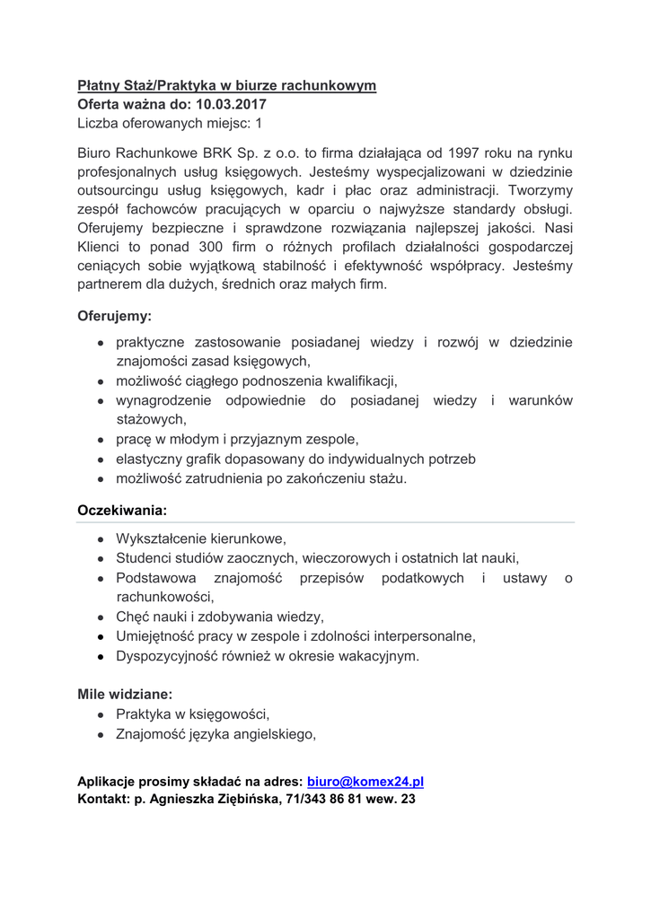 Płatny Staż/Praktyka w biurze rachunkowym Oferta ważna do: 10.03.2017 Liczba oferowanych miejsc: 1 Biuro Rachunkowe BRK Sp. z o.o. to firma działająca od 1997 roku na rynku profesjonalnych usług księgowych. Jesteśmy wyspecjalizowani w dziedzinie outsourcingu usług księgowych, kadr i płac oraz administracji. Tworzymy zespół fachowców pracujących w oparciu o najwyższe standardy obsługi. Oferujemy bezpieczne i sprawdzone rozwiązania najlepszej jakości. Nasi Klienci to ponad 300 firm o różnych profilach działalności gospodarczej ceniących sobie wyjątkową stabilność i efektywność współpracy. Jesteśmy partnerem dla dużych, średnich oraz małych firm. Oferujemy: praktyczne zastosowanie posiadanej wiedzy i rozwój w dziedzinie znajomości zasad księgowych, możliwość ciągłego podnoszenia kwalifikacji, wynagrodzenie odpowiednie do posiadanej wiedzy i warunków stażowych, pracę w młodym i przyjaznym zespole, elastyczny grafik dopasowany do indywidualnych potrzeb możliwość zatrudnienia po zakończeniu stażu. Oczekiwania: Wykształcenie kierunkowe, Studenci studiów zaocznych, wieczorowych i ostatnich lat nauki, Podstawowa znajomość przepisów podatkowych i ustawy rachunkowości, Chęć nauki i zdobywania wiedzy, Umiejętność pracy w zespole i zdolności interpersonalne, Dyspozycyjność również w okresie wakacyjnym. Mile widziane: Praktyka w księgowości, Znajomość języka angielskiego, Aplikacje prosimy składać na adres: [email protected] Kontakt: p. Agnieszka Ziębińska, 71/343 86 81 wew. 23 o