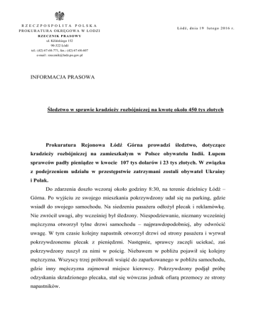 RZECZPOSPOLITA POLSKA PROKURATURA OKRĘGOWA W ŁODZI Ł ó d ź , d n i a 1 9 l u t e go 2 0 1 6 r . RZE CZNIK P RASOWY ul. Kilińskiego 152 90-322 Łódź tel.: (42) 67-68-771, fax.: (42) 67-68-607 e-mail : [email protected] INFORMACJA PRASOWA Śledztwo w sprawie kradzieży rozbójniczej na kwotę około 450 tys złotych Prokuratura Rejonowa Łódź Górna prowadzi śledztwo, dotyczące kradzieży rozbójniczej na zamieszkałym w Polsce obywatelu Indii. Łupem sprawców padły pieniądze w kwocie 107 tys dolarów i 23 tys złotych. W związku z podejrzeniem udziału w przestępstwie zatrzymani zostali obywatel Ukrainy i Polak. Do zdarzenia doszło wczoraj około godziny 8:30, na terenie dzielnicy Łódź – Górna. Po wyjściu ze swojego mieszkania pokrzywdzony udał się na parking, gdzie wsiadł do swojego samochodu. Na siedzeniu pasażera odłożył plecak i reklamówkę. Nie zwrócił uwagi, aby wcześniej był śledzony. Niespodziewanie, nieznany wcześniej mężczyzna otworzył tylne drzwi samochodu – najprawdopodobniej, aby odwrócić uwagę. W tym czasie kolejny napastnik otworzył drzwi od strony pasażera i wyrwał pokrzywdzonemu plecak z pieniędzmi. Następnie, sprawcy zaczęli uciekać, zaś pokrzywdzony ruszył za nimi w pościg. Niebawem w pobliżu pojawił się kolejny mężczyzna. Wszyscy trzej próbowali wsiąść do zaparkowanego w pobliżu samochodu, gdzie inny mężczyzna zajmował miejsce kierowcy. Pokrzywdzony podjął próbę odzyskania skradzionego plecaka, stał się wówczas jednak ofiarą przemocy ze strony napastników. 2 Podjęte czynności doprowadziły do zatrzymania dwóch mężczyzn, podejrzanych o udział w zdarzeniu. Do jutra prokurator zdecyduje, czy przedstawione im zostaną zarzuty. Rzecznik Prasowy Prokuratury Okręgowej w Łodzi Krzysztof Kopania