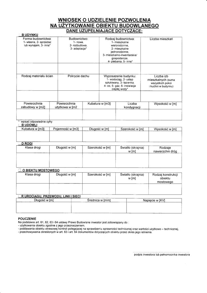O UDZIELEN!E POZWOLENIA IE OBIEKTU BUDOWLANEGO DANE UZUPEŁNIAJACE DOTYCZACE: Forma budownictwa: 1 - własna, 2- sprzedaż |ub wynajem, 3- inna* Rodzaj budownictwa: Budownictwo: ,1_ ,1- nowe, 2- rozbudowa, 3- adaptacja" Liczba mieszkań mieszkalne wielorodzinne, 2- mieszkaIne jednorodzinne, 3- mieszkalno_inwentarskie/ gospodarcze, 4- plebania, 5- inne* Rodzaj materiału ścian Pokrycie dachu Liczbaizb Wyposazenie budynku: 1- wodociąg, 2- ustęp mieszkalnych (suma spłukiwany, 3- łazienka, 4- co, 5- gaz, 6- instaIacja powierzchnia powierzchnia zabudowv w Im2'| uzvtkowa w [m2 Kubatura w [m3] wszystkich pokoi i kuchni w budynku) Liczba Wysokośc w knnrlvnnanii [m] * wpisać odpowiednłe cyfry l B UDoWLl (skrajnia) Długoścw [m] Dłuooścw lml PoUczENlE Na podstawie art, 61 (skrajnia) srednica w [mml ,62,63 i 64 ustawy Prawo Budowlane inwestor jest zobowiązany do Napiecie w [KVl : - użytkowania obiektu zgodnie z jego przeznaczeniem, - poddawania obiektu okresowej kontroli polegającej na sprawdzeniu sprawności technicznej oraz wańości użytkowo - przechowywania określonych w art. 63 i art. 64 dokumentów dotyczących obiektu przez okres jego istnienia. - technicznej, podpis inwestora lub pełnomocnika inwestora