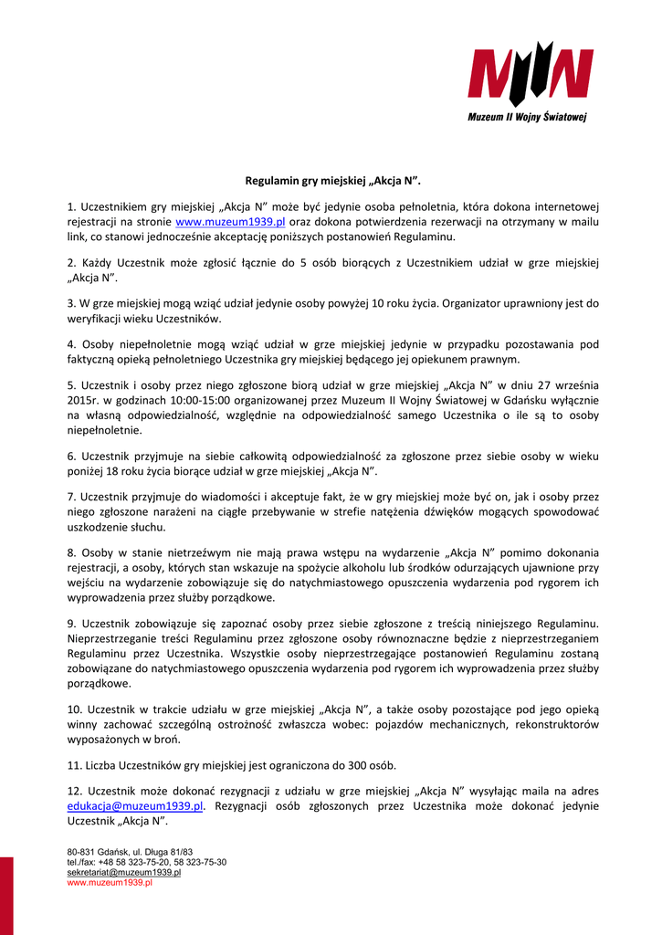 Regulamin gry miejskiej „Akcja N”. 1. Uczestnikiem gry miejskiej „Akcja N” może być jedynie osoba pełnoletnia, która dokona internetowej rejestracji na stronie www.muzeum1939.pl oraz dokona potwierdzenia rezerwacji na otrzymany w mailu link, co stanowi jednocześnie akceptację poniższych postanowień Regulaminu. 2. Każdy Uczestnik może zgłosić łącznie do 5 osób biorących z Uczestnikiem udział w grze miejskiej „Akcja N”. 3. W grze miejskiej mogą wziąć udział jedynie osoby powyżej 10 roku życia. Organizator uprawniony jest do weryfikacji wieku Uczestników. 4. Osoby niepełnoletnie mogą wziąć udział w grze miejskiej jedynie w przypadku pozostawania pod faktyczną opieką pełnoletniego Uczestnika gry miejskiej będącego jej opiekunem prawnym. 5. Uczestnik i osoby przez niego zgłoszone biorą udział w grze miejskiej „Akcja N” w dniu 27 września 2015r. w godzinach 10:00-15:00 organizowanej przez Muzeum II Wojny Światowej w Gdańsku wyłącznie na własną odpowiedzialność, względnie na odpowiedzialność samego Uczestnika o ile są to osoby niepełnoletnie. 6. Uczestnik przyjmuje na siebie całkowitą odpowiedzialność za zgłoszone przez siebie osoby w wieku poniżej 18 roku życia biorące udział w grze miejskiej „Akcja N”. 7. Uczestnik przyjmuje do wiadomości i akceptuje fakt, że w gry miejskiej może być on, jak i osoby przez niego zgłoszone narażeni na ciągłe przebywanie w strefie natężenia dźwięków mogących spowodować uszkodzenie słuchu. 8. Osoby w stanie nietrzeźwym nie mają prawa wstępu na wydarzenie „Akcja N” pomimo dokonania rejestracji, a osoby, których stan wskazuje na spożycie alkoholu lub środków odurzających ujawnione przy wejściu na wydarzenie zobowiązuje się do natychmiastowego opuszczenia wydarzenia pod rygorem ich wyprowadzenia przez służby porządkowe. 9. Uczestnik zobowiązuje się zapoznać osoby przez siebie zgłoszone z treścią niniejszego Regulaminu. Nieprzestrzeganie treści Regulaminu przez zgłoszone osoby równoznaczne będzie z nieprzestrzeganiem Regulaminu przez Uczestnika. Wszystkie osoby nieprzestrzegające postanowień Regulaminu zostaną zobowiązane do natychmiastowego opuszczenia wydarzenia pod rygorem ich wyprowadzenia przez służby porządkowe. 10. Uczestnik w trakcie udziału w grze miejskiej „Akcja N”, a także osoby pozostające pod jego opieką winny zachować szczególną ostrożność zwłaszcza wobec: pojazdów mechanicznych, rekonstruktorów wyposażonych w broń. 11. Liczba Uczestników gry miejskiej jest ograniczona do 300 osób. 12. Uczestnik może dokonać rezygnacji z udziału w grze miejskiej „Akcja N” wysyłając maila na adres [email protected]. Rezygnacji osób zgłoszonych przez Uczestnika może dokonać jedynie Uczestnik „Akcja N”. 80-831 Gdańsk, ul. Długa 81/83 tel./fax: +48 58 323-75-20, 58 323-75-30 [email protected] www.muzeum1939.pl 13. Organizator zastrzega sobie prawo do odwołania gry miejskiej „Akcja N” bez podania przyczyny. W takim przypadku Uczestnikom oraz osobom przez nich zgłoszonym nie przysługują żadne roszczenia o zwrot kosztów lub inne. 80-831 Gdańsk, ul. Długa 81/83 tel./fax: +48 58 323-75-20, 58 323-75-30 [email protected] www.muzeum1939.pl