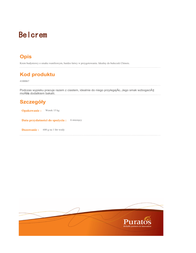 Belcrem Opis Krem budyniowy o smaku waniliowym, bardzo łatwy w przygotowaniu. Idealny do bułeczek Chinois. Kod produktu 4100067 Podczas wypieku pracuje razem z ciastem, idealnie do niego przylegajÄ… c. Jego smak wzbogacić moż na dodatkiem bakalii. Szczegóły Opakowanie : Worek 15 kg Data przydatności do spożycia : Dozowanie : 600 g na 1 litr wody 6 miesięcy