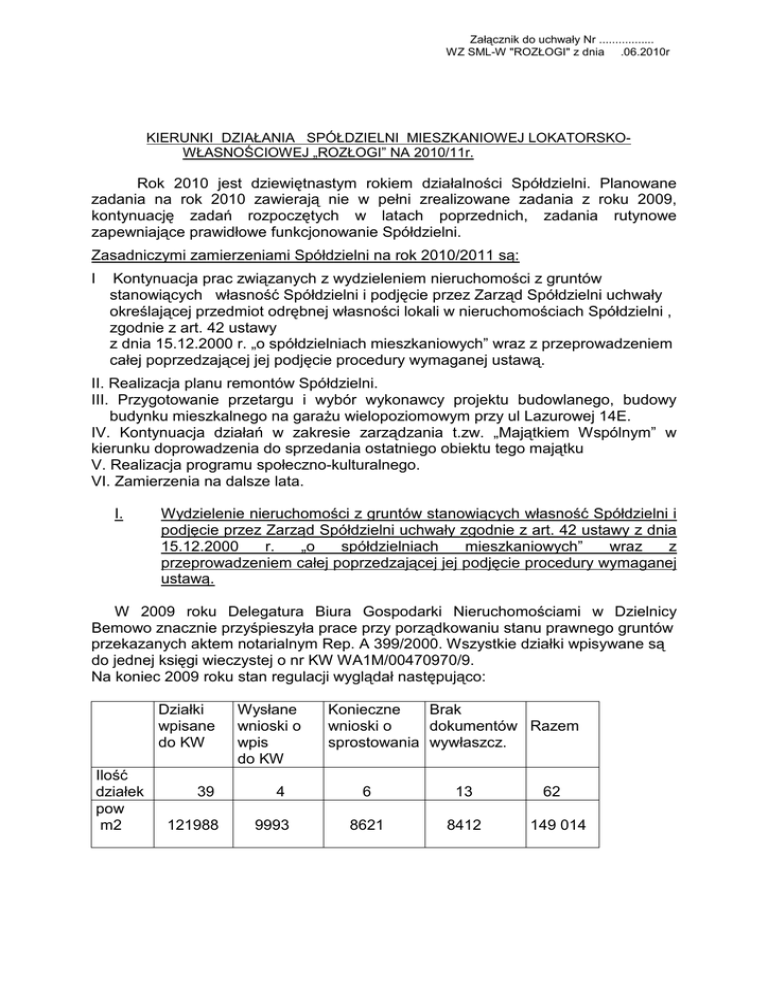 Załącznik do uchwały Nr ................. WZ SML-W "ROZŁOGI" z dnia .06.2010r KIERUNKI DZIAŁANIA SPÓŁDZIELNI MIESZKANIOWEJ LOKATORSKOWŁASNOŚCIOWEJ „ROZŁOGI” NA 2010/11r. Rok 2010 jest dziewiętnastym rokiem działalności Spółdzielni. Planowane zadania na rok 2010 zawierają nie w pełni zrealizowane zadania z roku 2009, kontynuację zadań rozpoczętych w latach poprzednich, zadania rutynowe zapewniające prawidłowe funkcjonowanie Spółdzielni. Zasadniczymi zamierzeniami Spółdzielni na rok 2010/2011 są: I Kontynuacja prac związanych z wydzieleniem nieruchomości z gruntów stanowiących własność Spółdzielni i podjęcie przez Zarząd Spółdzielni uchwały określającej przedmiot odrębnej własności lokali w nieruchomościach Spółdzielni , zgodnie z art. 42 ustawy z dnia 15.12.2000 r. „o spółdzielniach mieszkaniowych” wraz z przeprowadzeniem całej poprzedzającej jej podjęcie procedury wymaganej ustawą. II. Realizacja planu remontów Spółdzielni. III. Przygotowanie przetargu i wybór wykonawcy projektu budowlanego, budowy budynku mieszkalnego na garażu wielopoziomowym przy ul Lazurowej 14E. IV. Kontynuacja działań w zakresie zarządzania t.zw. „Majątkiem Wspólnym” w kierunku doprowadzenia do sprzedania ostatniego obiektu tego majątku V. Realizacja programu społeczno-kulturalnego. VI. Zamierzenia na dalsze lata. I. Wydzielenie nieruchomości z gruntów stanowiących własność Spółdzielni i podjęcie przez Zarząd Spółdzielni uchwały zgodnie z art. 42 ustawy z dnia 15.12.2000 r. „o spółdzielniach mieszkaniowych” wraz z przeprowadzeniem całej poprzedzającej jej podjęcie procedury wymaganej ustawą. W 2009 roku Delegatura Biura Gospodarki Nieruchomościami w Dzielnicy Bemowo znacznie przyśpieszyła prace przy porządkowaniu stanu prawnego gruntów przekazanych aktem notarialnym Rep. A 399/2000. Wszystkie działki wpisywane są do jednej księgi wieczystej o nr KW WA1M/00470970/9. Na koniec 2009 roku stan regulacji wyglądał następująco: Działki wpisane do KW Ilość działek pow m2 Wysłane wnioski o wpis do KW 39 4 121988 9993 Konieczne Brak wnioski o dokumentów Razem sprostowania wywłaszcz. 6 13 8621 8412 62 149 014 2 Jak dotąd, nie odnaleziono oryginalnych dokumentów wywłaszczeniowych na 13 działek: nr działki 24/24, 24/16, 24/15 4, 6/1, 6/2, 6/3, 6/4, 5 Poprzednia KW KW2419 Zlokalizowane obiekty powierzchnia m2 660 928 40 63 1 060 1 065 1 022 2 103 74 R14, cz.R12, cz.R11 24/25, 14/24 14/21 Osiedle Chrzanów MA KW20170 34 239 494 cz. R12 cz.S13, plac rekreacyjny 14/6 kol. Chrzanów lit. L dz. 4 630 parkingi R-S Po wpisie wszystkich gruntów Spółdzielni do księgi wieczystej, Zarząd może ogłosić przetarg na ponowny podział gruntów na nieruchomości zabudowane budynkami i opracować nową mapę podziału gruntów. Pozwoli to spełnić wymagania związane z określeniem przedmiotu odrębnej własności. Mapa zatwierdzona przez Walne Zgromadzenie, po wykreśleniu podziału na mapie miasta, zostanie przekazana do Ewidencji Gruntów Dzielnicy Bemowo w celu uzyskania postanowienia o podziale gruntów Spółdzielni na nieruchomości a następnie do sądu wieczystoksięgowego o założenie ksiąg wieczystych dla nowoutworzonych nieruchomości. Ogłoszenie przetargu na wykonanie podziału ostatecznego gruntów Spółdzielni jest konieczne do wystąpienia o zwrot kosztów podziału. Zarząd wspólnie z radcą prawnym będzie podejmował dalsze działania zmierzające do uregulowania stanu prawnego działek. Przypuszczamy, że Spółdzielnia zostanie wpisana do ksiąg wieczystych jako użytkownik wieczysty w ciągu półtora do dwóch lat. II. Realizacja planu remontów Spółdzielni. Plan remontów na 2010 r przewiduje: 3 Lp. 1. 2. 3. 4. 5. 6. 7. 8. 8. 10. 11. Nazwa robót remontowych Renowacja balustrad balkonowych Przygotowanie projektów do wymiany pionów kanalizacyjnych, wymiany C.W. i cyrkulacji, wymiany instalacji gazowej oraz remontu instalacji C.O. w budynkach Siemiatycka 5-15 Naprawa elewacji ściany płd S 11, S 13 + inne miejscowe Remont lub naprawa obróbek blacharskich z wymianą rynien R 13 oraz na części R 11, R 12, R 14 i R 15 Wymiana okienek piwnicznych Renowacja chodników i ciągów pieszo – jezdnych Remont wiatrołapów przy budynkach R 12 A, R 13, R 14, R 14A Wymiana opasek przy R 12 A, R 13, R 14, R 14A Przygotowanie podziału terenu na nieruchomości Usunięcie przecieków do garażu podziemnego L -14 D Rezerwa Razem Wymiana wind Koszty zł 1 090 000 130 000 100 000 100 000 80 000 50 000 45 000 65 000 20 000 60 000 60 000 1 800 000 w 2010 r. 295 000 w 2011 r. 405 000 1. Renowacja balustrad balkonowych Ze względu na stan techniczny renowacja zostanie wykonana w budynkach: Siemiatycka 7, Siemiatycka 9, Siemiatycka 13 i Rozłogi 13 – wykonanie do lipca 2010, oraz w terminie do 31 października w budynkach Rozłogi 11 i Rozłogi 12 - płatność w styczniu 2011r.- 690 tys. zł. Wykonawcy wybrani w drodze przetargu 2. Przygotowanie projektów do wymiany pionów kanalizacyjnych, wymiany C.W. i cyrkulacji ,wymiany instalacji gazowej i remontu instalacji C.O. w budynkach Siemiatycka. Na posiedzeniu plenarnym Rady Nadzorczej w dniu 25.02.2010 roku został przyjęty plan robót remontowych na lata 2011 – 2016. Plan ten przewiduje wymianę w pierwszej kolejności pionów ciepłej wody i cyrkulacji oraz pionów kanalizacyjnych i instalacji gazowej w budynkach Siemiatycka, następnie wymianę pionów kanalizacyjnych i instalacji gazowej w budynkach Rozłogi, a po zakończeniu tych robót przystąpienie do wymiany instalacji centralnego ogrzewania w budynkach Siemiatycka i Rozłogi – stare zasoby. Wykonanie kompletu projektów instalacji sanitarnych dla budynków Siemiatycka 5-15 będzie tańsze niż wykonywanie projektów dla każdej instalacji oddzielnie. 3. Niezbędne naprawy elewacji. Naprawy wymagają ściany południowe budynków Siemiatycka 13 i Siemiatycka 11, których wierzchnia wa