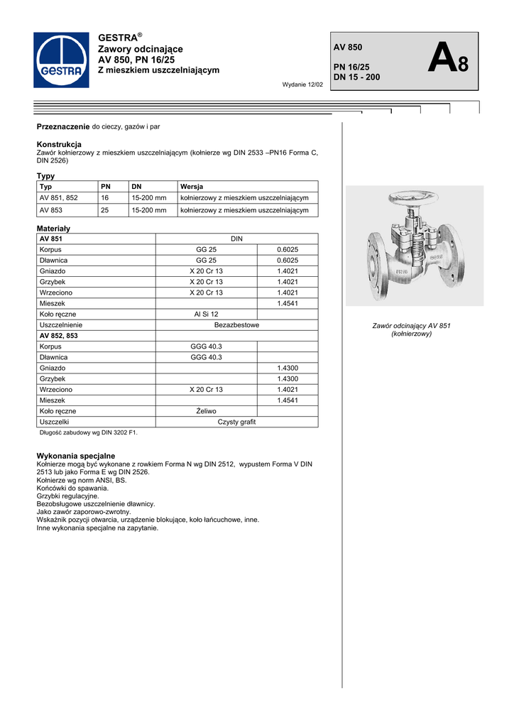 GESTRA® Zawory odcinające AV 850, PN 16/25 AV 850 PN 16/25 DN 15 - 200 Z mieszkiem uszczelniającym A8 Wydanie 12/02 Przeznaczenie do cieczy, gazów i par Konstrukcja Zawór kołnierzowy z mieszkiem uszczelniającym (kołnierze wg DIN 2533 –PN16 Forma C, DIN 2526) Typy Typ PN DN Wersja AV 851, 852 16 15-200 mm kołnierzowy z mieszkiem uszczelniającym AV 853 25 15-200 mm kołnierzowy z mieszkiem uszczelniającym Materiały AV 851 Korpus DIN GG 25 0.6025 Dławnica GG 25 0.6025 Gniazdo X 20 Cr 13 1.4021 Grzybek X 20 Cr 13 1.4021 Wrzeciono X 20 Cr 13 1.4021 Mieszek Koło ręczne Uszczelnienie 1.4541 Al Si 12 Bezazbestowe Zawór odcinający AV 851 (kołnierzowy) AV 852, 853 Korpus GGG 40.3 Dławnica GGG 40.3 Gniazdo 1.4300 Grzybek Wrzeciono 1.4300 X 20 Cr 13 Mieszek Koło ręczne Uszczelki 1.4021 1.4541 Żeliwo Czysty grafit Długość zabudowy wg DIN 3202 F1. Wykonania specjalne Kołnierze mogą być wykonane z rowkiem Forma N wg DIN 2512, wypustem Forma V DIN 2513 lub jako Forma E wg DIN 2526. Kołnierze wg norm ANSI, BS. Końcówki do spawania. Grzybki regulacyjne. Bezobsługowe uszczelnienie dławnicy. Jako zawór zaporowo-zwrotny. Wskaźnik pozycji otwarcia, urządzenie blokujące, koło łańcuchowe, inne. Inne wykonania specjalne na zapytanie. A8 POZNAŃ www.armaterm.pl AV 850 tel. +48 (61) 8488 431 fax +48 (61) 8488 431 e-mail: [email protected] PN 16/25 DN 15 - 200 __________________________________________________________________________________________________________________ Wymiary Wymiary i masy zaworu AV 851 PN 16 DN Długość zabudowy Wysokość otwartego zaworu Średnica kółka Masa mm L [mm] H [mm] d [mm] kg 15 20 25 32 40 50 65 80 100 125 150 200 130 150 160 180 200 230 290 310 350 400 480 600 160 160 175 175 200 200 220 245 305 360 400 460 100 100 100 100 160 160 200 200 250 250 315 315 3 4 5,5 7 9 11 19 23 36 57 75 130 Średnica kółka Masa Wymiary i masy zaworu AV 852, 853 PN DN Długość zabudowy Wysokość otwartego zaworu mm L [mm] H [mm] Zawór odcinający AV 851, 852, 853 15 20 25 32 40 50 65 80 100 125 150 200 16/25 16 130 150 160 180 200 230 290 310 350 400 480 600 148 148 150 150 175 200 230 285 330 390 425 485 d [mm] 852 100 100 100 100 120 120 160 200 250 300 300 400 853 100 100 120 120 160 160 200 250 300 400 400 kg 852 3 3,7 4,8 6 7,5 10,3 15,8 22 28 36 61 105 853 3,5 4 4,5 6,5 8,5 10,5 15,5 22 34 45 65 Temperatura stosowania i ciśnienie próbne. Typ PN AV 851 16 AV 852 16 AV 853 25 *zgodnie z DIN 2401 Ciśnienie próbne korpusu gniazda 25 16 24 16 37,5 25 Max. ciśn. robocze* w (barg) dla temp. w °C 20 120 200 250 300 350 16 16 13 10 16 15 13 13 11 10 25 24 21 20 18 16 W zapytaniu i przy zamawianiu prosimy podawać: AV ... DN...., PN.... Inne (np. typ kołnierza, wyposażenie dodatkowe, itp.) Dostawa wg naszych Ogólnych Warunków Dostawy Zastrzega się prawo do wprowadzania zmian konstrukcji i danych technicznych. GESTRA Polonia – Gdańsk –