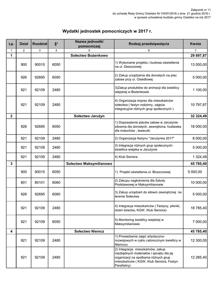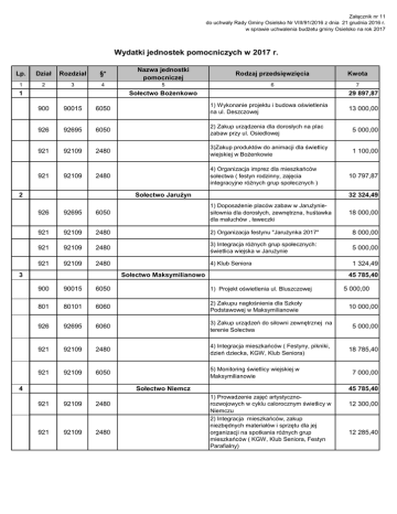Załącznik nr 11 do uchwały Rady Gminy Osielsko Nr VIII/91/2016 z dnia 21 grudnia 2016 r. w sprawie uchwalenia budżetu gminy Osielsko na rok 2017 Wydatki jednostek pomocniczych w 2017 r. Lp. Dział Rozdział §* Nazwa jednostki pomocniczej Rodzaj przedsięwzięcia Kwota 1 2 3 4 5 6 7 Sołectwo Bożenkowo 1 29 897,87 900 90015 6050 1) Wykonanie projektu i budowa oświetlenia na ul. Deszczowej 926 92695 6050 2) Zakup urządzenia dla dorosłych na plac zabaw przy ul. Osiedlowej 5 000,00 921 92109 2480 3)Zakup produktów do animacji dla świetlicy wiejskiej w Bożenkowie 1 100,00 921 92109 2480 4) Organizacja imprez dla mieszkańców sołectwa ( festyn rodzinny, zajęcia integracyjne różnych grup społecznych ) Sołectwo Jarużyn 2 13 000,00 10 797,87 32 324,49 926 92695 6050 1) Doposażenie placów zabaw w Jarużyniesiłownia dla dorosłych, zewnętrzna, huśtawka dla maluchów , ławeczki 921 92109 2480 2) Organizacja festynu "Jarużynka 2017" 8 000,00 921 92109 2480 3) Integracja różnych grup społecznych: świetlica wiejska w Jarużynie 5 000,00 921 92109 2480 4) Klub Seniora 1 324,49 Sołectwo Maksymilianowo 3 45 785,40 900 90015 6050 1) Projekt oświetlenia ul. Bluszczowej 801 80101 6060 2) Zakupu nagłośnienia dla Szkoły Podstawowej w Maksymilianowie 926 92695 6060 3) Zakup urządzeń do siłowni zewnętrznej na terenie Sołectwa 921 92109 2480 4) Integracja mieszkańców ( Festyny, pikniki, dzień dziecka, KGW, Klub Seniora) 921 92109 6050 5) Monitoring świetlicy wiejskiej w Maksymilianowie Sołectwo Niemcz 4 921 92109 2480 921 92109 2480 18 000,00 5 000,00 10 000,00 5 000,00 18 785,40 7 000,00 45 785,40 1) Prowadzenie zajęć artystycznorozwojowych w cyklu calorocznym świetlicy w Niemczu 2) Integracja mieszkańców, zakup niezbędnych materiałów i sprzętu dla jej organizacji na spotkania różnych grup mieszkańców ( KGW, Klub Seniora, Festyn Parafialny) 12 300,00 12 285,40 Załącznik nr 11 do uchwały Rady Gminy Osielsko Nr VIII/91/2016 z dnia 21 grudnia 2016 r. w sprawie uchwalenia budżetu gminy Osielsko na rok 2017 750 75095 4300 3) Administrowanie strony internetowej sołectwa Niemcz 900 90095 6050 4) Zagospodarowanie placu centralnego w Niemczu w ramach istniejącej koncepcji dokończenie III etapu parkingu Sołectwo Niwy-Wilcze 5 1 200,00 20 000,00 45 785,40 900 90015 6050 1) Budowa oświetlenia ul. Żywieckiej w Niwach 900 90015 6050 2) Rozbudowa oświetlenia ul. Ostromecka w Niwach 8 000,00 900 90015 6050 3) Rozbudowa oświetlenia ul. Szczecińska w Wilczu 7 000,00 926 92601 6050 921 92109 2480 4) Budowa oświetlenia boiska sołeckiego do gry w piłkę nożna w Wilczu 4) Imprezy intergracyje różnych grup społecznych, Klub Seniora Sołectwo Osielsko 6 13 000,00 14 000,00 3 785,40 45 785,40 900 90015 6050 1) Projekt oświetlenia ul. Cisowa w Osielsku 926 92695 6050 2) Zakup oraz montaż urządzeń siłowni zewnętrznej na place zabaw przy ul. Kolonijnej i Jaskółczej 900 90015 6050 3) Projekt oświetlenia ul. Grabowej, Limbowej i Rumiankowej w Osielsku 4 700,00 921 92109 2480 4) Zorganizowanie imprez środowiskowych dla dzieci i młodzieży oraz seniorów o chrakterze integracyjnym 9 000,00 926 92601 6050 5) Doposażanie obiektów rekreacyjnosportowych przy stadionie Bassebolowym ( urządzenia do ćwiczeń fizycznych oraz gier) 9 585,40 Sołectwo Żołędowo 7 2 500,00 20 000,00 45 785,40 921 92109 2480 1)Integracja wszystkich grup społecznych 40 785,40 801 80110 6060 2) Zakup mikrofonów do nagłośnienia dla Gimnazjum nr 1 w Żołędowie 5 000,00 Ogółem 291 149,36