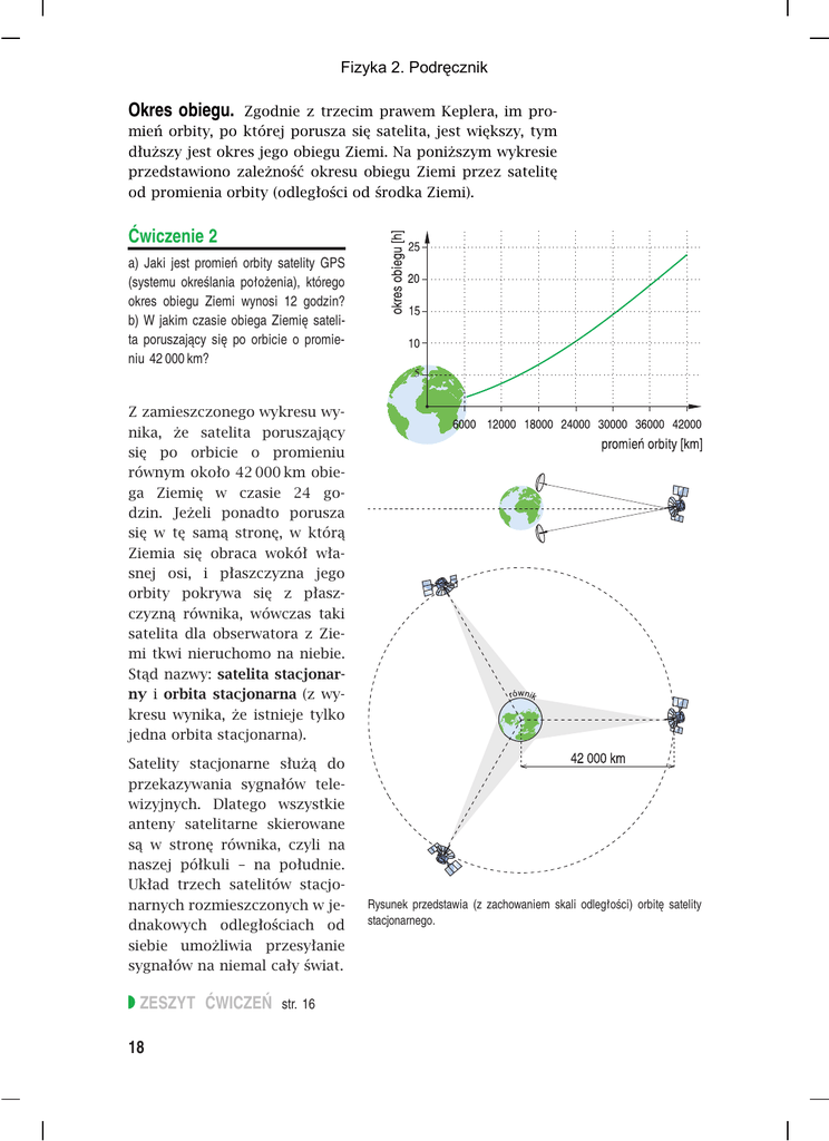 Fizyka 2. Podręcznik Okres obiegu. Zgodnie z trzecim prawem Keplera, im promień orbity, po której porusza się satelita, jest większy, tym dłuższy jest okres jego obiegu Ziemi. Na poniższym wykresie przedstawiono zależność okresu obiegu Ziemi przez satelitę od promienia orbity (odległości od środka Ziemi). Ćwiczenie 2 a) Jaki jest promień orbity satelity GPS (systemu określania położenia), którego okres obiegu Ziemi wynosi 12 godzin? b) W jakim czasie obiega Ziemię satelita poruszający się po orbicie o promieniu 42 000 km? Z zamieszczonego wykresu wynika, że satelita poruszający się po orbicie o promieniu równym około 42 000 km obiega Ziemię w czasie 24 godzin. Jeżeli ponadto porusza się w tę samą stronę, w którą Ziemia się obraca wokół własnej osi, i płaszczyzna jego orbity pokrywa się z płaszczyzną równika, wówczas taki satelita dla obserwatora z Ziemi tkwi nieruchomo na niebie. Stąd nazwy: satelita stacjonarny i orbita stacjonarna (z wykresu wynika, że istnieje tylko jedna orbita stacjonarna). Satelity stacjonarne służą do przekazywania sygnałów telewizyjnych. Dlatego wszystkie anteny satelitarne skierowane są w stronę równika, czyli na naszej półkuli – na południe. Układ trzech satelitów stacjonarnych rozmieszczonych w jednakowych odległościach od siebie umożliwia przesyłanie sygnałów na niemal cały świat. ZESZYT ĆWICZEŃ str. 16 18 Rysunek przedstawia (z zachowaniem skali odległości) orbitę satelity stacjonarnego.
