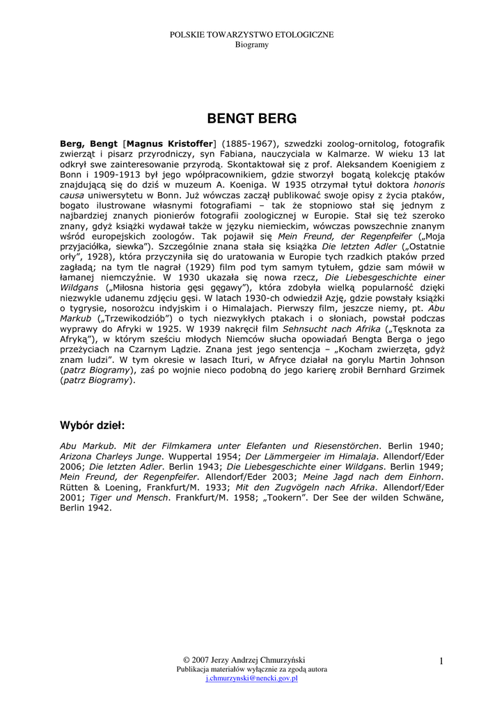 POLSKIE TOWARZYSTWO ETOLOGICZNE Biogramy BENGT BERG Berg, Bengt [Magnus Kristoffer] (1885-1967), szwedzki zoolog-ornitolog, fotografik zwierząt i pisarz przyrodniczy, syn Fabiana, nauczyciala w Kalmarze. W wieku 13 lat odkrył swe zainteresowanie przyrodą. Skontaktował się z prof. Aleksandem Koenigiem z Bonn i 1909-1913 był jego wpółpracownikiem, gdzie stworzył bogatą kolekcję ptaków znajdującą się do dziś w muzeum A. Koeniga. W 1935 otrzymał tytuł doktora honoris causa uniwersytetu w Bonn. Już wówczas zaczął publikować swoje opisy z życia ptaków, bogato ilustrowane własnymi fotografiami – tak że stopniowo stał się jednym z najbardziej znanych pionierów fotografii zoologicznej w Europie. Stał się też szeroko znany, gdyż książki wydawał także w języku niemieckim, wówczas powszechnie znanym wśród europejskich zoologów. Tak pojawił się Mein Freund, der Regenpfeifer („Moja przyjaciółka, siewka”). Szczególnie znana stała się książka Die letzten Adler („Ostatnie orły”, 1928), która przyczyniła się do uratowania w Europie tych rzadkich ptaków przed zagładą; na tym tle nagrał (1929) film pod tym samym tytułem, gdzie sam mówił w łamanej niemczyźnie. W 1930 ukazała się nowa rzecz, Die Liebesgeschichte einer Wildgans („Miłosna historia gęsi gęgawy”), która zdobyła wielką popularność dzięki niezwykle udanemu zdjęciu gęsi. W latach 1930-ch odwiedził Azję, gdzie powstały książki o tygrysie, nosorożcu indyjskim i o Himalajach. Pierwszy film, jeszcze niemy, pt. Abu Markub („Trzewikodziób”) o tych niezwykłych ptakach i o słoniach, powstał podczas wyprawy do Afryki w 1925. W 1939 nakręcił film Sehnsucht nach Afrika („Tęsknota za Afryką”), w którym sześciu młodych Niemców słucha opowiadań Bengta Berga o jego przeżyciach na Czarnym Lądzie. Znana jest jego sentencja – „Kocham zwierzęta, gdyż znam ludzi”. W tym okresie w lasach Ituri, w Afryce działał na gorylu Martin Johnson (patrz Biogramy), zaś po wojnie nieco podobną do jego karierę zrobił Bernhard Grzimek (patrz Biogramy). Wybór dzieł: Abu Markub. Mit der Filmkamera unter Elefanten und Riesenstörchen. Berlin 1940; Arizona Charleys Junge. Wuppertal 1954; Der Lämmergeier im Himalaja. Allendorf/Eder 2006; Die letzten Adler. Berlin 1943; Die Liebesgeschichte einer Wildgans. Berlin 1949; Mein Freund, der Regenpfeifer. Allendorf/Eder 2003; Meine Jagd nach dem Einhorn. Rütten & Loening, Frankfurt/M. 1933; Mit den Zugvögeln nach Afrika. Allendorf/Eder 2001; Tiger und Mensch. Frankfurt/M. 1958; „Tookern”. Der See der wilden Schwäne, Berlin 1942. © 2007 Jerzy Andrzej Chmurzyński Publikacja materiałów wyłącznie za zgodą autora [email protected] 1