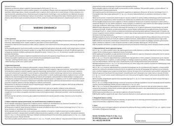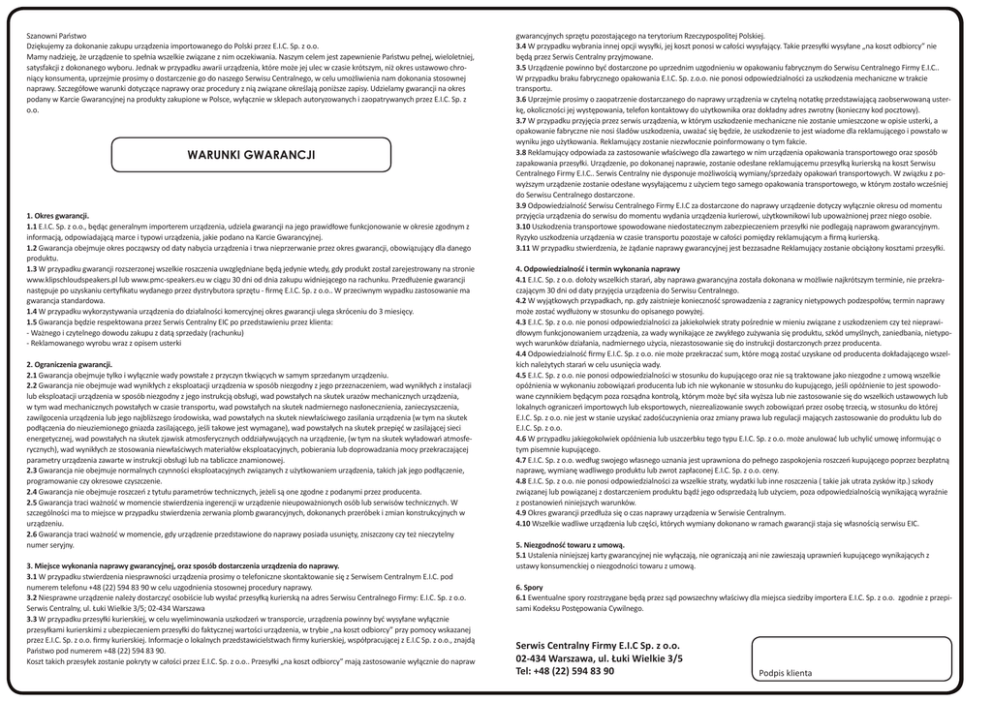 Szanowni Państwo Dziękujemy za dokonanie zakupu urządzenia importowanego do Polski przez E.I.C. Sp. z o.o. Mamy nadzieję, że urządzenie to spełnia wszelkie związane z nim oczekiwania. Naszym celem jest zapewnienie Państwu pełnej, wieloletniej, satysfakcji z dokonanego wyboru. Jednak w przypadku awarii urządzenia, które może jej ulec w czasie krótszym, niż okres ustawowo chroniący konsumenta, uprzejmie prosimy o dostarczenie go do naszego Serwisu Centralnego, w celu umożliwienia nam dokonania stosownej naprawy. Szczegółowe warunki dotyczące naprawy oraz procedury z nią związane określają poniższe zapisy. Udzielamy gwarancji na okres podany w Karcie Gwarancyjnej na produkty zakupione w Polsce, wyłącznie w sklepach autoryzowanych i zaopatrywanych przez E.I.C. Sp. z o.o. WARUNKI GWARANCJI 1. Okres gwarancji. 1.1 E.I.C. Sp. z o.o., będąc generalnym importerem urządzenia, udziela gwarancji na jego prawidłowe funkcjonowanie w okresie zgodnym z informacją, odpowiadającą marce i typowi urządzenia, jakie podano na Karcie Gwarancyjnej. 1.2 Gwarancja obejmuje okres począwszy od daty nabycia urządzenia i trwa nieprzerwanie przez okres gwarancji, obowiązujący dla danego produktu. 1.3 W przypadku gwarancji rozszerzonej wszelkie roszczenia uwzględniane będą jedynie wtedy, gdy produkt został zarejestrowany na stronie www.klipschloudspeakers.pl lub www.pmc-speakers.eu w ciągu 30 dni od dnia zakupu widniejącego na rachunku. Przedłużenie gwarancji następuje po uzyskaniu certyfikatu wydanego przez dystrybutora sprzętu - firmę E.I.C. Sp. z o.o.. W przeciwnym wypadku zastosowanie ma gwarancja standardowa. 1.4 W przypadku wykorzystywania urządzenia do działalności komercyjnej okres gwarancji ulega skróceniu do 3 miesięcy. 1.5 Gwarancja będzie respektowana przez Serwis Centralny EIC po przedstawieniu przez klienta: - Ważnego i czytelnego dowodu zakupu z datą sprzedaży (rachunku) - Reklamowanego wyrobu wraz z opisem usterki 2. Ograniczenia gwarancji. 2.1 Gwarancja obejmuje tylko i wyłącznie wady powstałe z przyczyn tkwiących w samym sprzedanym urządzeniu. 2.2 Gwarancja nie obejmuje wad wynikłych z eksploatacji urządzenia w sposób niezgodny z jego przeznaczeniem, wad wynikłych z instalacji lub eksploatacji urządzenia w sposób niezgodny z jego instrukcją obsługi, wad powstałych na skutek urazów mechanicznych urządzenia, w tym wad mechanicznych powstałych w czasie transportu, wad powstałych na skutek nadmiernego nasłonecznienia, zanieczyszczenia, zawilgocenia urządzenia lub jego najbliższego środowiska, wad powstałych na skutek niewłaściwego zasilania urządzenia (w tym na skutek podłączenia do nieuziemionego gniazda zasilającego, jeśli takowe jest wymagane), wad powstałych na skutek przepięć w zasilającej sieci energetycznej, wad powstałych na skutek zjawisk atmosferycznych oddziaływujących na urządzenie, (w tym na skutek wyładowań atmosferycznych), wad wynikłych ze stosowania niewłaściwych materiałów eksploatacyjnych, pobierania lub doprowadzania mocy przekraczającej parametry urządzenia zawarte w instrukcji obsługi lub na tabliczce znamionowej. 2.3 Gwarancja nie obejmuje normalnych czynności eksploatacyjnych związanych z użytkowaniem urządzenia, takich jak jego podłączenie, programowanie czy okresowe czyszczenie. 2.4 Gwarancja nie obejmuje roszczeń z tytułu parametrów technicznych, jeżeli są one zgodne z podanymi przez producenta. 2.5 Gwarancja traci ważność w momencie stwierdzenia ingerencji w urządzenie nieupoważnionych osób lub serwisów technicznych. W szczególności ma to miejsce w przypadku stwierdzenia zerwania plomb gwarancyjnych, dokonanych przeróbek i zmian konstrukcyjnych w urządzeniu. 2.6 Gwarancja traci ważność w momencie, gdy urządzenie przedstawione do naprawy posiada usunięty, zniszczony czy też nieczytelny numer seryjny. 3. Miejsce wykonania naprawy gwarancyjnej, oraz sposób dostarczenia urządzenia do naprawy. 3.1 W przypadku stwierdzenia niesprawności urządzenia prosimy o telefoniczne skontaktowanie się z Serwisem Centralnym E.I.C. pod numerem telefonu +48 (22) 594 83 90 w celu uzgodnienia stosownej procedury naprawy. 3.2 Niesprawne urządzenie należy dostarczyć osobiście lub wysłać przesyłką kurierską na adres Serwisu Centralnego Firmy: E.I.C. Sp. z o.o. Serwis Centralny, ul. Łuki Wielkie 3/5; 02-434 Warszawa 3.3 W przypadku przesyłki kurierskiej, w celu wyeliminowania uszkodzeń w transporcie, urządzenia powinny być wysyłane wyłącznie przesyłkami kurierskimi z ubezpieczeniem przesyłki do faktycznej wartości urządzenia, w trybie „na koszt odbiorcy” przy pomocy wskazanej przez E.I.C. Sp. z o.o. firmy kurierskiej. Informacje o lokalnych przedstawicielstwach firmy kurierskiej, współpracującej z E.I.C Sp. z o.o., znajdą Państwo pod numerem +48 (22) 594 83 90. Koszt takich przesyłek zostanie pokryty w całości przez E.I.C. Sp. z o.o.. Przesyłki „na koszt odbiorcy” mają zastosowanie wyłącznie do napraw gwarancyjnych sprzętu pozostającego na terytorium Rzeczypospolitej Polskiej. 3.4 W przypadku wybrania innej opcji wysyłki, jej koszt ponosi w całości wysyłający. Takie przesyłki wysyłane „na koszt odbiorcy” nie będą przez Serwis Centralny przyjmowane. 3.5 Urządzenie powinno być dostarczone po uprzednim uzgodnieniu w opakowaniu fabrycznym do Serwisu Centralnego Firmy E.I.C.. W przypadku braku fabrycznego opakowania E.I.C. Sp. z.o.o. nie ponosi odpowiedzialności za uszkodzenia mechaniczne w trakcie transportu. 3.6 Uprzejmie prosimy o zaopatrzenie dostarczanego do naprawy urządzenia w czytelną notatkę przedstawiającą zaobserwowaną usterkę, okoliczności jej występowania, telefon kontaktowy do użytkownika oraz dokładny adres zwrotny (konieczny kod pocztowy). 3.7 W przypadku przyjęcia przez serwis urządzenia, w którym uszkodzenie mechaniczne nie zostanie umieszczone w opisie usterki, a opakowanie fabryczn