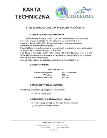 KARTA TECHNICZNA STÓŁ BETONOWY DO GRY W SZACHY I CHIŃCZYKA 1.OPIS WYROBU I SPOSÓB MONTAŻU Stół betonowy do gry w szachy i chińczyka wykonany jest wibrowanego betonu z kruszywem ozdobnym i zbrojony drutem o średnicy 8 mm. Blat o wymiarach1600 x 800 x 80 mm, szlifowany i malowany lakierem odpornym na warunki atmosferyczne. Dookoła blatu listwa aluminiowa o zaokrąglonych krawędziach, uniemożliwiająca przypadkowe skaleczenie się, oraz obicie stołu. Pola do gry w chińczyka i szachy wykonane są z płyty granitowej, wtopionej w blat stołu. Siedziska wykonane są z drewna świerkowego o grubości 45mm, malowane lakierobejcą koloru brązowego. Montaż stołu odbywa się poprzez wkopanie na głębokość 230 mm. 2.DANE TECHNICZNE Wymiary wyrobu: Wymiary zewnętrzne Wysokość Głębokość wkopania 1700 x 1800 mm 760 mm 230 mm 3.ZGODNOŚĆ WYROBU Z NORMAMI Wyrób posiada deklarację na zgodność z normami: • PN-EN 13198:2005. 4.BEZPIECZEŃSTWO UŻYTKOWANIA I UWAGI 1) Stołu należy używać zgodnie z jej przeznaczeniem. 2) Nie należy wchodzić na stół. STYLBET Zbigniew Pskowski ul. Oświęcimska 29/21 42-700 Lubliniec Strona 1 z 2 tel. 728-951-281 fax. 34 344-19-97 KARTA TECHNICZNA 80 5.RYSUNKI WYROBU 800 1600 100 230 730 1600 1700 ±0,00 430 760 310 1800 STYLBET Zbigniew Pskowski ul. Oświęcimska 29/21 42-700 Lubliniec Strona 2 z 2 tel. 728-951-281 fax. 34 344-19-97