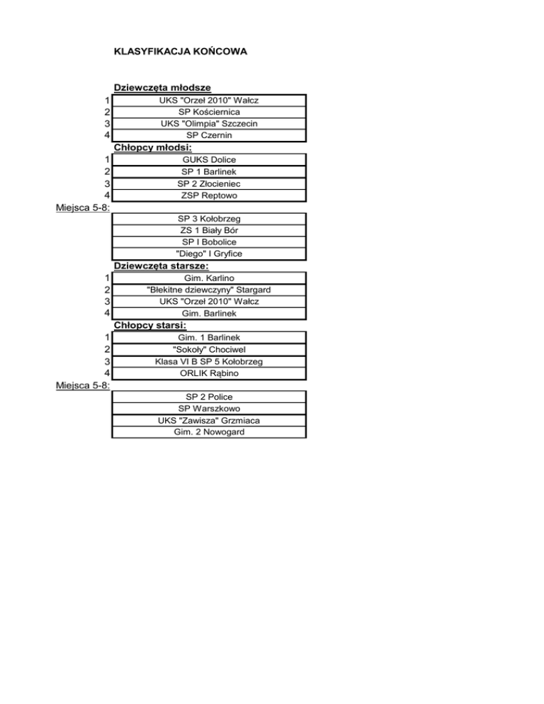 KLASYFIKACJA KOŃCOWA Dziewczęta młodsze 1 2 3 4 UKS "Orzeł 2010" Wałcz SP Kościernica UKS "Olimpia" Szczecin SP Czernin Chłopcy młodsi: 1 2 3 4 Miejsca 5-8: GUKS Dolice SP 1 Barlinek SP 2 Złocieniec ZSP Reptowo SP 3 Kołobrzeg ZS 1 Biały Bór SP I Bobolice "Diego" I Gryfice Dziewczęta starsze: 1 2 3 4 Gim. Karlino "Błekitne dziewczyny" Stargard UKS "Orzeł 2010" Wałcz Gim. Barlinek Chłopcy starsi: 1 2 3 4 Miejsca 5-8: Gim. 1 Barlinek "Sokoły" Chociwel Klasa VI B SP 5 Kołobrzeg ORLIK Rąbino SP 2 Police SP Warszkowo UKS "Zawisza" Grzmiaca Gim. 2 Nowogard