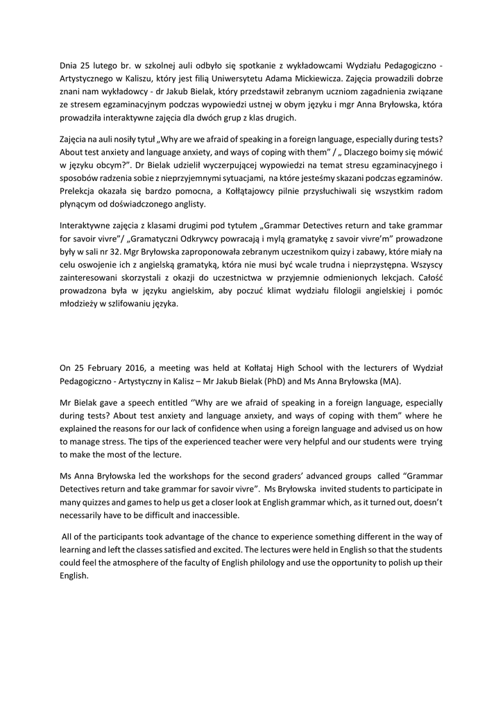 Dnia 25 lutego br. w szkolnej auli odbyło się spotkanie z wykładowcami Wydziału Pedagogiczno Artystycznego w Kaliszu, który jest filią Uniwersytetu Adama Mickiewicza. Zajęcia prowadzili dobrze znani nam wykładowcy - dr Jakub Bielak, który przedstawił zebranym uczniom zagadnienia związane ze stresem egzaminacyjnym podczas wypowiedzi ustnej w obym języku i mgr Anna Bryłowska, która prowadziła interaktywne zajęcia dla dwóch grup z klas drugich. Zajęcia na auli nosiły tytuł „Why are we afraid of speaking in a foreign language, especially during tests? About test anxiety and language anxiety, and ways of coping with them” / „ Dlaczego boimy się mówić w języku obcym?”. Dr Bielak udzielił wyczerpującej wypowiedzi na temat stresu egzaminacyjnego i sposobów radzenia sobie z nieprzyjemnymi sytuacjami, na które jesteśmy skazani podczas egzaminów. Prelekcja okazała się bardzo pomocna, a Kołłątajowcy pilnie przysłuchiwali się wszystkim radom płynącym od doświadczonego anglisty. Interaktywne zajęcia z klasami drugimi pod tytułem „Grammar Detectives return and take grammar for savoir vivre”/ „Gramatyczni Odkrywcy powracają i mylą gramatykę z savoir vivre’m” prowadzone były w sali nr 32. Mgr Bryłowska zaproponowała zebranym uczestnikom quizy i zabawy, które miały na celu oswojenie ich z angielską gramatyką, która nie musi być wcale trudna i nieprzystępna. Wszyscy zainteresowani skorzystali z okazji do uczestnictwa w przyjemnie odmienionych lekcjach. Całość prowadzona była w języku angielskim, aby poczuć klimat wydziału filologii angielskiej i pomóc młodzieży w szlifowaniu języka. On 25 February 2016, a meeting was held at Kołłataj High School with the lecturers of Wydział Pedagogiczno - Artystyczny in Kalisz – Mr Jakub Bielak (PhD) and Ms Anna Bryłowska (MA). Mr Bielak gave a speech entitled ‘’Why are we afraid of speaking in a foreign language, especially during tests? About test anxiety and language anxiety, and ways of coping with them” where he explained the reasons for our lack of confidence when using a foreign language and advised us on how to manage stress. The tips of the experienced teacher were very helpful and our students were trying to make the most of the lecture. Ms Anna Bryłowska led the workshops for the second graders’ advanced groups called “Grammar Detectives return and take grammar for savoir vivre”. Ms Bryłowska invited students to participate in many quizzes and games to help us get a closer look at English grammar which, as it turned out, doesn’t necessarily have to be difficult and inaccessible. All of the participants took advantage of the chance to experience something different in the way of learning and left the classes satisfied and excited. The lectures were held in English so that the students could feel the atmosphere of the faculty of English philology and use the opportunity to polish up their English.