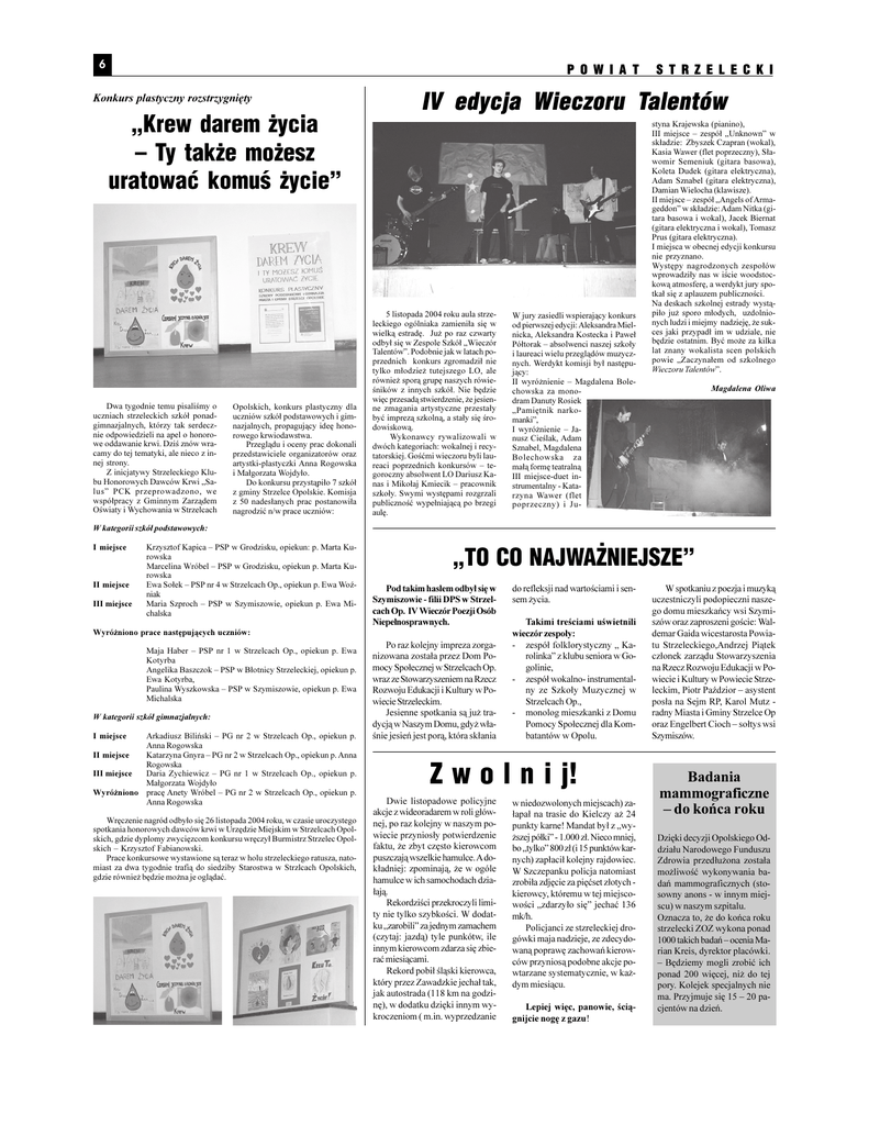 6 P O W I A T S T R Z E L E C K I IV edycja Wieczoru Talentów Konkurs plastyczny rozstrzygniêty Krew darem ¿ycia Ty tak¿e mo¿esz uratowaæ komu ¿ycie styna Krajewska (pianino), III miejsce zespó³ Unknown w sk³adzie: Zbyszek Czapran (wokal), Kasia Wawer (flet poprzeczny), S³a- womir Semeniuk (gitara basowa), Koleta Dudek (gitara elektryczna), Adam Sznabel (gitara elektryczna), Damian Wielocha (klawisze). II miejsce zespó³ Angels of Arma- geddon w sk³adzie: Adam Nitka (gi- tara basowa i wokal), Jacek Biernat (gitara elektryczna i wokal), Tomasz Prus (gitara elektryczna). I miejsca w obecnej edycji konkursu nie przyznano. Wystêpy nagrodzonych zespo³ów wprowadzi³y nas w icie woodstoc- kow¹ atmosferê, a werdykt jury spo- tka³ siê z aplauzem publicznoci. Na deskach szkolnej estrady wyst¹5 listopada 2004 roku aula strze- leckiego ogólniaka zamieni³a siê w wielk¹ estradê. Ju¿ po raz czwarty odby³ siê w Zespole Szkó³ Wieczór Talentów. Podobnie jak w latach po- przednich konkurs zgromadzi³ nie tylko m³odzie¿ tutejszego LO, ale równie¿ spor¹ grupê naszych rówieników z innych szkó³. Nie bêdzie Dwa tygodnie temu pisalimy o uczniach strzeleckich szkó³ ponadgimnazjalnych, którzy tak serdecznie odpowiedzieli na apel o honorowe oddawanie krwi. Dzi znów wracamy do tej tematyki, ale nieco z innej strony. Z inicjatywy Strzeleckiego Klu- bu Honorowych Dawców Krwi Sa- lus PCK przeprowadzono, we wspó³pracy z Gminnym Zarz¹dem Owiaty i Wychowania w Strzelcach Opolskich, konkurs plastyczny dla uczniów szkó³ podstawowych i gimnazjalnych, propaguj¹cy ideê honorowego krwiodawstwa. Przegl¹du i oceny prac dokonali przedstawiciele organizatorów oraz artystki-plastyczki Anna Rogowska i Ma³gorzata Wojdy³o. Do konkursu przyst¹pi³o 7 szkó³ z gminy Strzelce Opolskie. Komisja z 50 nades³anych prac postanowi³a nagrodziæ n/w prace uczniów: W jury zasiedli wspieraj¹cy konkurs od pierwszej edycji: Aleksandra Mielnicka, Aleksandra Kostecka i Pawe³ Pó³torak absolwenci naszej szko³y i laureaci wielu przegl¹dów muzycz- nych. Werdykt komisji by³ nastêpu- j¹cy: byæ imprez¹ szkoln¹, a sta³y siê ro- manki, dowiskow¹. Wykonawcy rywalizowali w dwóch kategoriach: wokalnej i recy- tatorskiej. Goæmi wieczoru byli laureaci poprzednich konkursów te- goroczny absolwent LO Dariusz Ka- nas i Miko³aj Kmiecik pracownik szko³y. Swymi wystêpami rozgrzali publicznoæ wype³niaj¹c¹ po brzegi aulê. bêdzie ostatnim. Byæ mo¿e za kilka lat znany wokalista scen polskich powie Zaczyna³em od szkolnego Wieczoru Talentów. Magdalena Oliwa chowska za mono- dram Danuty Rosiek uzdolnio- nych ludzi i miejmy nadziejê, ¿e suk- ces jaki przypad³ im w udziale, nie II wyró¿nienie Magdalena Bole- wiêc przesad¹ stwierdzenie, ¿e jesien- ne zmagania artystyczne przesta³y pi³o ju¿ sporo m³odych, Pamiêtnik narko- I wyró¿nienie Ja- nusz Cielak, Adam Sznabel, Magdalena Bolechowska za ma³¹ formê teatraln¹ III miejsce-duet in- strumentalny - Kata- rzyna Wawer (flet poprzeczny) i Ju- W kategorii szkó³ podstawowych: I miejsce TO CO NAJWA¯NIEJSZE Krzysztof Kapica PSP w Grodzisku, opiekun: p. Marta Ku- rowska Marcelina Wróbel PSP w Grodzisku, opiekun p. Marta Ku- rowska II miejsce Ewa So³ek PSP nr 4 w Strzelcach Op., opiekun p. Ewa Wo- III miejsce Maria Szproch PSP w Szymiszowie, opiekun p. Ewa Mi- niak chalska Wyró¿niono prace nastêpuj¹cych uczniów: Maja Haber PSP nr 1 w Strzelcach Op., opiekun p. Ewa Kotyrba Angelika Baszczok PSP w B³otnicy Strzeleckiej, opiekun p. Ewa Kotyrba, Paulina Wyszkowska PSP w Szymiszowie, opiekun p. Ewa Michalska W kategorii szkó³ gimnazjalnych: I miejsce II miejsce III miejsce Wyró¿niono Arkadiusz Biliñski PG nr 2 w Strzelcach Op., opiekun p. Anna Rogowska Pod takim has³em odby³ siê w Szymiszowie - filii DPS w Strzelcach Op. IV Wieczór Poezji Osób Po raz kolejny impreza zorga- skich, gdzie dyplomy zwyciêzcom konkursu wrêczy³ Burmistrz Strzelec Opolskich Krzysztof Fabianowski. Prace konkursowe wystawione s¹ teraz w holu strzeleckiego ratusza, nato- miast za dwa tygodnie trafi¹ do siedziby Starostwa w Strzlcach Opolskich, gdzie równie¿ bêdzie mo¿na je ogl¹daæ. demar Gaida wicestarosta Powiatu Strzeleckiego,Andrzej Pi¹tek zespó³ folklorystyczny Ka- cz³onek zarz¹du Stowarzyszenia mocy Spo³ecznej w Strzelcach Op. golinie, na Rzecz Rozwoju Edukacji w Po- zespó³ wokalno- instrumental- wiecie i Kultury w Powiecie Strze- wraz ze Stowarzyszeniem na Rzecz - Rozwoju Edukacji i Kultury w Po- ny ze Szko³y Muzycznej w leckim, Piotr Padzior asystent wiecie Strzeleckim. Strzelcach Op., pos³a na Sejm RP, Karol Mutz - monolog mieszkanki z Domu radny Miasta i Gminy Strzelce Op dycj¹ w Naszym Domu, gdy¿ w³a- Pomocy Spo³ecznej dla Kom- oraz Engelbert Cioch so³tys wsi nie jesieñ jest por¹, która sk³ania batantów w Opolu. Szymiszów. Jesienne spotkania s¹ ju¿ tra- - Z w o l n i j! Daria Zychiewicz PG nr 1 w Strzelcach Op., opiekun p. spotkania honorowych dawców krwi w Urzêdzie Miejskim w Strzelcach Opol- wieczór zespo³y: - rolinka z klubu seniora w Go- Rogowska Anna Rogowska szów oraz zaproszeni gocie: Wal- nizowana zosta³a przez Dom Po- Ma³gorzata Wojdy³o Wrêczenie nagród odby³o siê 26 listopada 2004 roku, w czasie uroczystego W spotkaniu z poezja i muzyk¹ uczestniczyli podopieczni naszego domu mieszkañcy wsi Szymi- Takimi treciami uwietnili Niepe³nosprawnych. Katarzyna Gnyra PG nr 2 w Strzelcach Op., opiekun p. Anna pracê Anety Wróbel PG nr 2 w Strzelcach Op., opiekun p. do refleksji nad wartociami i sensem ¿ycia. Dwie listopadowe policyjne akcje z wideoradarem w roli g³ównej, po raz kolejny w naszym powiecie przynios³y potwierdzenie faktu, ¿e zbyt czêsto kierowcom puszczaj¹ wszelkie hamulce. A dok³adniej: zpominaj¹, ¿e w ogóle hamulce w ich samochodach dzia³aj¹. Rekordzici przekroczyli limity nie tylko szybkoci. W dodatku zarobili za jednym zamachem (czytaj: jazd¹) tyle punk
