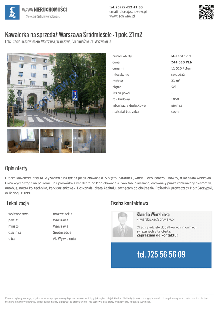 tel. (022) 412 41 50 email: [email protected] www: scn.waw.pl Kawalerka na sprzedaż Warszawa Śródmieście - 1 pok. 21 m2 Lokalizacja: mazowieckie, Warszawa, Warszawa, Śródmieście, Al. Wyzwolenia numer oferty M-20511-11 cena 244 000 PLN cena m 11 510 PLN/m2 mieszkanie sprzedaż, metraż 21 m2 piętro 5/5 liczba pokoi 1 rok budowy 1950 informacje dodatkowe piwnica materiał budynku cegła 2 Opis oferty Urocza kawalerka przy Al. Wyzwolenia na tyłach placu Zbawiciela. 5 piętro (ostatnie) , winda. Pokój bardzo ustawny, duża szafa wnekowa. Okno wychodzące na południe , na podwórko z widokiem na Plac Zbawiciela. Świetna lokalizacja, doskonały punkt komunikacyjny-tramwaj, autobus, metro Politechnika, Park Łazienkowski Doskonała lokata kapitału, zachęcam do obejrzenia. Pośrednik prowadzący Piotr Szczypski, nr licencji 15099 Lokalizacja Osoba kontaktowa Klaudia Wierzbicka województwo mazowieckie powiat Warszawa [email protected] miasto Warszawa dzielnica Śródmieście ulica Al. Wyzwolenia Chętnie udzielę dodatkowych informacji związanych z tą ofertą. Zapraszam do kontaktu! tel. 725 56 56 09 Zawsze dążymy do tego, aby informacje o proponowanych przez nas ofertach były jak najbardziej dokładne. Niekiedy jednak, ze względu na fakt, iż uzyskujemy je od osób trzecich nie jest możliwe ich zweryfikowanie, wobec czego należy traktować je orientacyjnie i nie stanowią one oferty w rozumieniu kodeksu cywilnego.