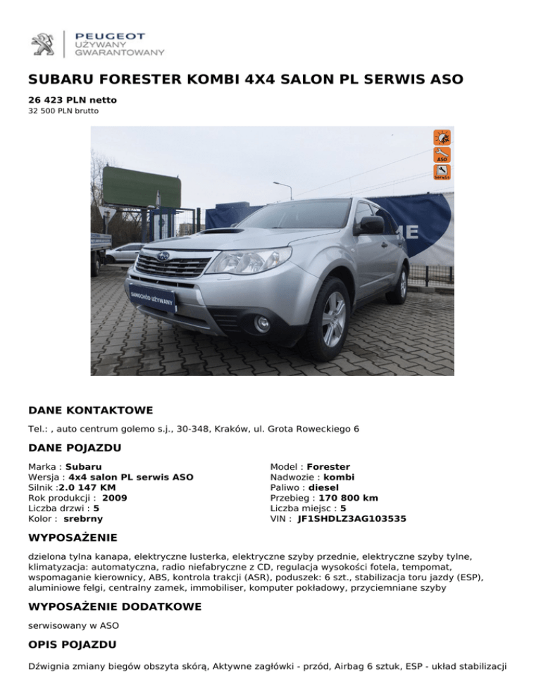 SUBARU FORESTER KOMBI 4X4 SALON PL SERWIS ASO 26 423 PLN netto 32 500 PLN brutto DANE KONTAKTOWE Tel.: , auto centrum golemo s.j., 30-348, Kraków, ul. Grota Roweckiego 6 DANE POJAZDU Marka : Subaru Wersja : 4x4 salon PL serwis ASO Silnik :2.0 147 KM Rok produkcji : 2009 Liczba drzwi : 5 Kolor : srebrny Model : Forester Nadwozie : kombi Paliwo : diesel Przebieg : 170 800 km Liczba miejsc : 5 VIN : JF1SHDLZ3AG103535 WYPOSAŻENIE dzielona tylna kanapa, elektryczne lusterka, elektryczne szyby przednie, elektryczne szyby tylne, klimatyzacja: automatyczna, radio niefabryczne z CD, regulacja wysokości fotela, tempomat, wspomaganie kierownicy, ABS, kontrola trakcji (ASR), poduszek: 6 szt., stabilizacja toru jazdy (ESP), aluminiowe felgi, centralny zamek, immobiliser, komputer pokładowy, przyciemniane szyby WYPOSAŻENIE DODATKOWE serwisowany w ASO OPIS POJAZDU Dźwignia zmiany biegów obszyta skórą, Aktywne zagłówki - przód, Airbag 6 sztuk, ESP - układ stabilizacji toru jazdy, ABS, 4/5 zagłówki, El. podnoszenie szyb, przód i tył, Fotele przednie z funkcją ogrzewania, Fotel kierowcy z regulacją wysokości, Gniazdo 12V w bagażniku, Gniazdo do podłącznia odtwarzacza MP3, Immobilizer, Hill Start Assist - wspomaganie ruszania pod górę, Inteligentny system ratunkowy (ISR) - system powiadamiania o sytuacji awaryjnej, Kierownica skórzana, Klimatyzacja automatyczna, Tempomat, Szyby barwione, System kontroli trakcji, Spryskiwacze lamp przednich, Schowek na okulary, Roleta przestrzeni bagażowej, Radio CD, Przedni podłokietnik ze schowkiem, Pełnowymiarowe koło zapasowe, Lusterka boczne z funkcją podgrzewania, Ogrzewana przednia szyba w miejscu spoczynku piór wycieraczek, Zamek centralny z pilotem, Lusterka boczne regulowane elektrycznie, Lampki do czytania z przodu, Zderzaki w kolorze nadwozia, Lakier metalik, Komputer pokładowy, Tylne oparcie składane, dzielone, Termometr zewnętrzny, Kolumna kierownicy regulowana w dwóch płaszczyznach, Uchwyty ISOFIX do instalacji fotelika dzieciecego, Tylny podłokietnik, Wspomaganie układu kierowniczego, Uchwyty na kubki - przód/tył, Wycieraczka szyby tylnej, EBD-elektroniczny rozdział sił hamowania, Felgi aluminiowe 16 z ogumieniem, Hak holowniczy stały Kupiony w ASO w Polsce, Pojazd regularnie serwisowany, Miejsce postoju: Kraków Grota Roweckiego 6 salon Peugeot !!! W przypadku zainteresowania naszą ofertą prosimy o wcześniejszy kontakt w celu potwierdzenia dostępności oraz lokalizacji samochodu !!! Więcej informacji na temat tego samochodu oraz całej naszej oferty: Autoryzowany salon Peugeot Kraków ul. Grota Roweckiego 6 Jakub Warzecha - doradca handlowy Tel. +48 501 29 33 75 Agnieszka Szymańska-Uchwat - specjalista ds. Kredytów, Lesingów i Ubezpieczeń Tel. +48 693 93 25 21 Autoryzowany salon Citroen Kraków ul. Opolska 9 Tomasz Meus – Kierownik Samochodów Używanych Tel. +48 693 93 27 67 Michał Mikołajczak - doradca handlowy Tel. +48 609 44 10 28 Agnieszka Szczuka-Łach - specjalista ds. Kredytów, Lesingów i Ubezpieczeń Tel. +48 693 93 27 69 Autoryzowany salon Peugeot Nowy Targ ul. Podtatrzańska 3 Marcin Gerlach – kierownik salonu Tel. +48 607 30 52 55 Stasik Paweł - specjalista d/s ubezpieczeń Tel. +48 725 29 16 16 QR CODE DLA OGŁOSZENIA W SERWISIE UZYWANYGWARANTOWANY.PL Powered by TCPDF (www.tcpdf.org)
