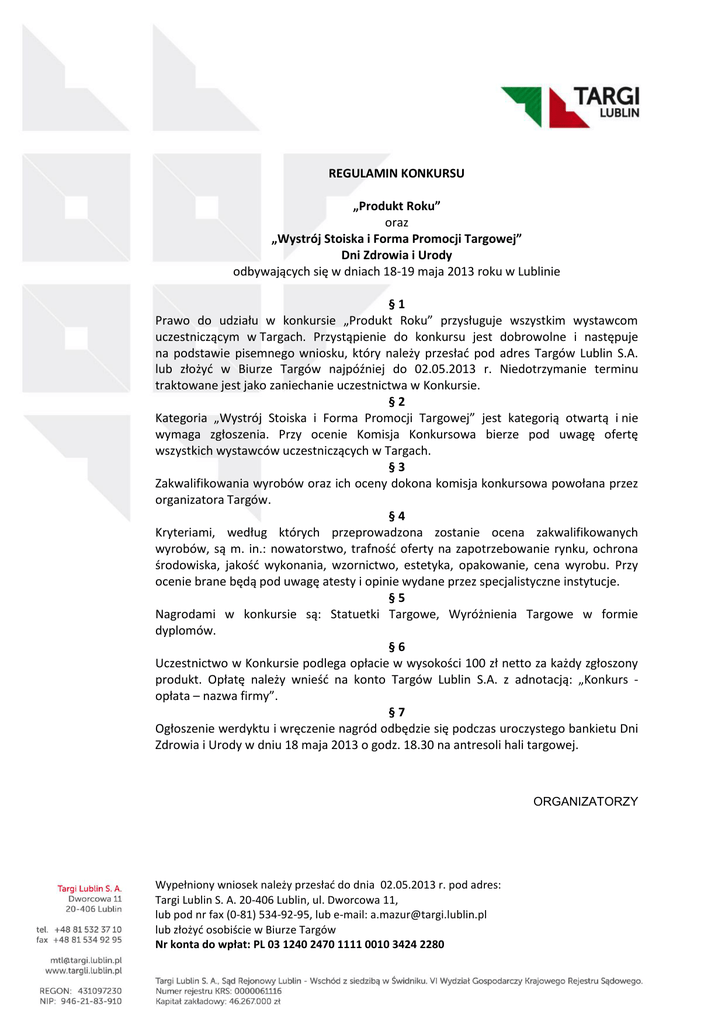 REGULAMIN KONKURSU „Produkt Roku” oraz „Wystrój Stoiska i Forma Promocji Targowej” Dni Zdrowia i Urody odbywających się w dniach 18-19 maja 2013 roku w Lublinie §1 Prawo do udziału w konkursie „Produkt Roku” przysługuje wszystkim wystawcom uczestniczącym w Targach. Przystąpienie do konkursu jest dobrowolne i następuje na podstawie pisemnego wniosku, który należy przesłać pod adres Targów Lublin S.A. lub złożyć w Biurze Targów najpóźniej do 02.05.2013 r. Niedotrzymanie terminu traktowane jest jako zaniechanie uczestnictwa w Konkursie. §2 Kategoria „Wystrój Stoiska i Forma Promocji Targowej” jest kategorią otwartą i nie wymaga zgłoszenia. Przy ocenie Komisja Konkursowa bierze pod uwagę ofertę wszystkich wystawców uczestniczących w Targach. §3 Zakwalifikowania wyrobów oraz ich oceny dokona komisja konkursowa powołana przez organizatora Targów. §4 Kryteriami, według których przeprowadzona zostanie ocena zakwalifikowanych wyrobów, są m. in.: nowatorstwo, trafność oferty na zapotrzebowanie rynku, ochrona środowiska, jakość wykonania, wzornictwo, estetyka, opakowanie, cena wyrobu. Przy ocenie brane będą pod uwagę atesty i opinie wydane przez specjalistyczne instytucje. §5 Nagrodami w konkursie są: Statuetki Targowe, Wyróżnienia Targowe w formie dyplomów. §6 Uczestnictwo w Konkursie podlega opłacie w wysokości 100 zł netto za każdy zgłoszony produkt. Opłatę należy wnieść na konto Targów Lublin S.A. z adnotacją: „Konkurs opłata – nazwa firmy”. §7 Ogłoszenie werdyktu i wręczenie nagród odbędzie się podczas uroczystego bankietu Dni Zdrowia i Urody w dniu 18 maja 2013 o godz. 18.30 na antresoli hali targowej. ORGANIZATORZY Wypełniony wniosek należy przesłać do dnia 02.05.2013 r. pod adres: Targi Lublin S. A. 20-406 Lublin, ul. Dworcowa 11, lub pod nr fax (0-81) 534-92-95, lub e-mail: [email protected] lub złożyć osobiście w Biurze Targów Nr konta do wpłat: PL 03 1240 2470 1111 0010 3424 2280 ZGŁOSZENIE do oceny w Konkursie „Produkt Roku” podczas Dni Zdrowia i Urody odbywających się w dniach 18-19 maja 2013 roku w Lublinie Nazwa Firmy: ……………………………………………………………………………………... ……………………………………………………………………………………........................... Adres: ……………………………………………………………………………………............... Nazwisko Przedstawiciela: …………………………………………………………………….. NAZWA WYROBU PRODUCENT Krótka charakterystyka: ……………………………………………………………………………………………………… ……………………………………………………………………………………………………… Uzasadnienie wniosku: ……………………………………………………………………………………………………… ……………………………………………………………………………………………………… ……………………………………………………………………………………………………… ……………………………………………………………………………………………………… Załączniki: ……………………………………………………………………………………………………… ……………………………………………………………………………………………………… ……………………………………………………………………………………………………… Oświadczam, że: 1. Jestem Przedstawicielem firmy uprawnionym do zaciągania zobowiązań. 2. Mam świadomość konieczności uiszczenia opłaty w wysokości 100 zł netto za każdy produkt zgłoszony w Konkursie Targowym w kategorii „Produkt Roku”. Data i podpis Wypełniony wniosek należy przesłać do dnia 02.05.2013 r. pod adres: Targi Lublin S. A. 20-406 Lublin, ul. Dworcowa 11, lub pod nr fax (0-81) 534-92-95, lub e-mail: [email protected] lub złożyć osobiście w Biurze Targów Nr konta do wpłat: PL 03 1240 2470 1111 0010 3424 2280 Formularz ZK ZGŁOSZENIE DO KONKURSU TARGOWEGO Nr Pełna nazwa firmy Wystawcy (do faktury VAT): Ulica: Kod: Miejscowość: Województwo: Nazwa i nr dokumentu potwierdzającego prowadzenie działalności gospodarczej: Upoważniamy Organizatora do wystawienia faktury VAT bez podpisu odbiorcy NIP: Nazwisko przedstawiciela, tel. kontaktowy, e-mail: ZGŁASZAMY NASTĘPUJĄCY/-E PRODUKT/-Y (koszt bez VAT) CENA (netto): NAZWA PRODUKTU/-ÓW WARTOŚĆ: 100,00 zł 100,00 zł 100,00 zł 100,00 zł 100,00 zł Razem netto: Razem brutto (+23% VAT): Miejscowość i data: Podpis firmy Wystawcy i podpis prawnie wiążący: Wypełniony wniosek należy przesłać do dnia 02.05.2013 r. pod adres: Targi Lublin S. A. 20-406 Lublin, ul. Dworcowa 11, lub pod nr fax (0-81) 534-92-95, lub e-mail: [email protected] lub złożyć osobiście w Biurze Targów Nr konta do wpłat: PL 03 1240 2470 1111 0010 3424 2280