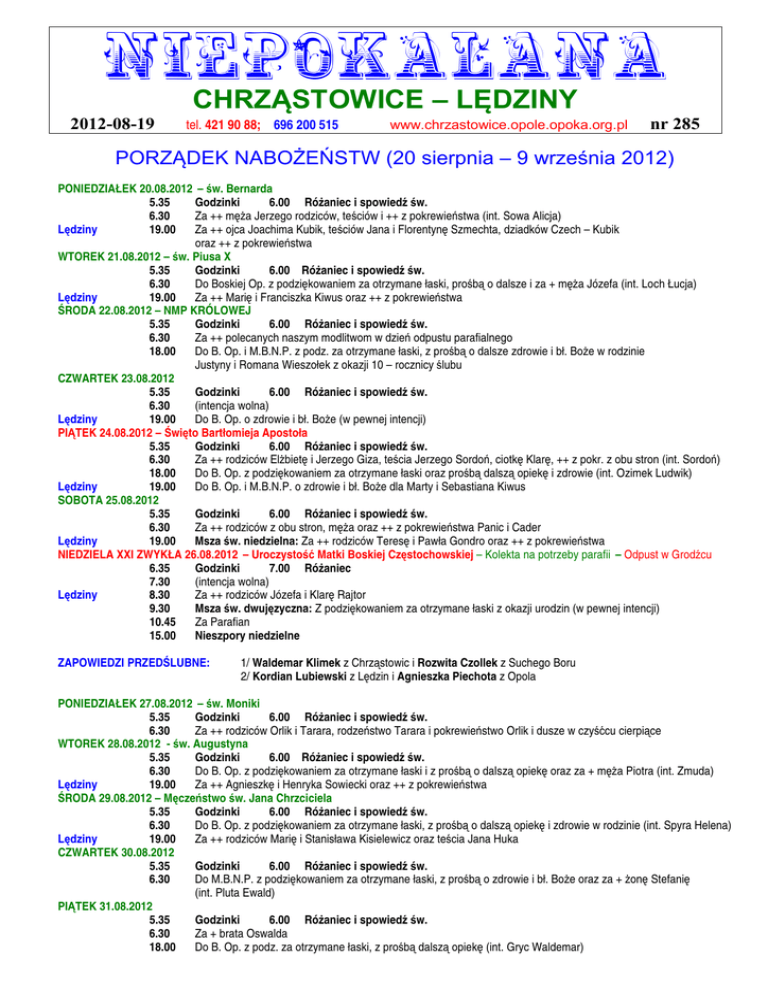 NIEPOKALANA CHRZĄSTOWICE – LĘDZINY 2012-08-19 tel. 421 90 88; 696 200 515 www.chrzastowice.opole.opoka.org.pl nr 285 PORZĄDEK NABOŻEŃSTW (20 sierpnia – 9 września 2012) PONIEDZIAŁEK 20.08.2012 – św. Bernarda 5.35 Godzinki 6.00 RóŜaniec i spowiedź św. 6.30 Za ++ męŜa Jerzego rodziców, teściów i ++ z pokrewieństwa (int. Sowa Alicja) Lędziny 19.00 Za ++ ojca Joachima Kubik, teściów Jana i Florentynę Szmechta, dziadków Czech – Kubik oraz ++ z pokrewieństwa WTOREK 21.08.2012 – św. Piusa X 5.35 Godzinki 6.00 RóŜaniec i spowiedź św. 6.30 Do Boskiej Op. z podziękowaniem za otrzymane łaski, prośbą o dalsze i za + męŜa Józefa (int. Loch Łucja) Lędziny 19.00 Za ++ Marię i Franciszka Kiwus oraz ++ z pokrewieństwa ŚRODA 22.08.2012 – NMP KRÓLOWEJ 5.35 Godzinki 6.00 RóŜaniec i spowiedź św. 6.30 Za ++ polecanych naszym modlitwom w dzień odpustu parafialnego 18.00 Do B. Op. i M.B.N.P. z podz. za otrzymane łaski, z prośbą o dalsze zdrowie i bł. BoŜe w rodzinie Justyny i Romana Wieszołek z okazji 10 – rocznicy ślubu CZWARTEK 23.08.2012 5.35 Godzinki 6.00 RóŜaniec i spowiedź św. 6.30 (intencja wolna) Lędziny 19.00 Do B. Op. o zdrowie i bł. BoŜe (w pewnej intencji) PIĄTEK 24.08.2012 – Święto Bartłomieja Apostoła 5.35 Godzinki 6.00 RóŜaniec i spowiedź św. 6.30 Za ++ rodziców ElŜbietę i Jerzego Giza, teścia Jerzego Sordoń, ciotkę Klarę, ++ z pokr. z obu stron (int. Sordoń) 18.00 Do B. Op. z podziękowaniem za otrzymane łaski oraz prośbą dalszą opiekę i zdrowie (int. Ozimek Ludwik) Lędziny 19.00 Do B. Op. i M.B.N.P. o zdrowie i bł. BoŜe dla Marty i Sebastiana Kiwus SOBOTA 25.08.2012 5.35 Godzinki 6.00 RóŜaniec i spowiedź św. 6.30 Za ++ rodziców z obu stron, męŜa oraz ++ z pokrewieństwa Panic i Cader Lędziny 19.00 Msza św. niedzielna: Za ++ rodziców Teresę i Pawła Gondro oraz ++ z pokrewieństwa NIEDZIELA XXI ZWYKŁA 26.08.2012 – Uroczystość Matki Boskiej Częstochowskiej – Kolekta na potrzeby parafii – Odpust w Grodźcu 6.35 Godzinki 7.00 RóŜaniec 7.30 (intencja wolna) Lędziny 8.30 Za ++ rodziców Józefa i Klarę Rajtor 9.30 Msza św. dwujęzyczna: Z podziękowaniem za otrzymane łaski z okazji urodzin (w pewnej intencji) 10.45 Za Parafian 15.00 Nieszpory niedzielne ZAPOWIEDZI PRZEDŚLUBNE: 1/ Waldemar Klimek z Chrząstowic i Rozwita Czollek z Suchego Boru 2/ Kordian Lubiewski z Lędzin i Agnieszka Piechota z Opola PONIEDZIAŁEK 27.08.2012 – św. Moniki 5.35 Godzinki 6.00 RóŜaniec i spowiedź św. 6.30 Za ++ rodziców Orlik i Tarara, rodzeństwo Tarara i pokrewieństwo Orlik i dusze w czyśćcu cierpiące WTOREK 28.08.2012 - św. Augustyna 5.35 Godzinki 6.00 RóŜaniec i spowiedź św. 6.30 Do B. Op. z podziękowaniem za otrzymane łaski i z prośbą o dalszą opiekę oraz za + męŜa Piotra (int. Zmuda) Lędziny 19.00 Za ++ Agnieszkę i Henryka Sowiecki oraz ++ z pokrewieństwa ŚRODA 29.08.2012 – Męczeństwo św. Jana Chrzciciela 5.35 Godzinki 6.00 RóŜaniec i spowiedź św. 6.30 Do B. Op. z podziękowaniem za otrzymane łaski, z prośbą o dalszą opiekę i zdrowie w rodzinie (int. Spyra Helena) Lędziny 19.00 Za ++ rodziców Marię i Stanisława Kisielewicz oraz teścia Jana Huka CZWARTEK 30.08.2012 5.35 Godzinki 6.00 RóŜaniec i spowiedź św. 6.30 Do M.B.N.P. z podziękowaniem za otrzymane łaski, z prośbą o zdrowie i bł. BoŜe oraz za + Ŝonę Stefanię (int. Pluta Ewald) PIĄTEK 31.08.2012 5.35 Godzinki 6.00 RóŜaniec i spowiedź św. 6.30 Za + brata Oswalda 18.00 Do B. Op. z podz. za otrzymane łaski, z prośbą dalszą opiekę (int. Gryc Waldemar) SOBOTA 01.09.2012 – bł. Bronisławy, patronki diecezji opolskiej 5.35 Godzinki 6.00 RóŜaniec i spowiedź św. 6.30 Do B. Op. z podz. za otrzymane łaski, z prośbą o dalszą opiekę w rodzinie z okazji urodzin i rocznic ślubu NIEDZIELA XXII ZWYKŁA 02.09.2012 – Kolekta na Kurię i Seminarium Duchowne w Opolu 6.35 Godzinki 7.00 RóŜaniec 7.30 Za + Stefana Olech Lędziny 8.30 Za ++ rodziców Staś, siostrę Marię i szwagra Alojza 9.30 Msza św. dwujęzyczna: Do B. Op. i M.B.N.P. z podz. za otrzymane łaski, z prośbą o dalsze zdrowie i bł. BoŜe z okazji 65 – rocznicy urodzin (w pewnej intencji) 10.45 Do B. Op. i M.B.N.P. z podz. za otrzymane łaski z prośbą o dalszą opiekę i zdrowie w rodzinie oraz za + ojca Alojzego Waldera i ++ z pokrewieństwa Kondziela – Waldera 15.00 Koronka do Miłosierdzia BoŜego z udziałem rodziców i dzieci przygotowujących się do I – Komunii św. oraz rodziców i młodzieŜy gimnazjalnej przygotowującej się do Bierzmowania (spotkanie organizacyjne) 20.00 Godzina święta i RóŜaniec 21.00 Apel Jasnogórski ZAPOWIEDZI PRZEDŚLUBNE: 1/ Waldemar Klimek z Chrząstowic i Rozwita Czollek z Suchego Boru 2/ Kordian Lubiewski z Lędzin i Agnieszka Piechota z Opola PONIEDZIAŁEK 03.09.2012 – św. Grzegorza Wielkiego 5.35 Godzinki 6.00 RóŜaniec i spowiedź św. 6.30 Za ++ rodziców ks. proboszcza i ++ z rodziny 9.00 MSZA ŚW. NA ROZPOCZĘCIE ROKU SZKOLNEGO WTOREK 04.09.2012 5.35 6.30 ŚRODA 05.09.2012 5.35 6.30 8.00 18.00 Godzinki 6.00 RóŜaniec i spowiedź św. 1/ Z podziękowniem za otrzymane łaski, z prośbą o dalsze z okazji rocznicy ślubu i za + ojca 2/ Do B.Op. i M.B.N.P. z podziękowaniem za otrzymane łaski i z prośbą o dalsze zdrowie i błogosławieństwo BoŜe dla Marii Mateja z okazji 93r.urodzin Godzinki 6.00 RóŜaniec i spowiedź św. Do B. Op. z podz. za otrzymane łaski, z prośbą dalszą opiekę i zdrowie oraz za ++ rodziców (int. Popanda) Msza św. szkolna: (intencja wolna) Za ++ rodziców Jończyk, syna Pawła, rodziców Ozimek i + syna Norberta (int. Ozimek Ludwik) – Ks. Bonifacy I – CZWARTEK 06.09.2012 5.35 Godzinki 6.00 RóŜaniec i spowiedź św. 6.30 Za ++ rodziców Genowefę i Ignacego Buhl oraz ojca Jerzego Mocza (int. Mocza Herbert) Lędziny 19.00 Do M.B.N.P. z podz. za łaski i prośbą o dalszą opiekę BoŜą i zdrowie w rodzinie R