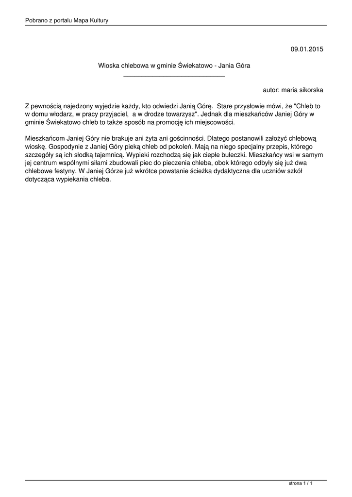 Pobrano z portalu Mapa Kultury 09.01.2015 Wioska chlebowa w gminie Świekatowo - Jania Góra ____________________________ autor: maria sikorska Z pewnością najedzony wyjedzie każdy, kto odwiedzi Janią Górę. Stare przysłowie mówi, że "Chleb to w domu włodarz, w pracy przyjaciel, a w drodze towarzysz". Jednak dla mieszkańców Janiej Góry w gminie Świekatowo chleb to także sposób na promocję ich miejscowości. Mieszkańcom Janiej Góry nie brakuje ani żyta ani gościnności. Dlatego postanowili założyć chlebową wioskę. Gospodynie z Janiej Góry pieką chleb od pokoleń. Mają na niego specjalny przepis, którego szczegóły są ich słodką tajemnicą. Wypieki rozchodzą się jak ciepłe bułeczki. Mieszkańcy wsi w samym jej centrum wspólnymi siłami zbudowali piec do pieczenia chleba, obok którego odbyły się już dwa chlebowe festyny. W Janiej Górze już wkrótce powstanie ścieżka dydaktyczna dla uczniów szkół dotycząca wypiekania chleba. strona 1 / 1