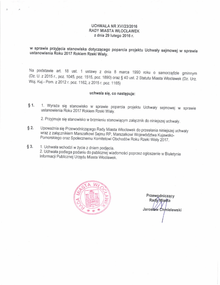 UCHWALA NR XVII23I2O16 RADY MIASTA WI.OCT.AWEK z dnia 29 lutego m16 r. w sprawie pzyiecia stanowiska dotyc.zqcego poparcia projektu Uchwary sejmowej w sprawie ustanowienia Roku 2017 Rokiem Rzeki Wisly-. Na podstawie art. 18 ust. 1 ustawy (Dz, u. 22015 r.' poz. 1045, poz. Woj. Kuj.- Pom. z 2012 r. poz. 1 z g dnia marca '1g90 roku o samozqdzie gminnym 1b15, poz. 1890) oraz g 40 ust. 2 statutu Miasta wrocrawek 162, z 2015 r. poz. 1 1 ior. uo. 65) uchwala sig, co nastepuje: $ 1' 1. .wyra2a sig stanowisko w sprawie poparcia projektu uchwaly sejmowej w ustanowienia Roku 2017 Rokiem Rzeki Wislv.' sprawie 2. Pzyjmuje sig stanowisko w bzmieniu stanowiqcym zalqcznik do niniejszej uchwaly. $2. -tP-1t:i!i?.'e.l".wodniczAcego wraz z zalqcznikiem Marszalkowi Rady Miasla Woclawek do pzeslania niniejszej uchwaly sejmu Rp, Marszarkowi wojew6dztwa xujarisiol -- "-' Pomorskiego oraz Sporecznemu Komitetowi obchodow ior<u'nzeri wisfu 2012. s3. 1 . Uchwala wchod zi w 2ycie z dniem podjgcia . 2 podlega podaniu do pubriiznejwiadomosci popzez ogloszenie w Biuretynie .Uchwala Informacji Publicznej Ueedu Miasta Wociawek. @) Zal4cznik do Uchwaly Nr XVt/23/2016 Rady Miasta Woclawek z dnia 29 iutego 2016 t. Stanowisko w sprawie poparcia projektu Uchwaty sejmowej w sprawie ustanowienia Roku 2017 Rokiem RzekiWisly. Rada Miasta wfoclawek wyra2a swoje poparcie dra projektu Uchwaly sejmowej w sprawre ustanowienia Roku 20 j 7 Rokiem Rzeki Wisly. Inicjatywa uczczenia 550 rocznicy pienvszego w historii Polski wolnego flisu na Wisle ma na celu pzypomnienie i docenienie znaczenia Wisly w 2yciu naszego kraju. wisla jest waznym ekonomicznie i turystycznie erementem rozwoju, waZnq wsp6rnq spraw4 Dlatego te2 Rada Miasta Woclawek wyraZa poparcie dla inicjatywy rewrtalizacji wislanego szlaku wodnego, kt6ra jest spojna z podejmowanymi od 2009 roku pzejawa dzralaniami rewitarizacyjnymi. sig to realizaciq programu rewitarizacji centrum miasta pn. ,,Ku wi5re", kt6rego gl6wnym zalozeniem rozwdj spoleczno-gospodarczy Sr6dmie6cia Woclawka oraz poprawa yest warunk6w Zycia mieszkaricow. w ramach ww. dzialarl zrewitalizowano we woclawku m. in. bulwary im. J. pilsudskiego, centrum Kultury Browar ,,8", starq Remizg, pzystan na Zarewie wisranym pzystari r na zece u uiscia Zglowiqczki. Rada Miasta wocrawek uwa2a r6wniez, i2 koniczna jest darsza reguracja zeki wisly. Dra poprawy bezpieczeistwa mieszkaric6w woclawka i regionu kujawsko-pomorskiego konieczna iest budowa kolejnego stopnia wodnego w okolicach Ciechocinka. Pzylqczaiqc sig do tak cennej inicjatywy spolecznej, Rada Miasta woclawek zywi pzekonanie, i2 Rok Rzeki Wisly stanie sig wspolnq platformq dzialai wokdl kwestii rewitalizacji wi6lanego szlaku woonego 0raz przywr6cenia swietnosci, znaczenia i nalezytej rangi Krolowej polskich Rzek popzez programy' projekty i uroczystosci organizowane pzez oqany zqdowe, samozqdowe, organizacje pozarzEdowe ispolecznosci rokarne w ramach obchod6w Roku 20,17 Rokiem Rzeki wisly, 1'1!ti,lACY r.MS il