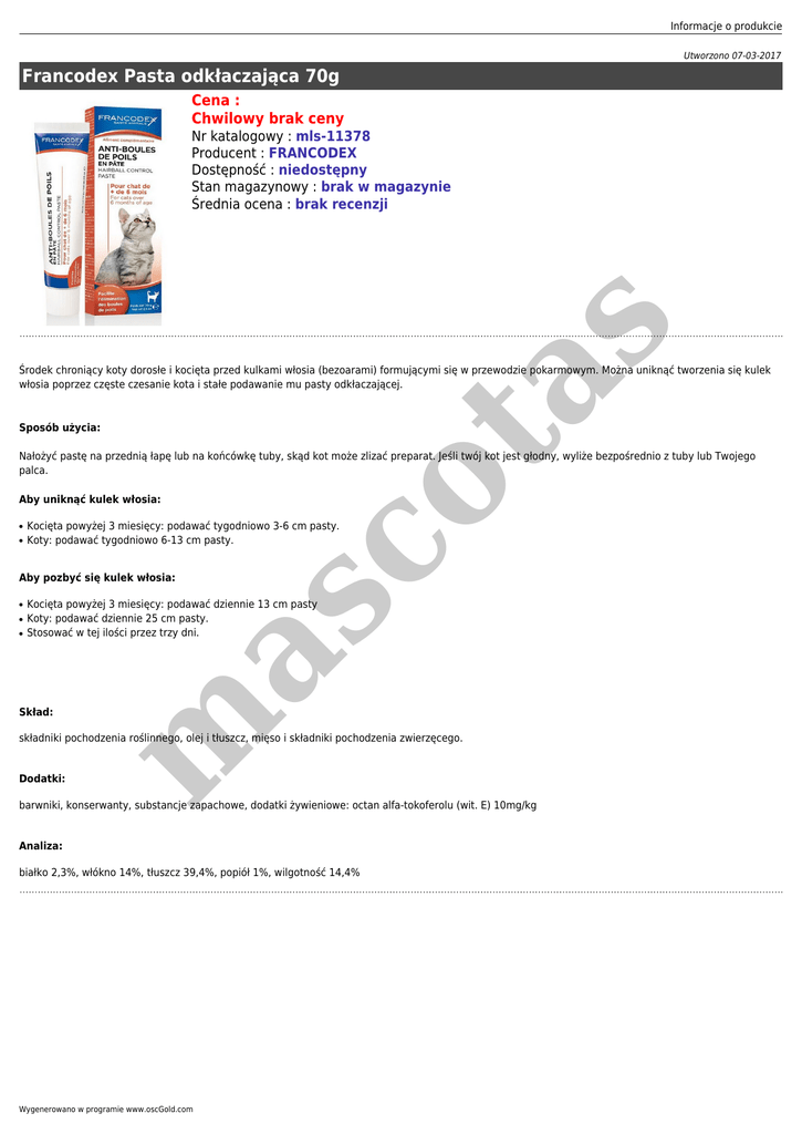Informacje o produkcie Utworzono 07-03-2017 Francodex Pasta odkłaczająca 70g Cena : Chwilowy brak ceny s Nr katalogowy : mls-11378 Producent : FRANCODEX Dostępność : niedostępny Stan magazynowy : brak w magazynie Średnia ocena : brak recenzji Sposób użycia: co ta Środek chroniący koty dorosłe i kocięta przed kulkami włosia (bezoarami) formującymi się w przewodzie pokarmowym. Można uniknąć tworzenia się kulek włosia poprzez częste czesanie kota i stałe podawanie mu pasty odkłaczającej. Nałożyć pastę na przednią łapę lub na końcówkę tuby, skąd kot może zlizać preparat. Jeśli twój kot jest głodny, wyliże bezpośrednio z tuby lub Twojego palca. Aby uniknąć kulek włosia: ● ● Kocięta powyżej 3 miesięcy: podawać tygodniowo 3-6 cm pasty. Koty: podawać tygodniowo 6-13 cm pasty. Aby pozbyć się kulek włosia: ● ● Kocięta powyżej 3 miesięcy: podawać dziennie 13 cm pasty Koty: podawać dziennie 25 cm pasty. Stosować w tej ilości przez trzy dni. m as ● Skład: składniki pochodzenia roślinnego, olej i tłuszcz, mięso i składniki pochodzenia zwierzęcego. Dodatki: barwniki, konserwanty, substancje zapachowe, dodatki żywieniowe: octan alfa-tokoferolu (wit. E) 10mg/kg Analiza: białko 2,3%, włókno 14%, tłuszcz 39,4%, popiół 1%, wilgotność 14,4% Wygenerowano w programie www.oscGold.com